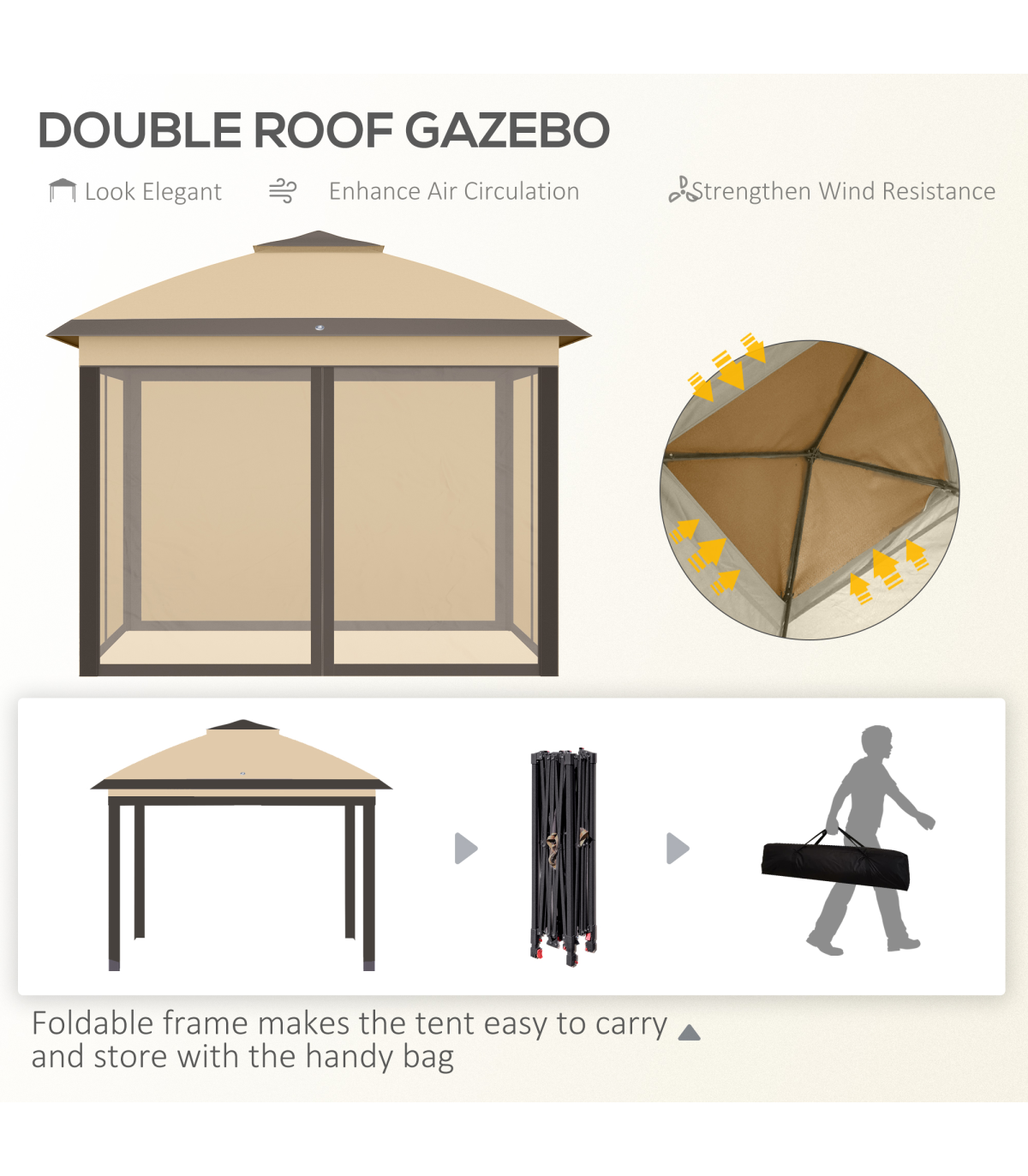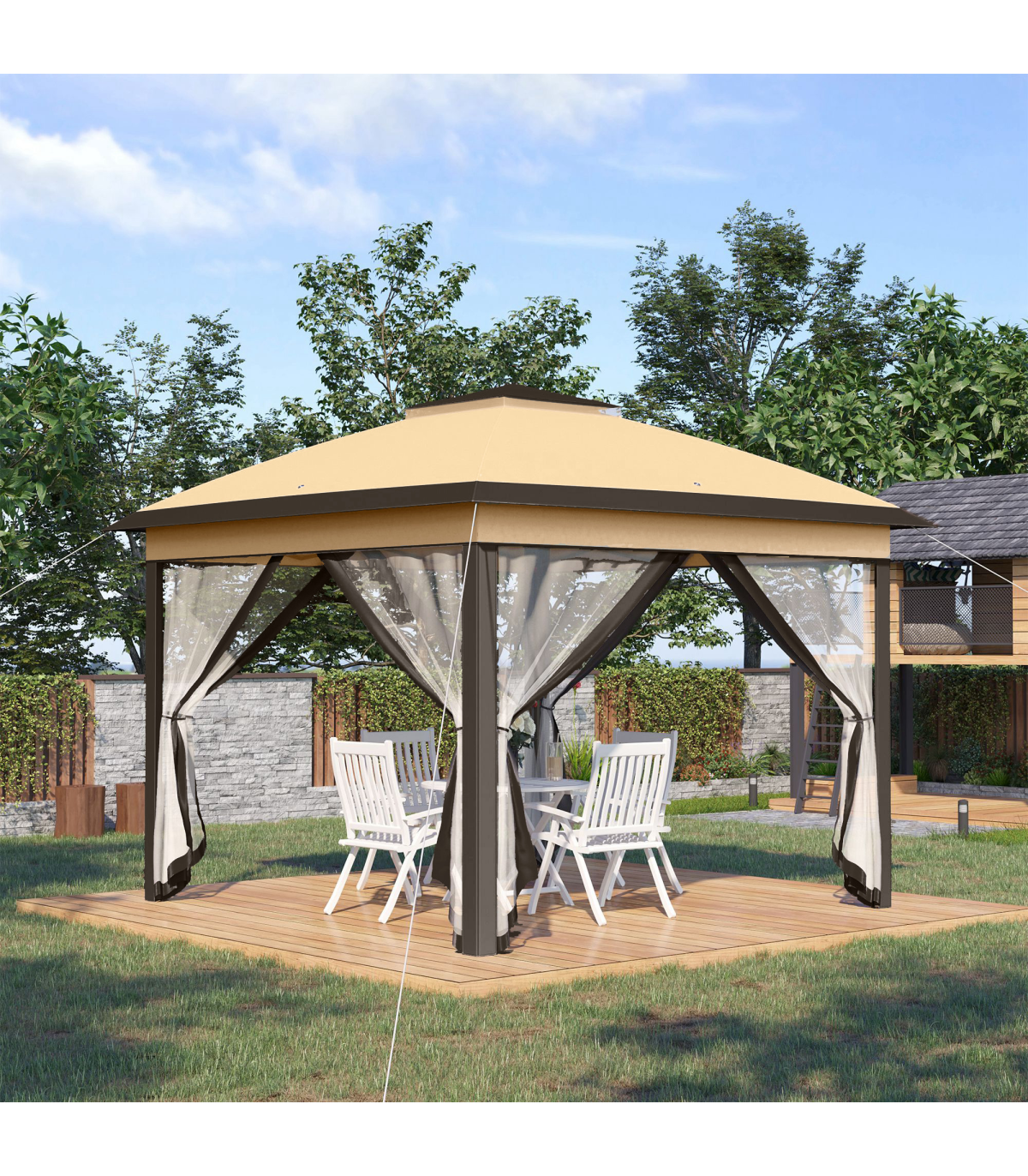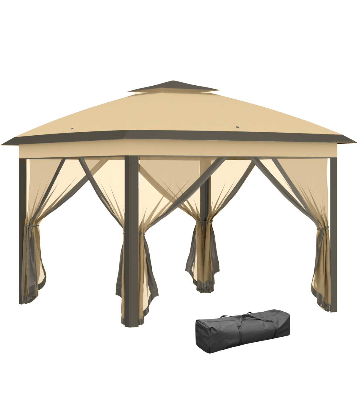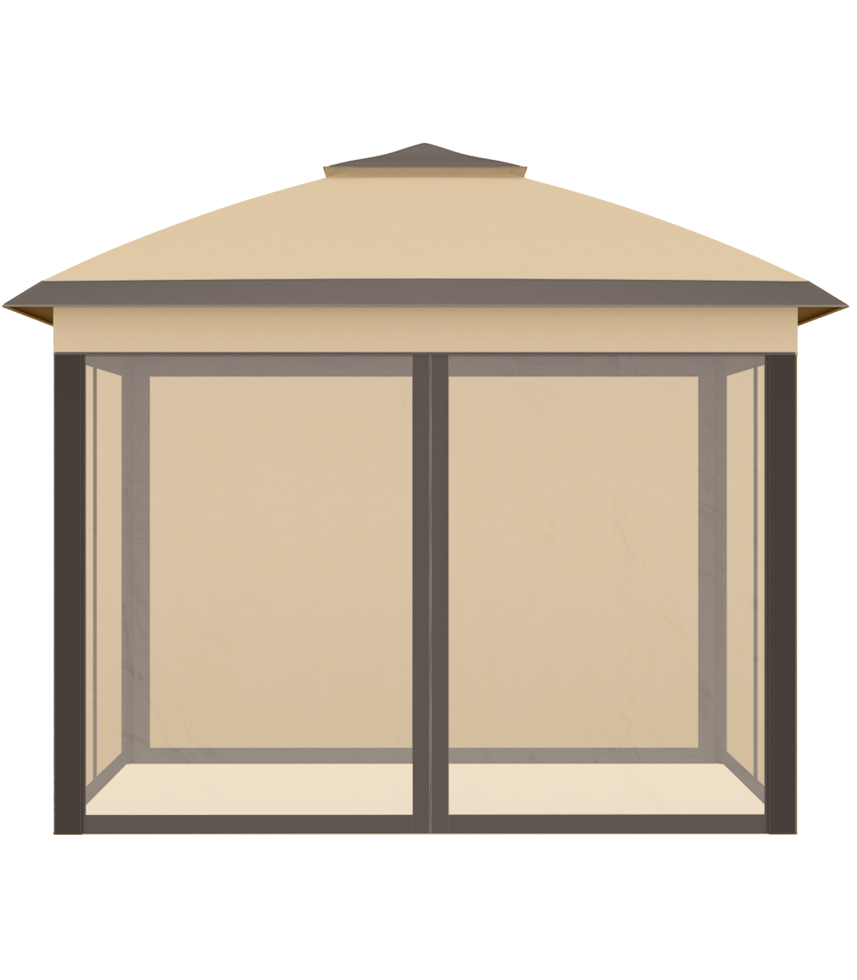 simply unfold the frame, cover it with the canopy, select the best of three heights, mount it to the ground, and you're ready to go. Complete with a carrying bag so you can bring it anywhere, transport and tear down are just as easy set-up.Pop-Up Shade: The two-tier double roof of this gazebo tent redirects airflow. The included guy ropes and support stakes can be used to mount it to soft ground. The extended canopy top not only provides you with 116.6 square feet of shaded space, but with help from its drainage holes on top, the outdoor canopy also keeps your backyard sitting space dry and free of unwanted water.Outdoor Canopy with Netting: Use the breathable mesh netting sidewalls of our pop-up canopy tent to enjoy the breeze without any rude winged intruders. Let the good in