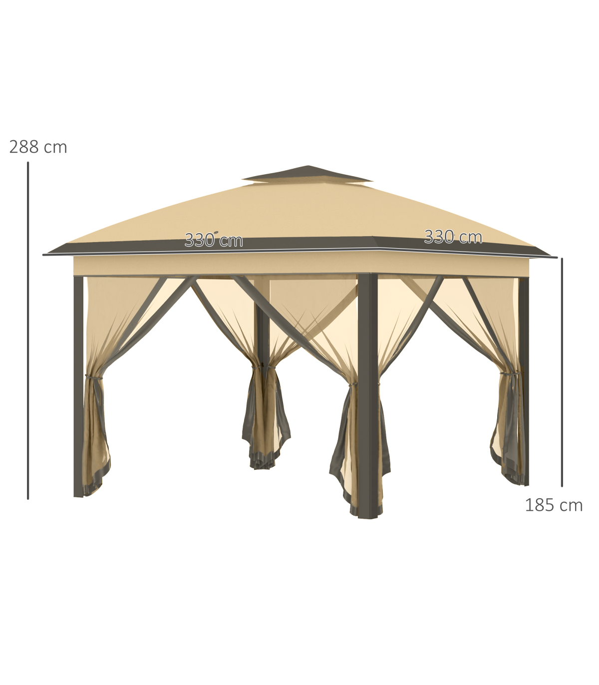 keep the bad out. For extra protection against pesky threats, the roof vent of our pop-up gazebo features a mesh, too (four zipper mesh netting included).Made with Outdoor in Mind: Our easy up canopy is constructed of PA-coated oxford cloth and is supported by a powder-coated steel frame. Both materials are weatherized and selected so you can get the most out of your gazebo when you need it.Camping Canopy Info: Overall Dimensions: 330L x 330W x 288Hcm. Folded Dimensions: 21.5L x 21.5W x 116Hcm.