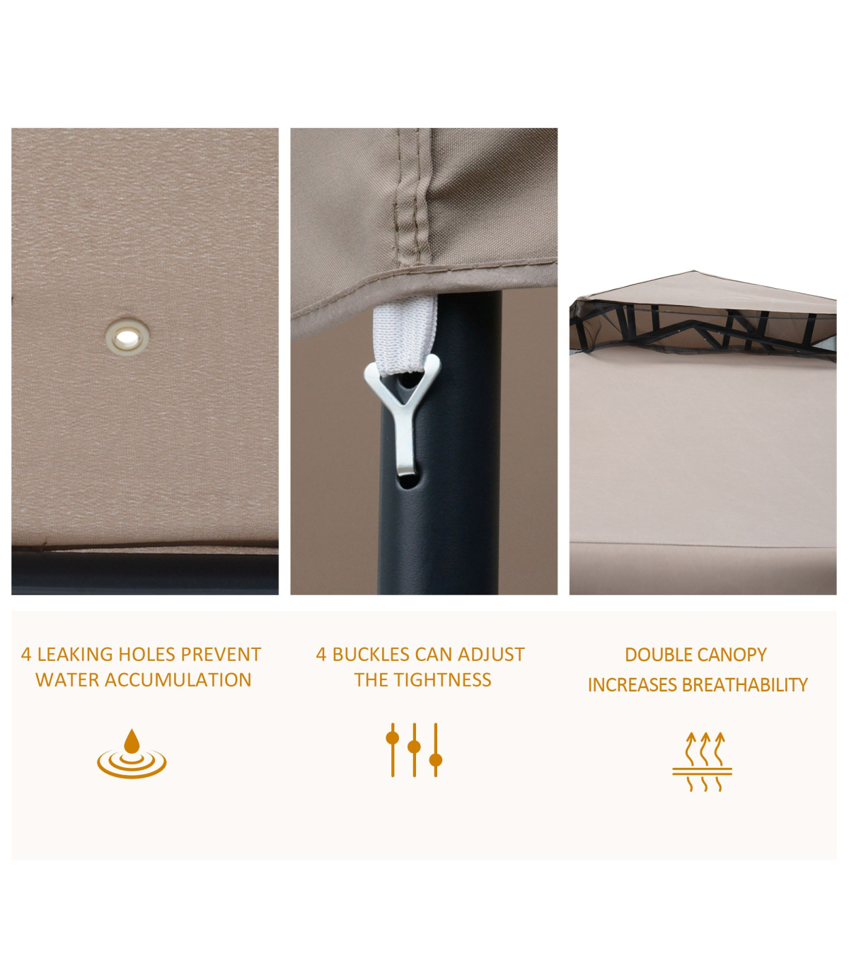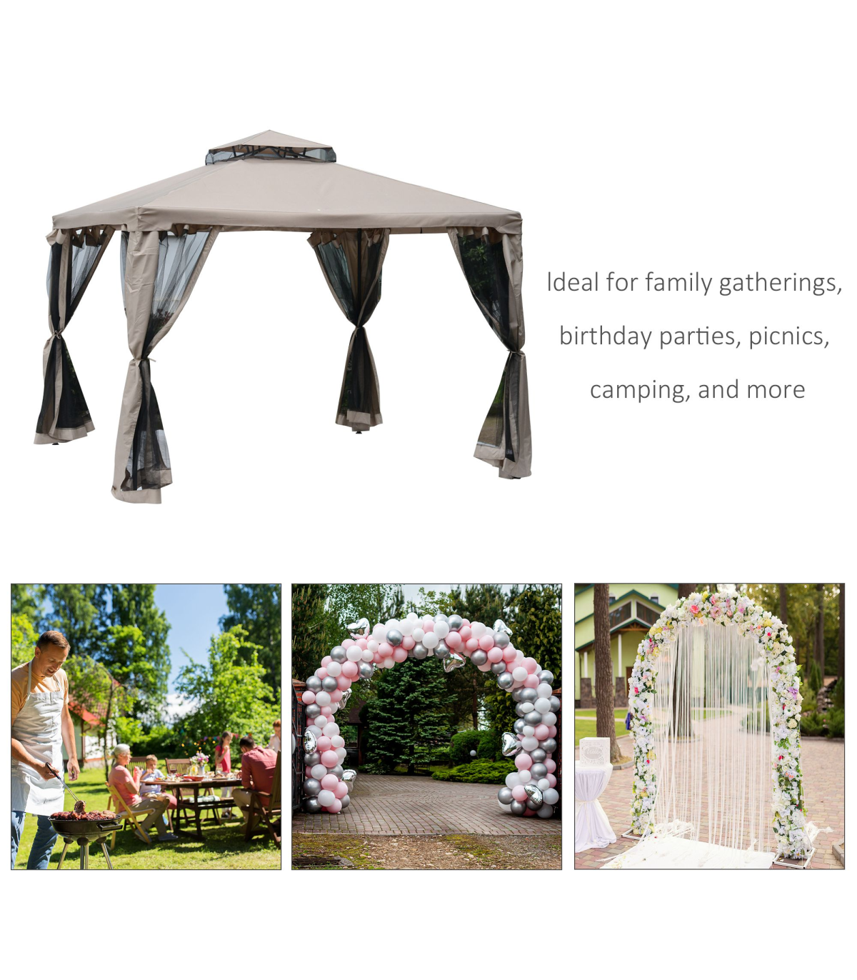 Features: Durable polyester fabric to block harmless UV, ideal to protect you from searing sunlight. Well-designed 2 tier roof with mosquito netting, perfect for air circulation and protect against bugs. 4 built-in grommets help ensure proper water drainage Tightness adjustable top canopy help ensure proper water drainage Come with mosquito netting, keep you from mosquito and other insects disturbing Powder coated strong metal frame, sturdy enough to provide secure space for gatherings. Designed to provide cool place for outdoor parties, family picnic, camping, barbecues and social gathering 8 stakes and 4 guy ropes included for added stability. Intubation connection, easy to assemble and take down Note: Please make sure the gazebo will not be left outside under any bad weathers as rains or wind may buckle the roof to destroy it.