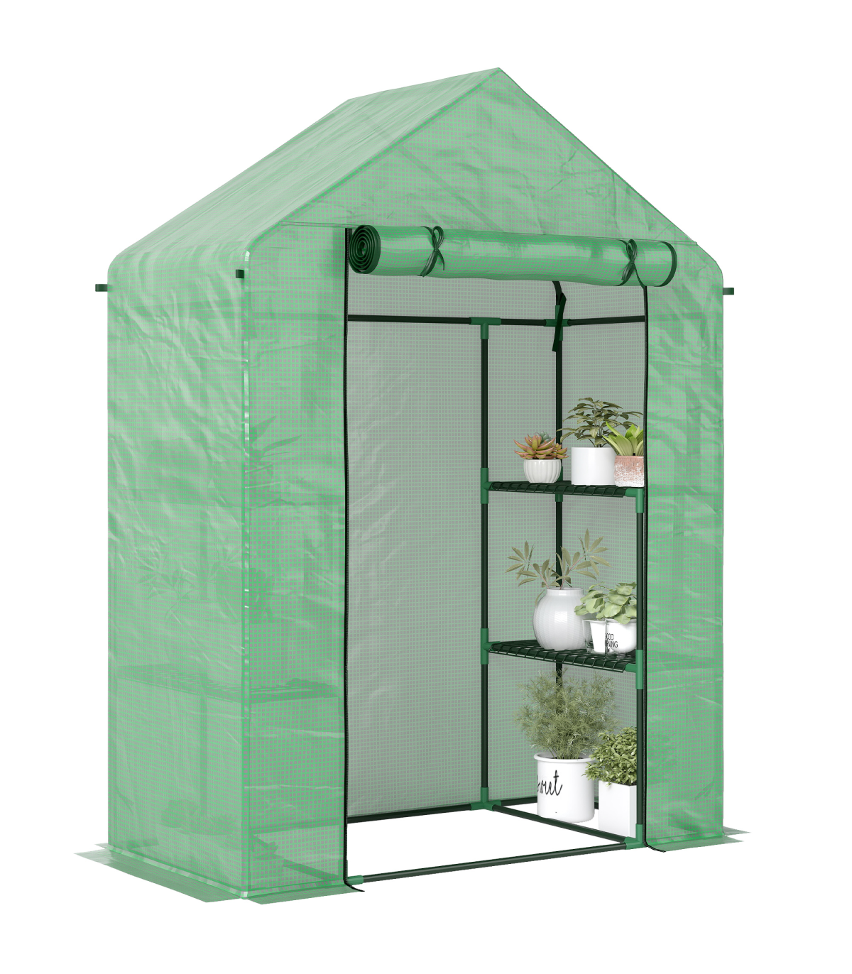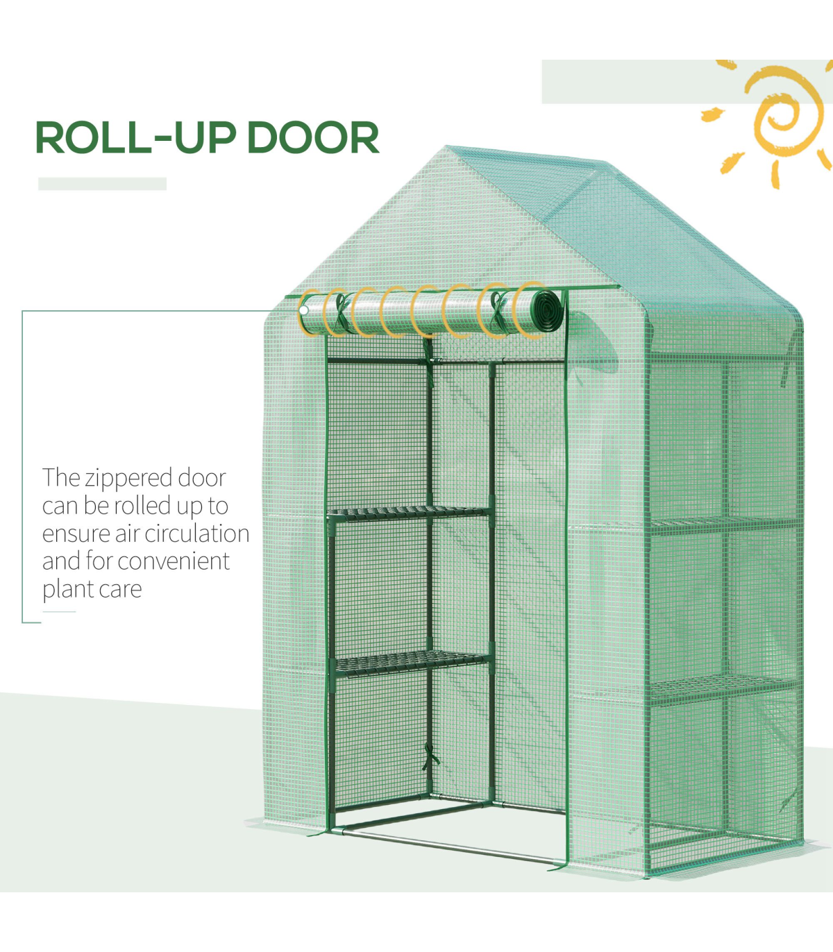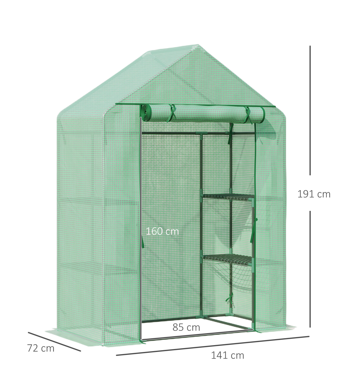 WalkIn Greenhouse 2 Tier Shelf, Roll-Up Door, PE Cover, 141x72x191cm, Green
