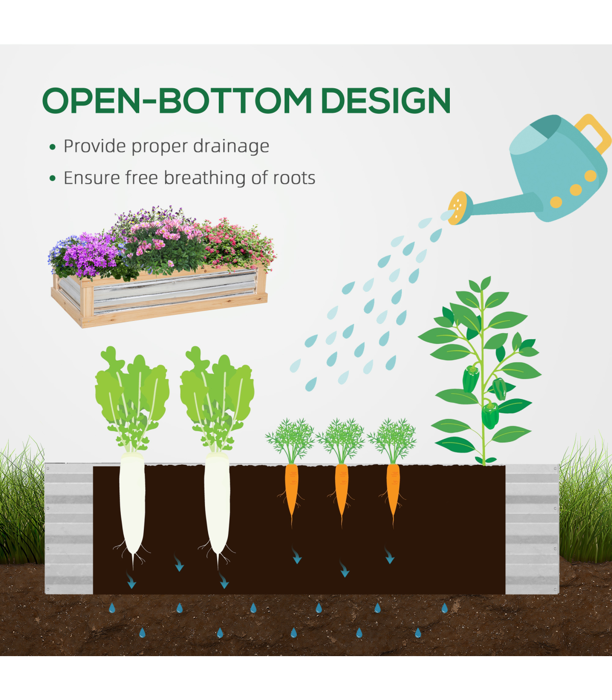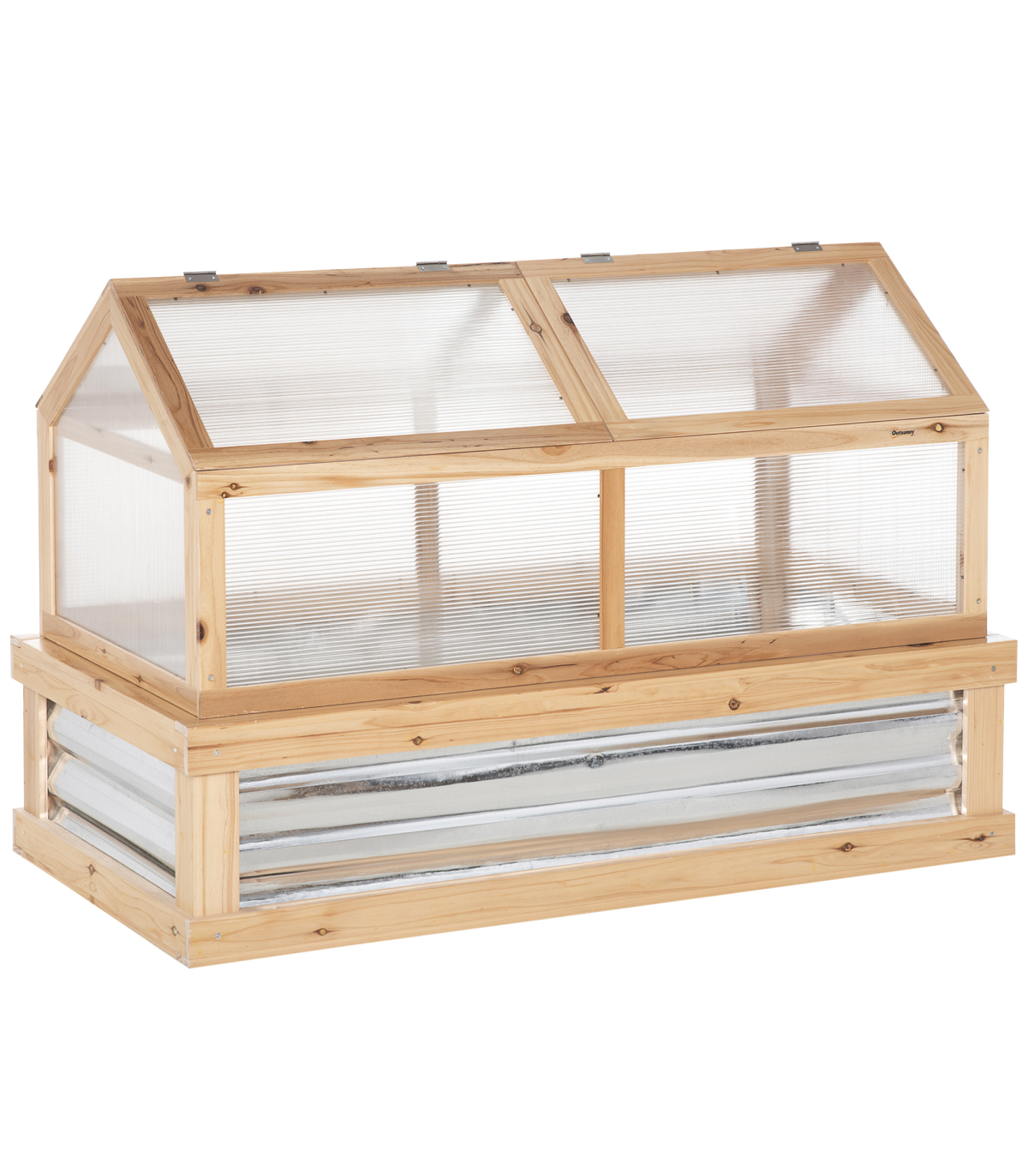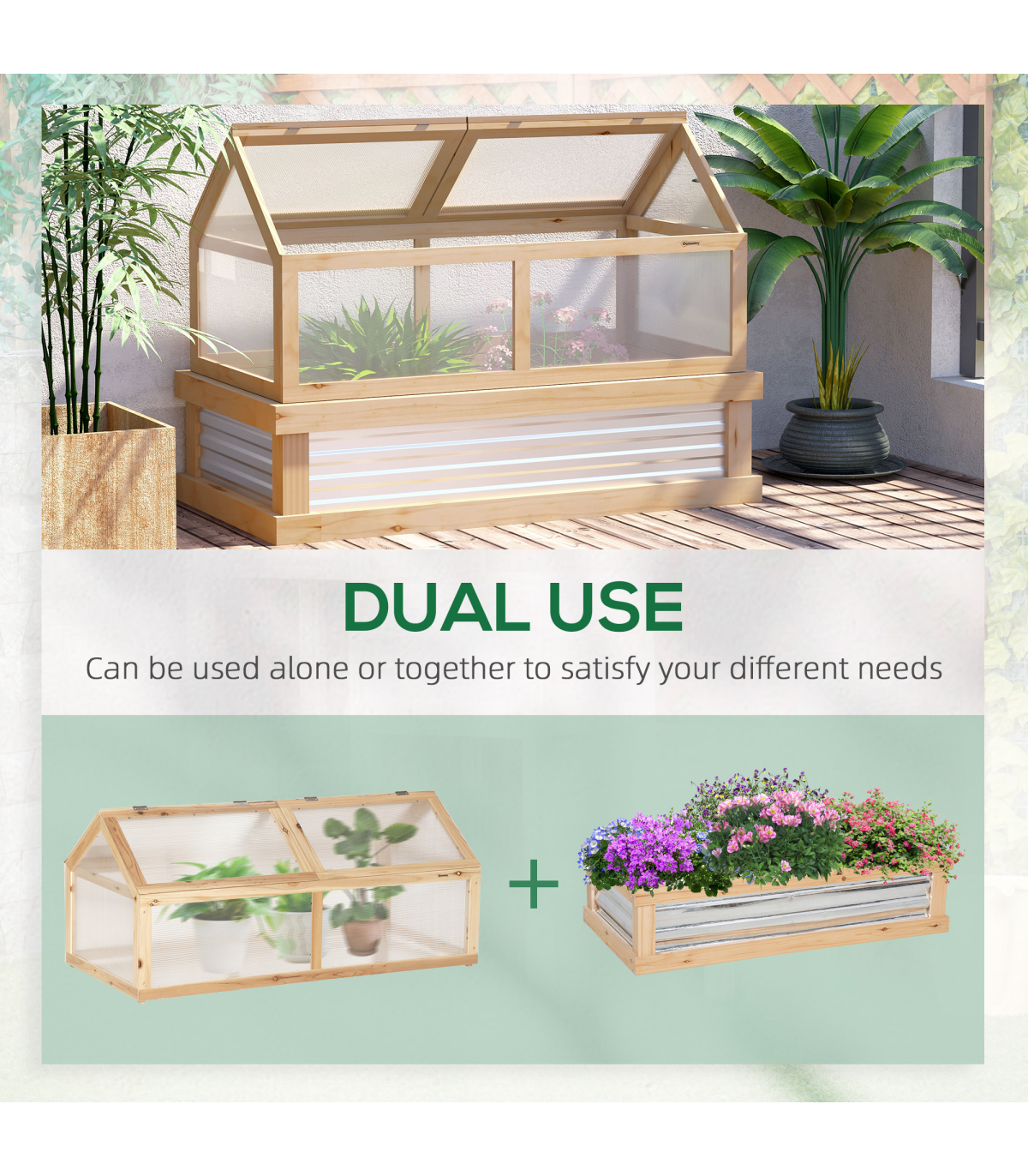 This Outsunny two-part greenhouse gives you double the room to grow plants to their best. 1) The top cold frame gives plants, flowers and more a safe shelter thanks to the polycarbonate panels, protecting from light weather whilst allowing sunlight through. 2) the bottom half provides open display, with the metal lining helping to attract and trap heat inside to promote growth. Whether your growing space is compact or generous, you can grow with this handy wooden frame.