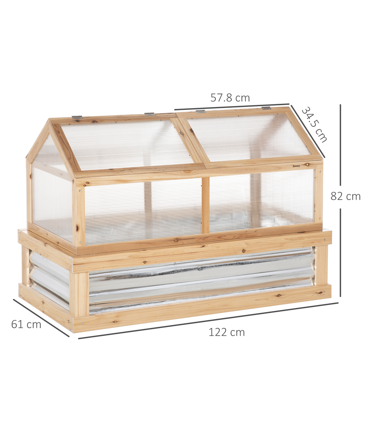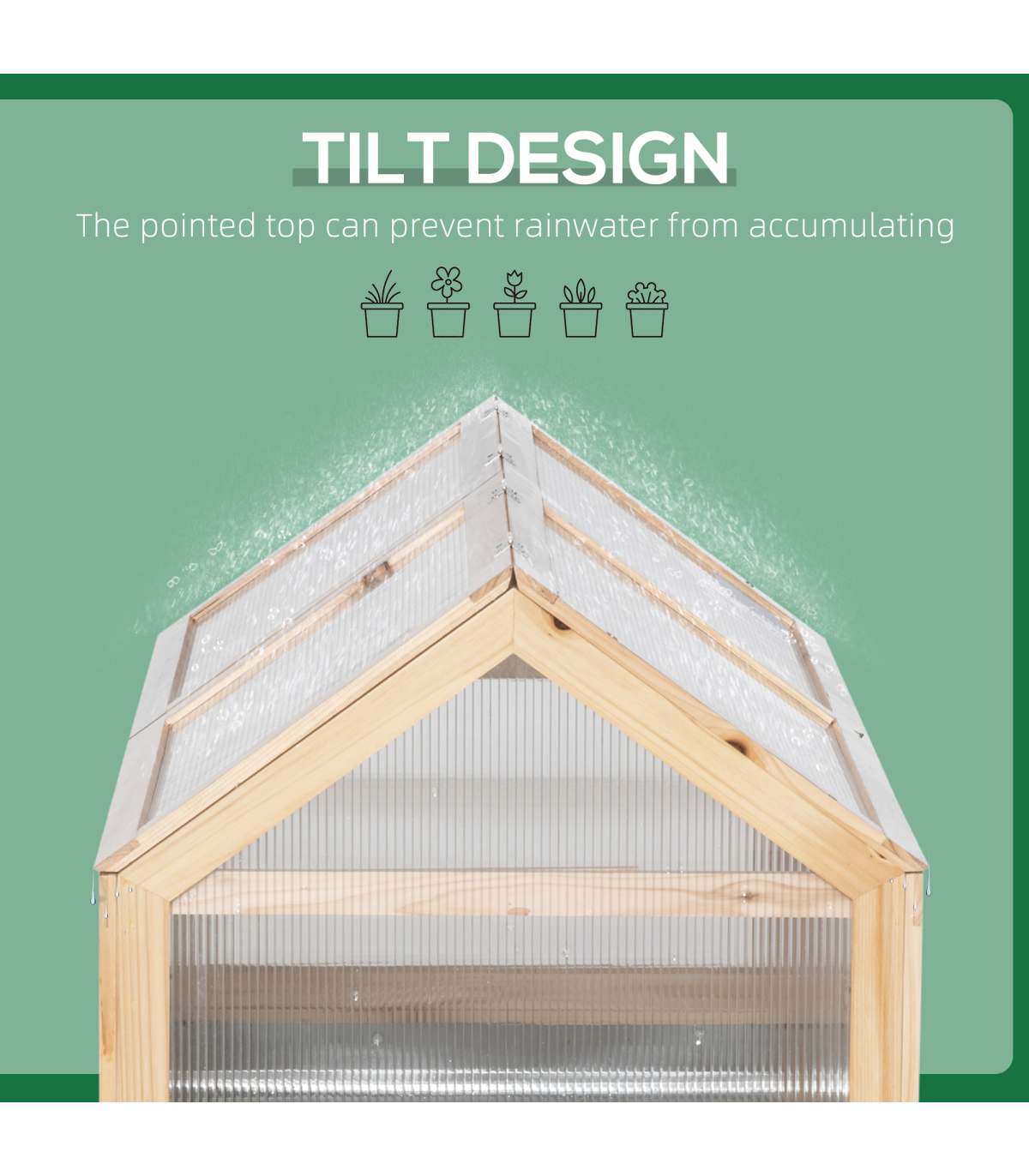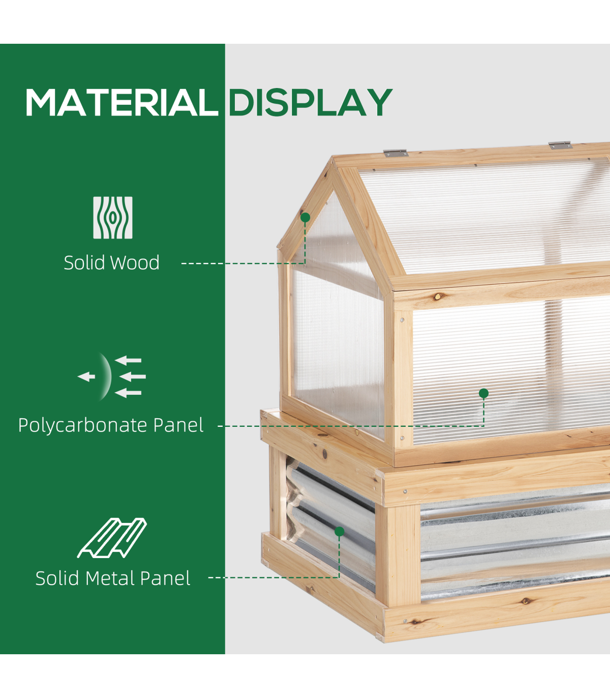 Transparent polycarbonate boards protect upper whilst letting sunlight pass through Openable rood, easy to access inside. Sloped shape prevents water build-up Hardwood frame is strong and sturdy Bottom part with metal to draw in heat - great for promoting growth Assembly required