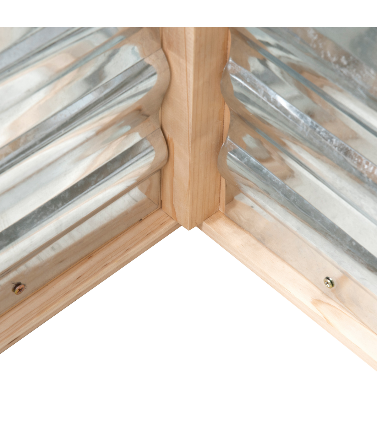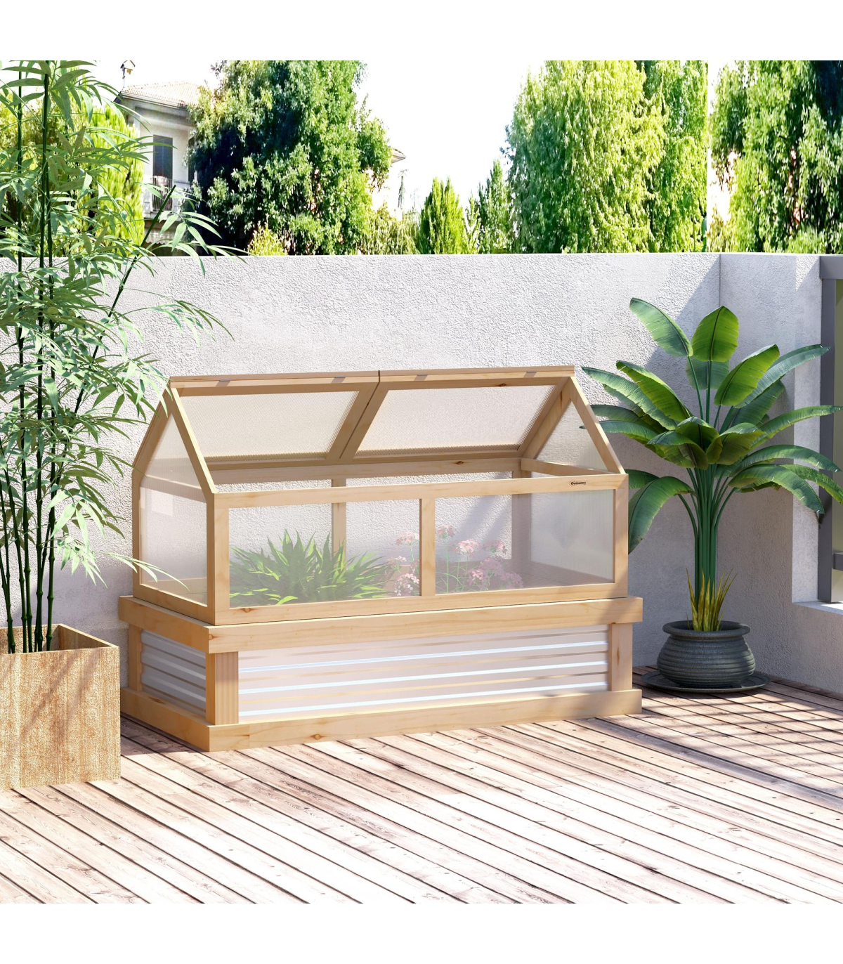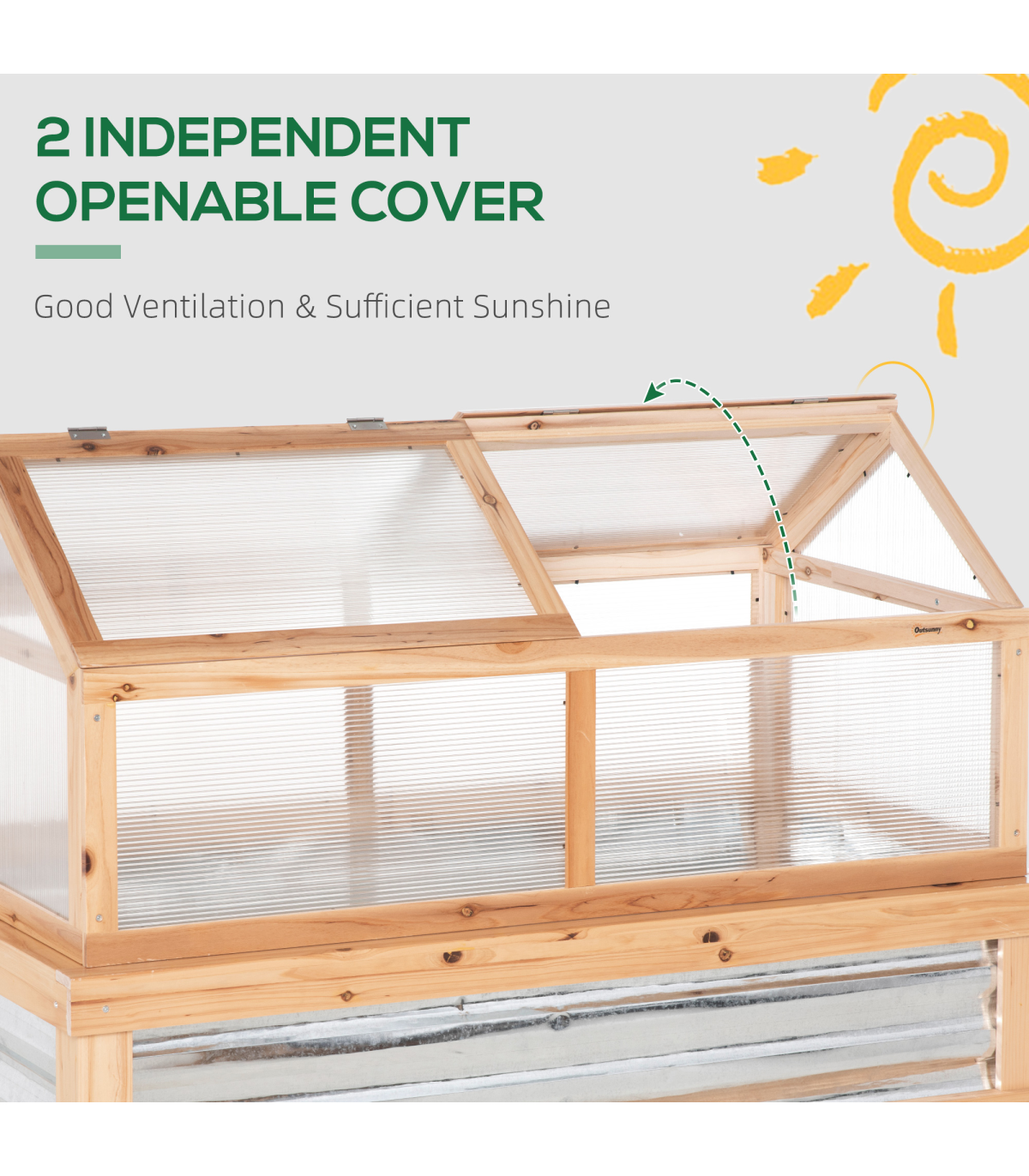 Transparent polycarbonate boards protect upper whilst letting sunlight pass through Openable rood, easy to access inside. Sloped shape prevents water build-up Hardwood frame is strong and sturdy Bottom part with metal to draw in heat - great for promoting growth Assembly required