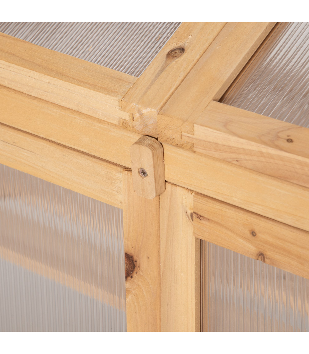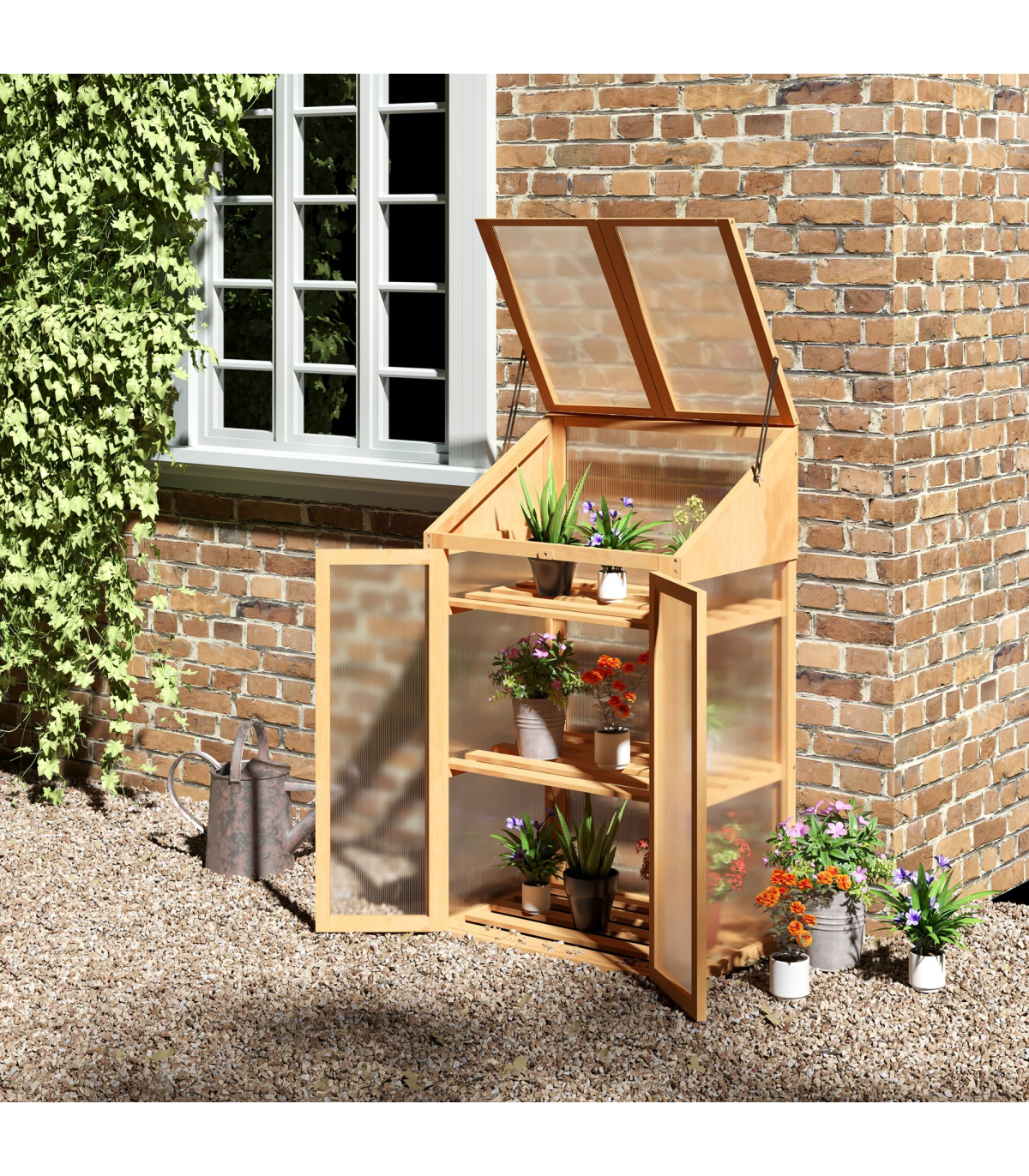 This cold frame greenhouse, from Outsunny, is a great choice to care for your plants. Solid fir wood frame for reliability. Transparent polycarbonate panels allow maximum light transmission, whilst retaining heat for early seed sprouting or for protecting plants late in the season. Features three removable shelves for organising plants. This plant grow house creates an ideal-temperature environment, so plants can grow healthily.