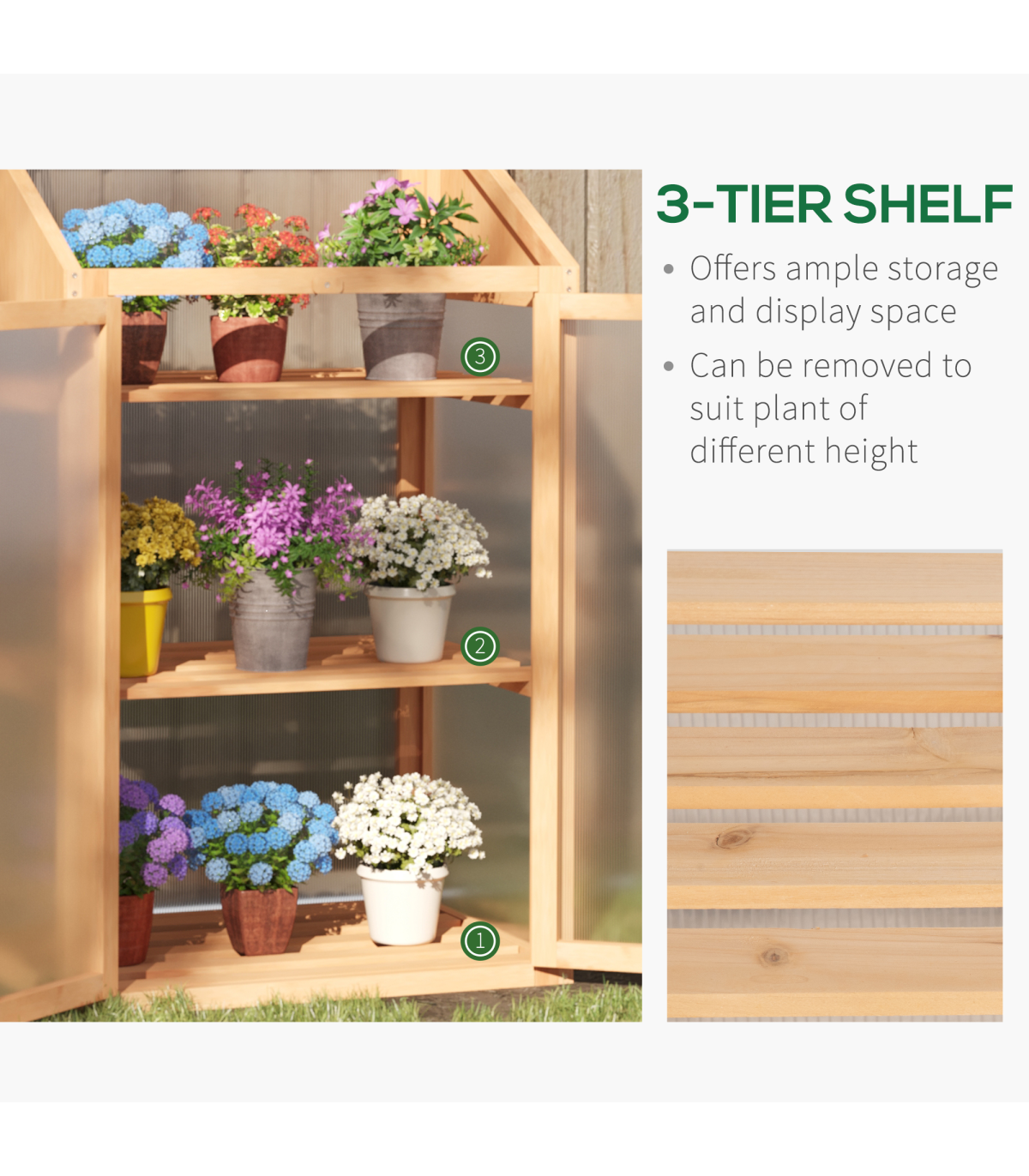 Polycarbonate window panels create shelter Top windows open for ventilation Double door design to enter inside easily - latch lock for security Three inner shelves to hold lots of plants, vegetables, pots and more. Can be removed Solid fir wood frame with treated surface for durability The shelves can be removed to suit plants of different height Assembly required
