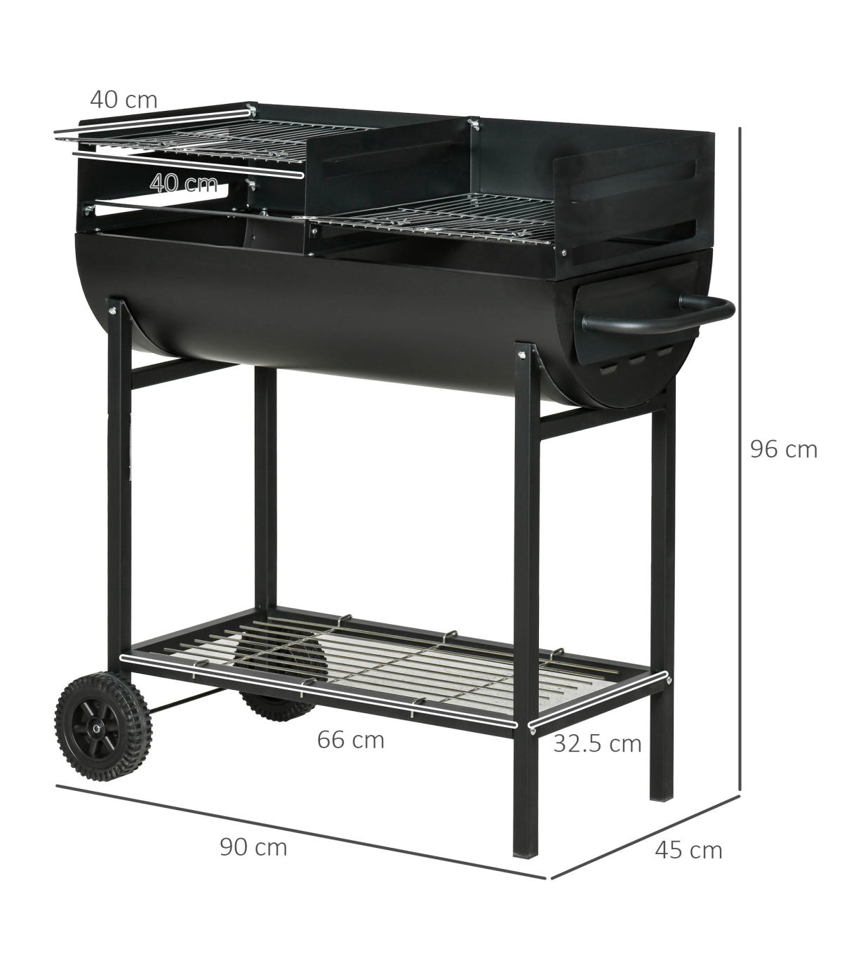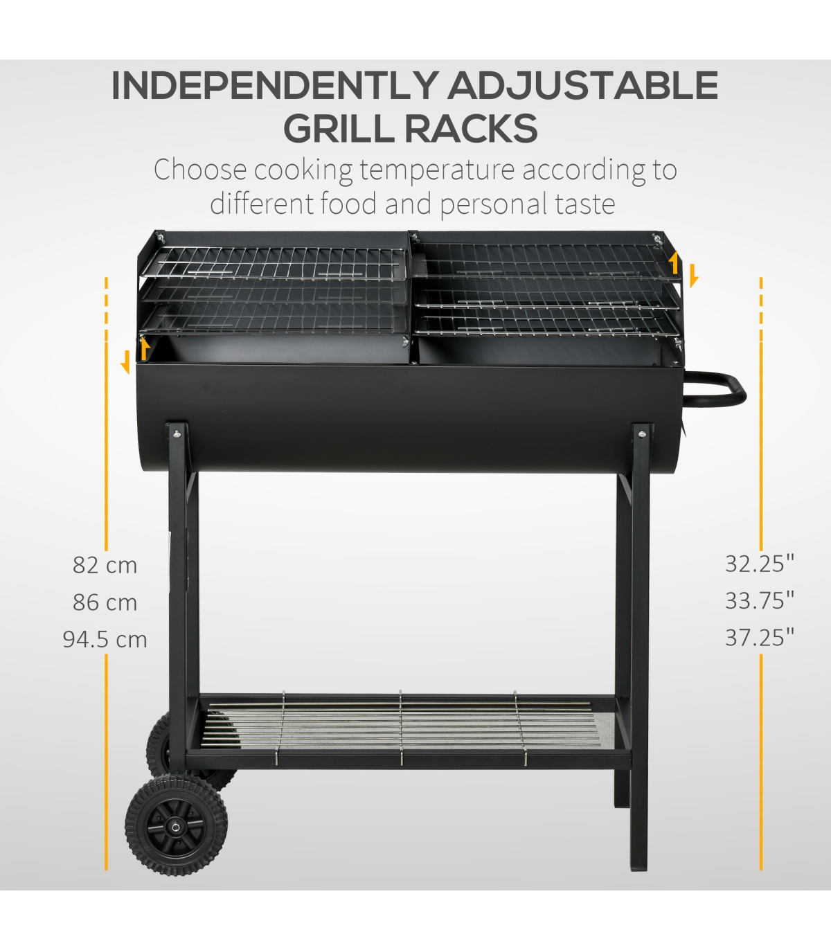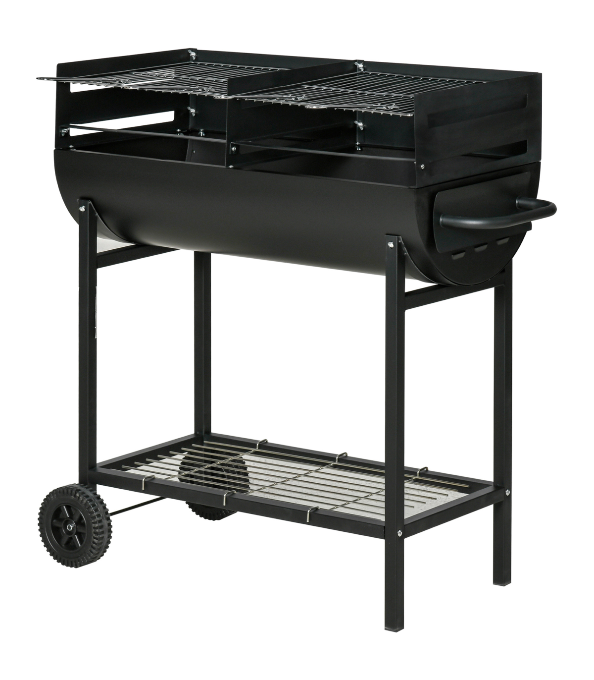 Features two separate grilling areas, allowing you to cook food quicker Two plastic wheels to move around easily without damaging body Adjustable height (82/86/94.5cm) to set to a safe cooking level Mesh bottom shelf for easy and convenient storage Food grade materials are used for the grill racks Maximum load 10kg, assembly required