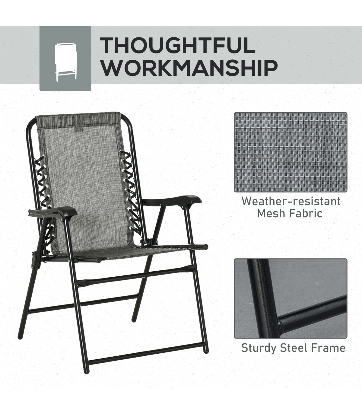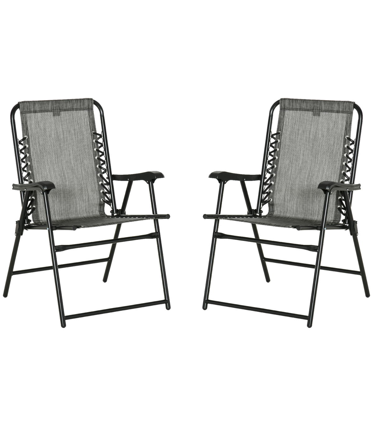 This two-piece outdoor folding chair set from Outsunny is ideal for any gathering, both indoor and outdoor. The chairs are made from heavy-duty steel, with powder-coated for extra strength. Mesh fabric seat holds your body comfortably, the high back and armrests give you support. Lightweight and foldable design is easy to carry and store. Spend no time to assemble and enjoy.