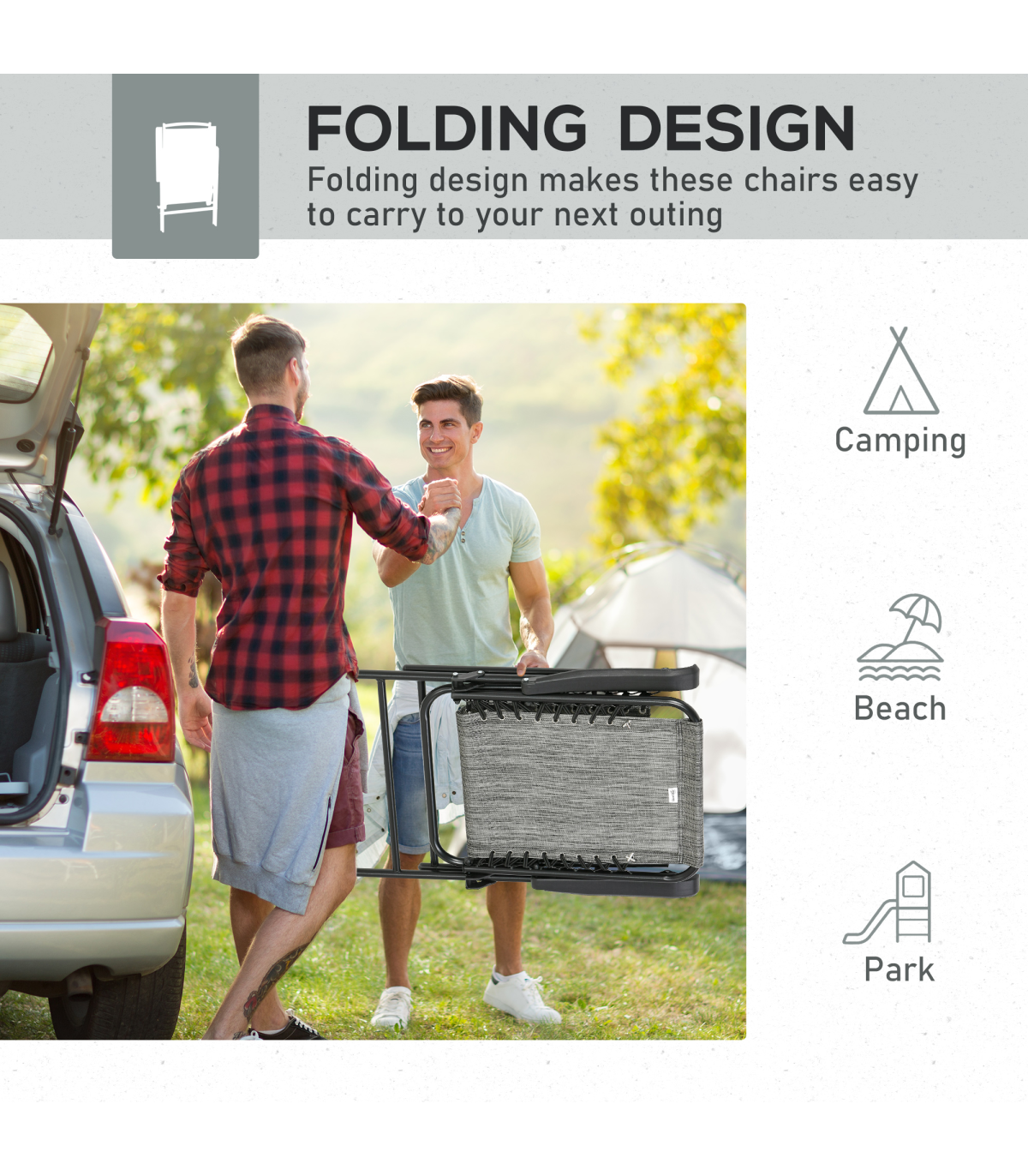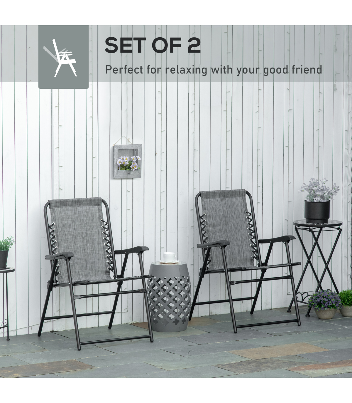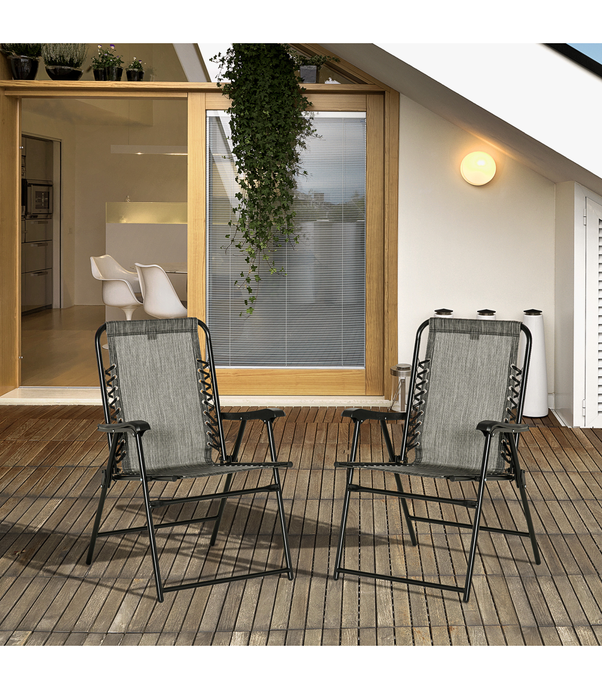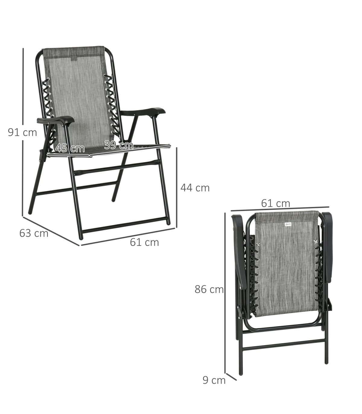Set of relax to lounge with a friend Powder coated steel frame is strong and supportive Foldable design, easy to carry and store Anti-slip feet pads to keep the chair in place No assembly required