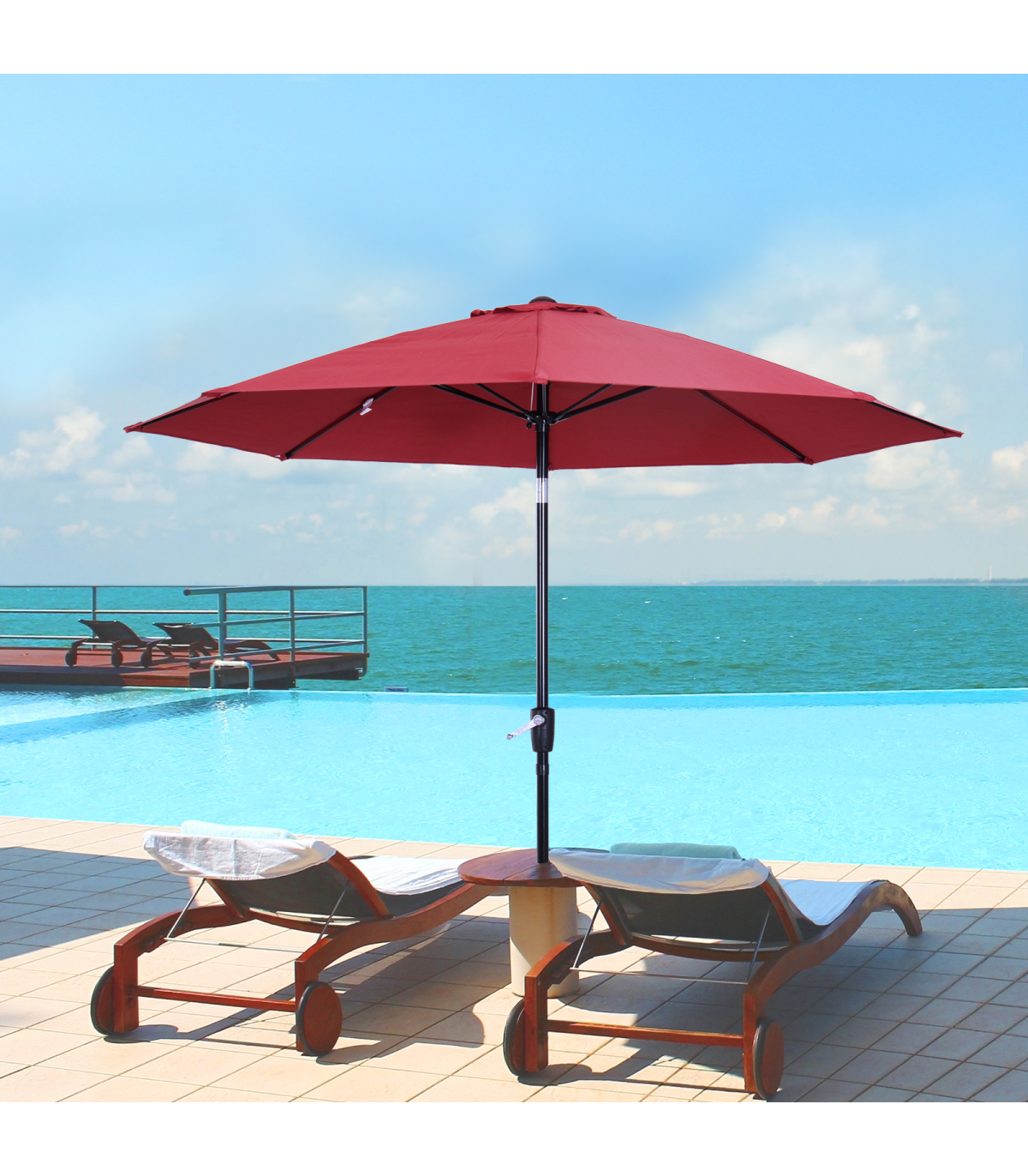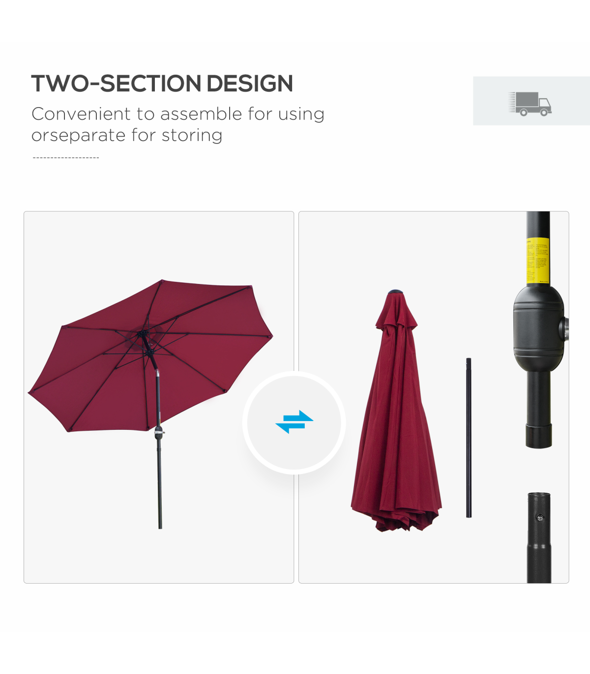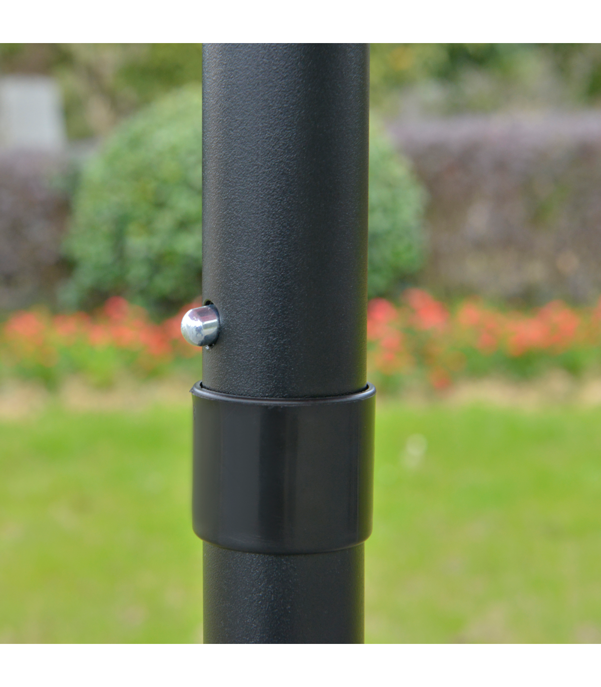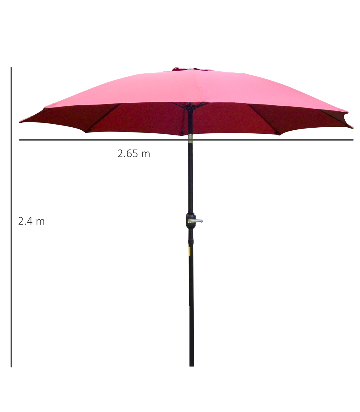 2.65m diameter canopy suitable for up to six people Powder coated aluminium pole is strong, with 8 ribs supporting the canopy connection Crank handle - easy to open and close the canopy Three different canopy angles - easy to fix Fade and weather resistant canopy protects against sun and light weathering. Do not leave in Base is not included. Assembly Required