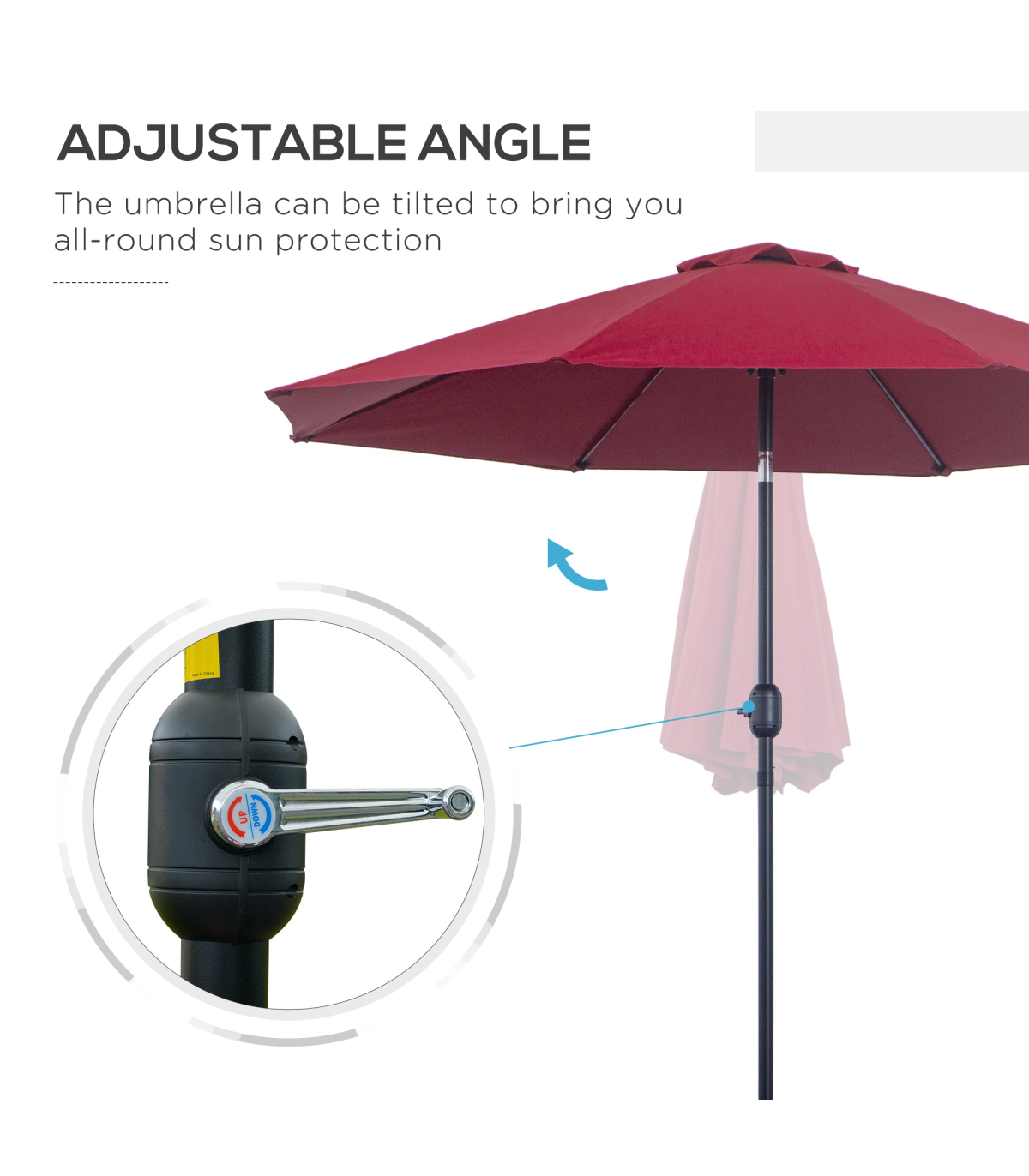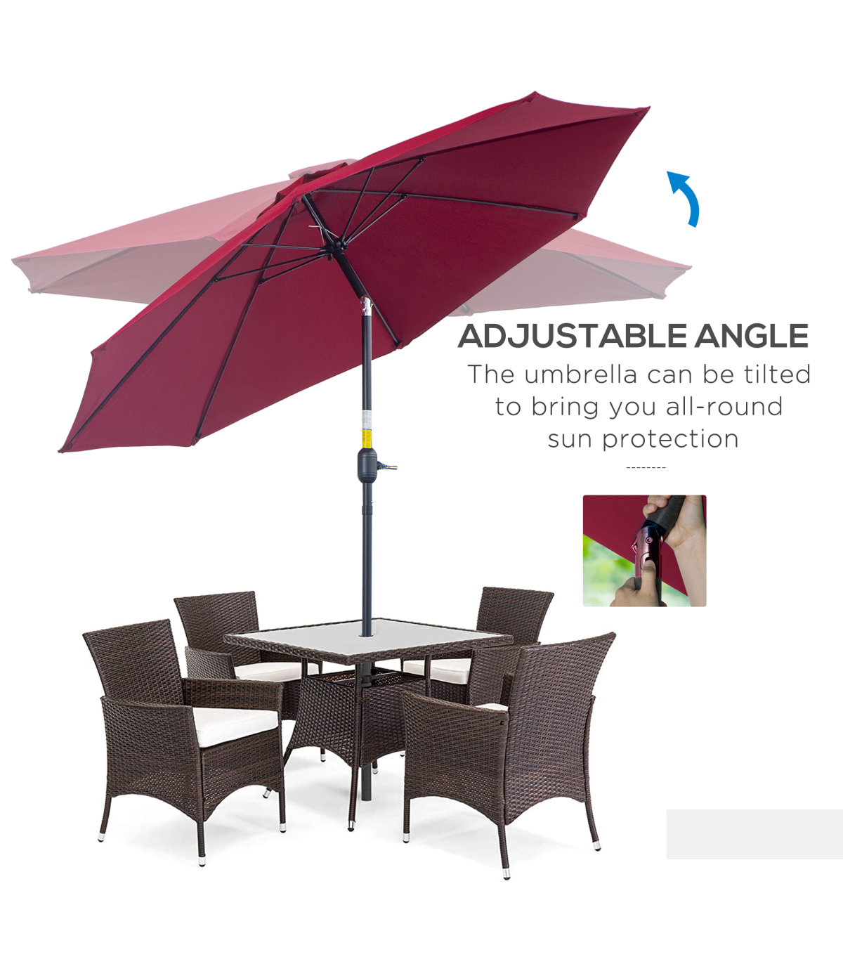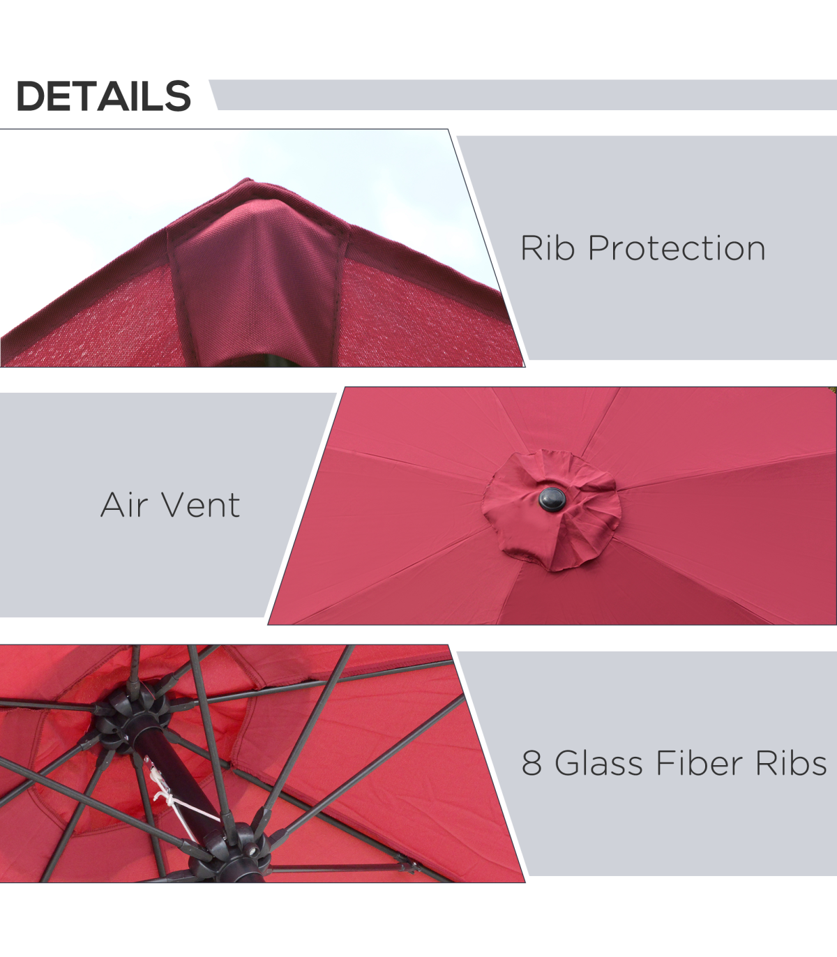 Summer shades the classic way - this Outsunny sun parasol. An aluminium frame makes the core structure strong, with 8 additional ribs connecting to the canopy for extra support. The ?2.65m canopy protects you from direct sunlight and light showers - the outdoor parasol's large size creates cover for you and five other guests. The canopy can be easily tilted to keep you protected in different ways. And to complete, pair with an Outsunny base, heavier than 25kg.
