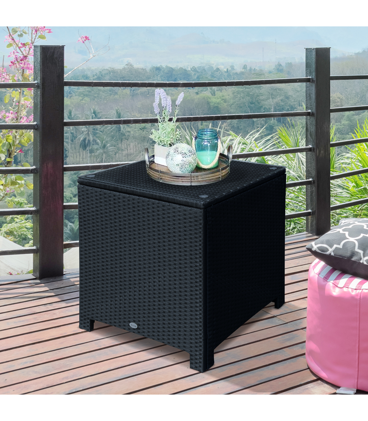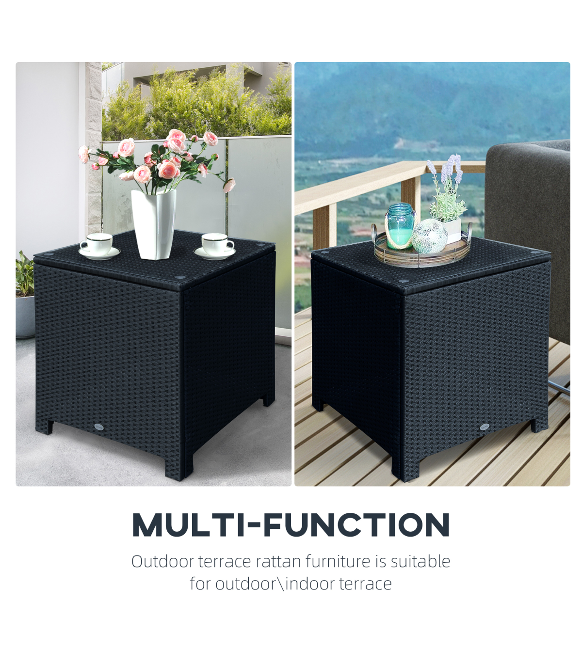 Outsunny Rattan Side Table Patio Frame Tempered Glass Outdoor Wicker-Black