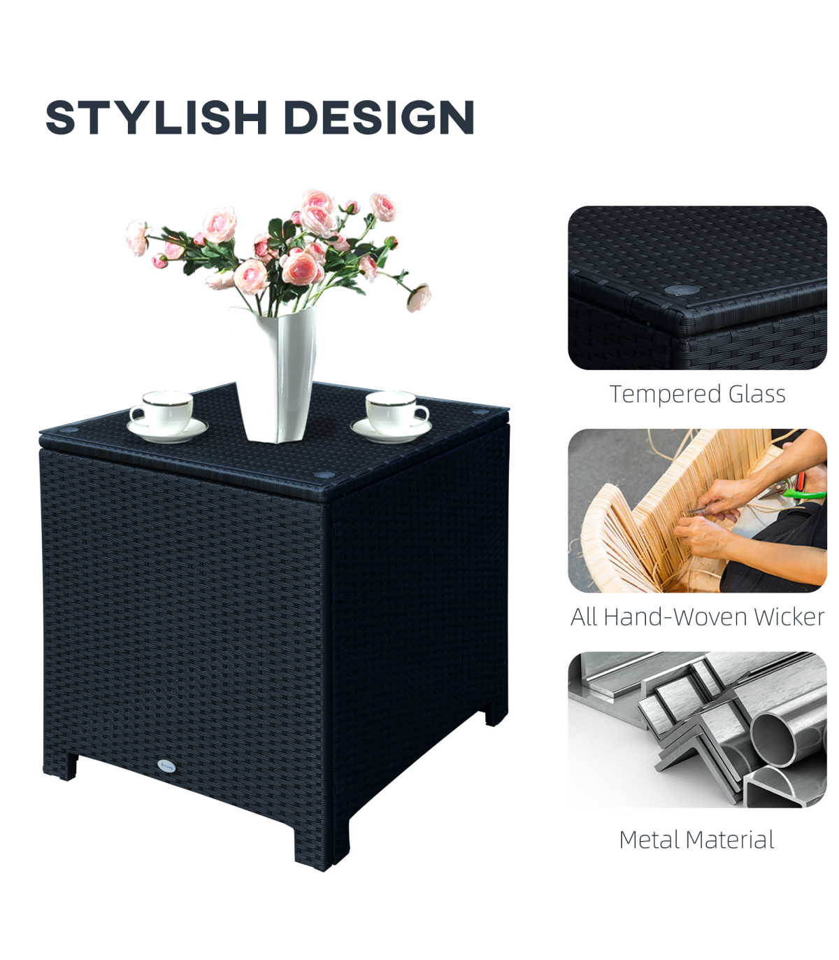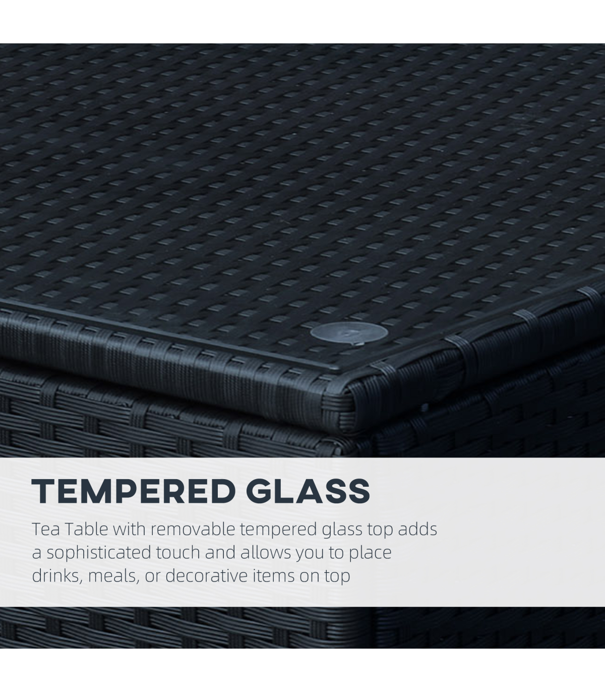 Stylish mixed-black design for a timeless look in your home Rust-resistant powder coated frame for a solid and stable base PE wicker rattan is protected against mild weather damage and can be wiped clean easily 5mm thick tempered glass top for a sleek and beautiful look Four legs with foot pads, protects the floor and bottom of table Can be matched with 860-031GY and 841-008V70
