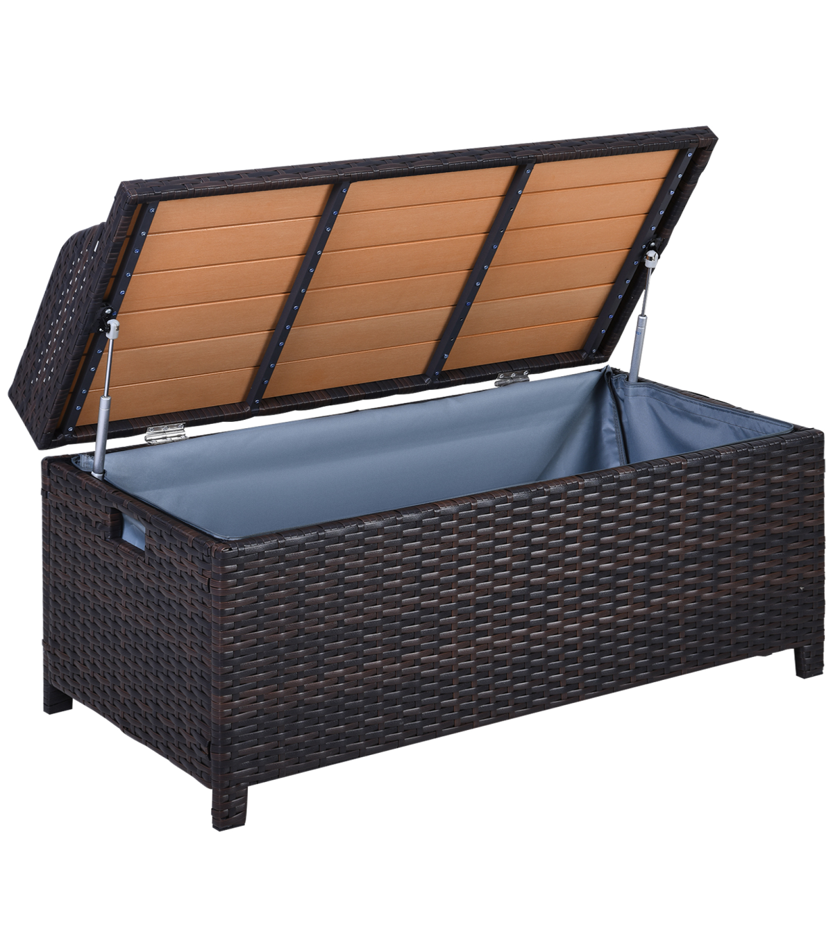 Made from an aluminum frame, PE rattan, wood and polyester cloth Ideal for terrace, garden, balcony, park, patio, deck, pool and backyard Fit to almost any living area Waterproof polyester cloth with PVC coating Allow 2 person sitting on it simultaneously. Upper cover can be opened and closed smoothly With large storage space for placing items Double air rod for support Armrests and backrest for necessary support Easy to move and lightweight Add beauty and seat for outdoor living area 2 hand holes for easy carrying Assembly required