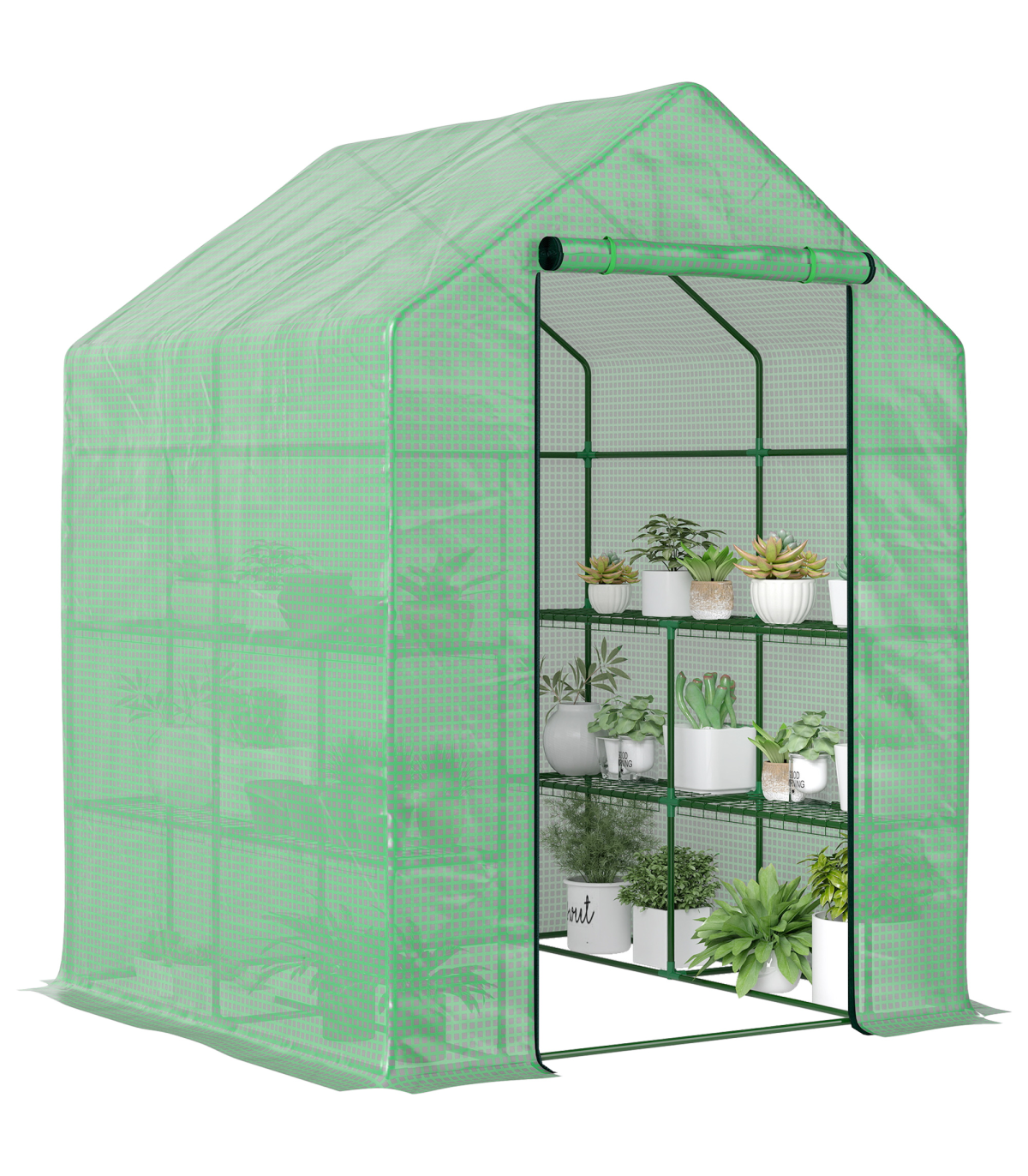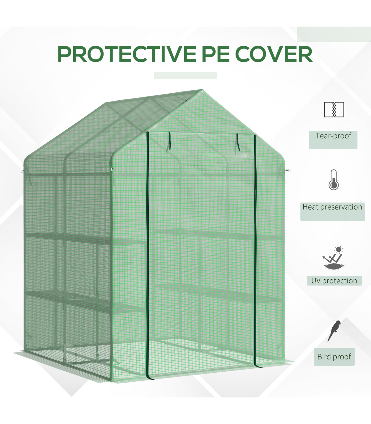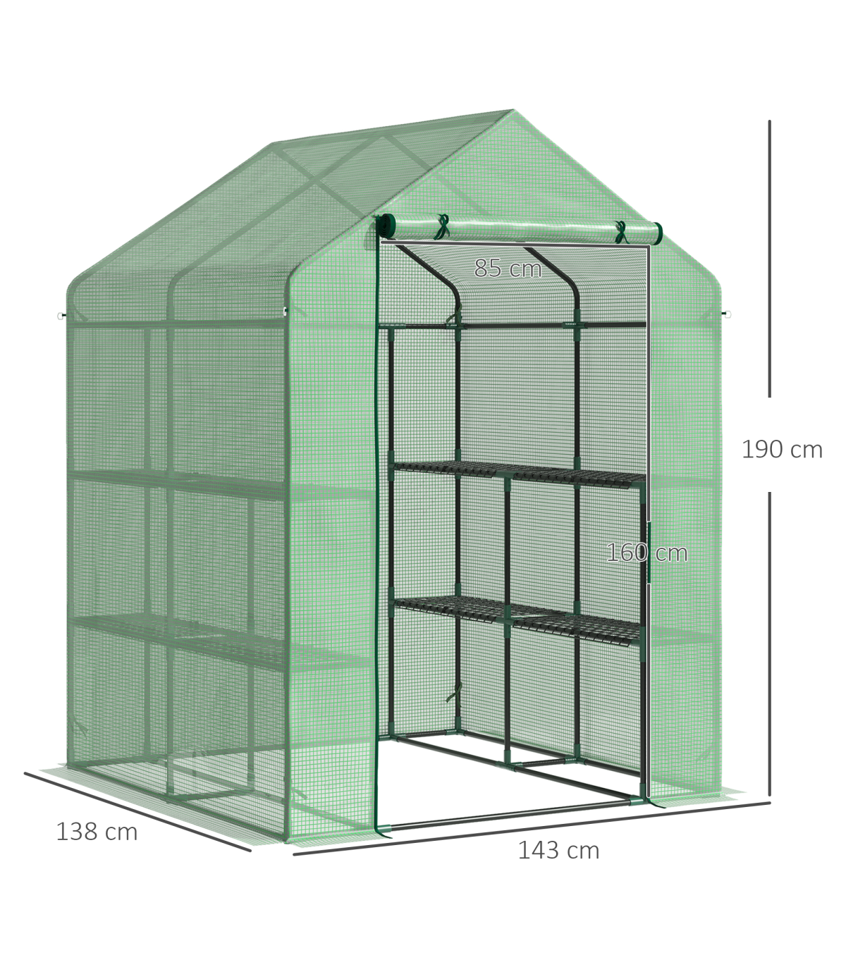 WITH INNER SHELVES: Levels on each side for plant display and storage. An ideal way to grow all year round, protecting plants from cold, mild wind, light rain and birds.ROLL-UP DOOR: Zipped to open and close easily for access, easy to let air inside too for regulating the temperature whenever.PE COVER: Durable plastic shell protects inside from light weather, whilst allowing nourishing sunlight to shine through. Keeps inside warm. 10cm extended edges to bury in the soil for added stability.STEEL FRAME: Powder coated metal for a steady core. Four guy ropes and ground pegs included.ASSEMBLY REQUIRED. DO NOT LEAVE IN HEAVY WEATHER CONDITIONS.