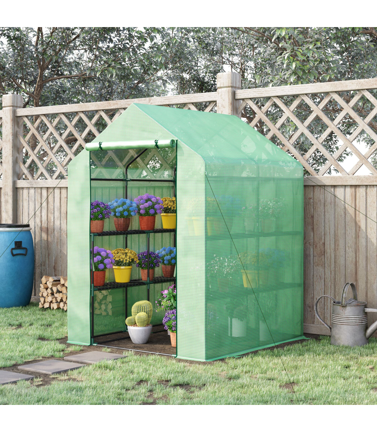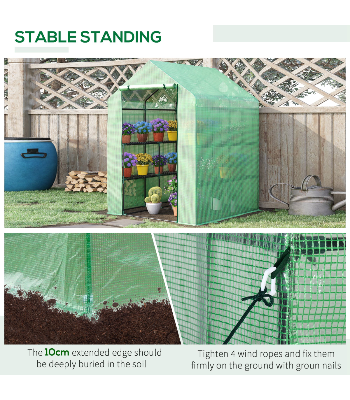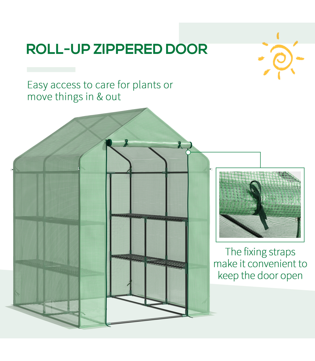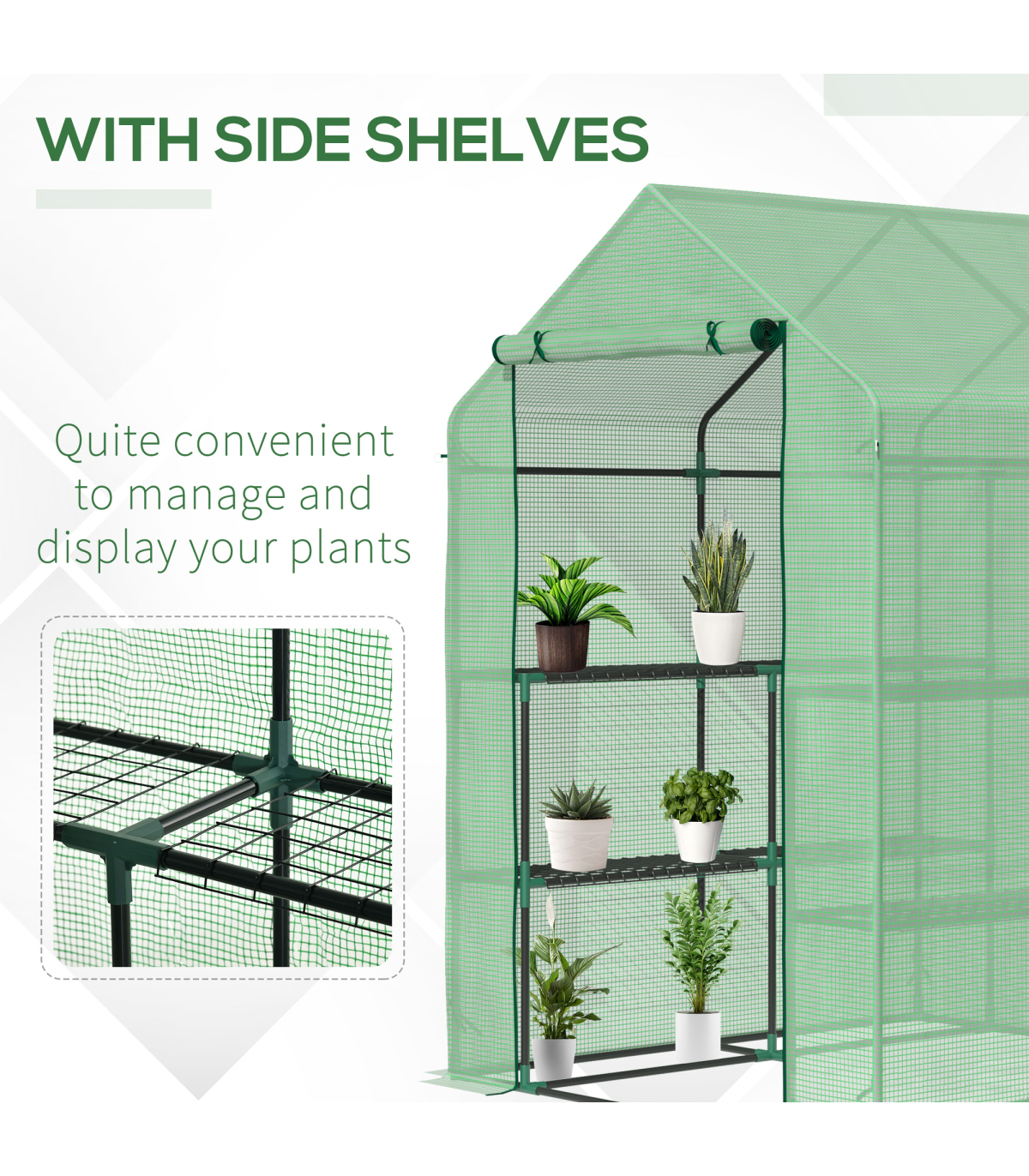 WITH INNER SHELVES: Levels on each side for plant display and storage. An ideal way to grow all year round, protecting plants from cold, mild wind, light rain and birds.ROLL-UP DOOR: Zipped to open and close easily for access, easy to let air inside too for regulating the temperature whenever.PE COVER: Durable plastic shell protects inside from light weather, whilst allowing nourishing sunlight to shine through. Keeps inside warm. 10cm extended edges to bury in the soil for added stability.STEEL FRAME: Powder coated metal for a steady core. Four guy ropes and ground pegs included.ASSEMBLY REQUIRED. DO NOT LEAVE IN HEAVY WEATHER CONDITIONS.