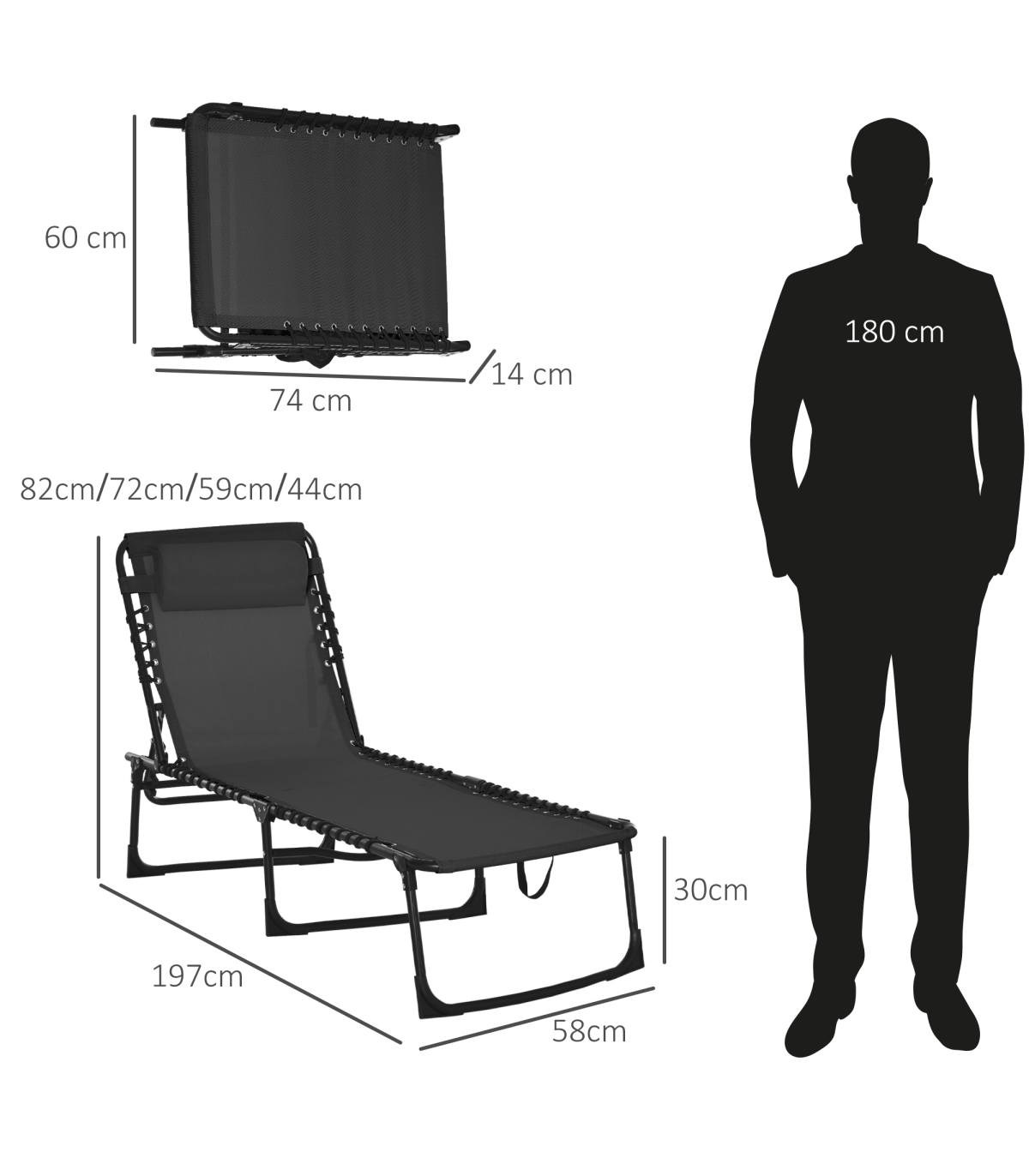 PRACTICAL GARDEN LOUNGE: The outdoor folding garden sun lounger is a perfect companion in a cool night, a leisurely afternoon or a decompressing vacation.ADJUSTABLE BACKREST: The backrest is 4-level adjustable and can meet your different needs, like read a book or have a nap.STABLE & COZY: The powder coated steel frame guarantees a stable standing and the 600D texteline with double elastic rope suspension system provides a comfortable yet strong support.FOLDABLE DESIGN: With the tri-fold design, the garden recliner is space saving when you store it in the corner or put it in the trunk in travel.DIMENSION: Overall Dimension: 197L x 58W x 78H cm, Folded Dimension: 74L x 14W x 60H cm.