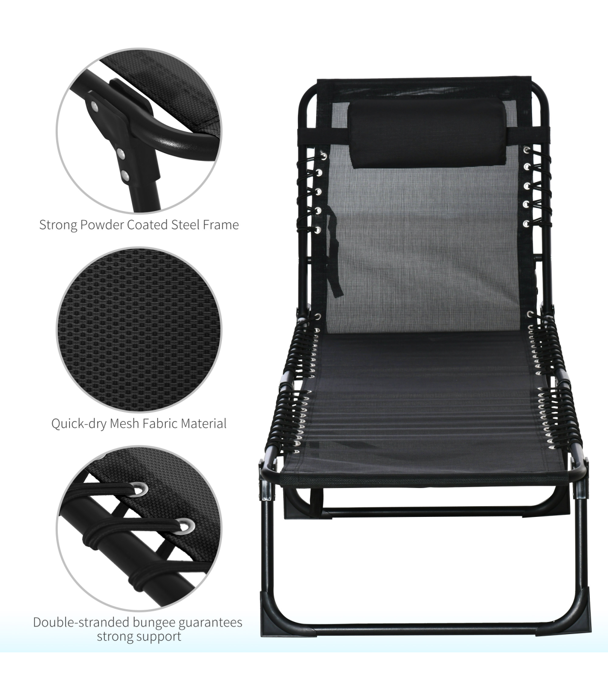 Outsunny 4-positions folding lounger is an ideal choice for you when at the beach, on the patio, near the swimming pool or at the camping ground. You can sit up, recline or lay down with 4 different reclining positions. A comfortable seat with a sturdy frame and its ability to fold up into a small one is easy to transport, you can toss this in your trunk and have a comfy place to rest anywhere.