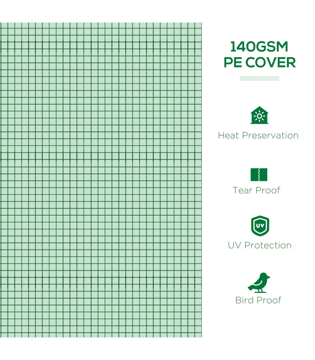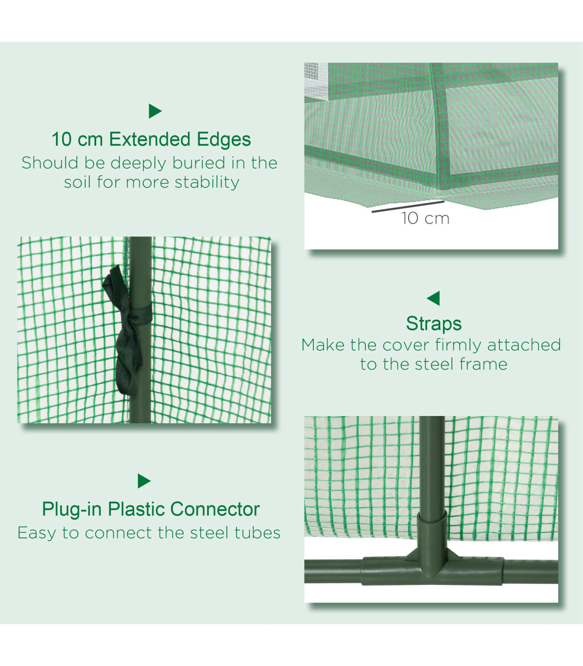 - Protects crops from cold, frost, and hail in winter and stimulates growth in spring and summer - 140 gsm PE cover prevents tearing, maintains humidity, and protects plants from UV scorching while letting 85% of sunlight through - Open windows with mesh for better air circulation and protection from critters - Ground tubes and 10cm edges help the greenhouse fixed to the ground - An arched top to prevent sagging - Easy to assemble by connecting every two tubes with the 3-corner and 4-corner joints - Recommended that 1-2 people assemble it