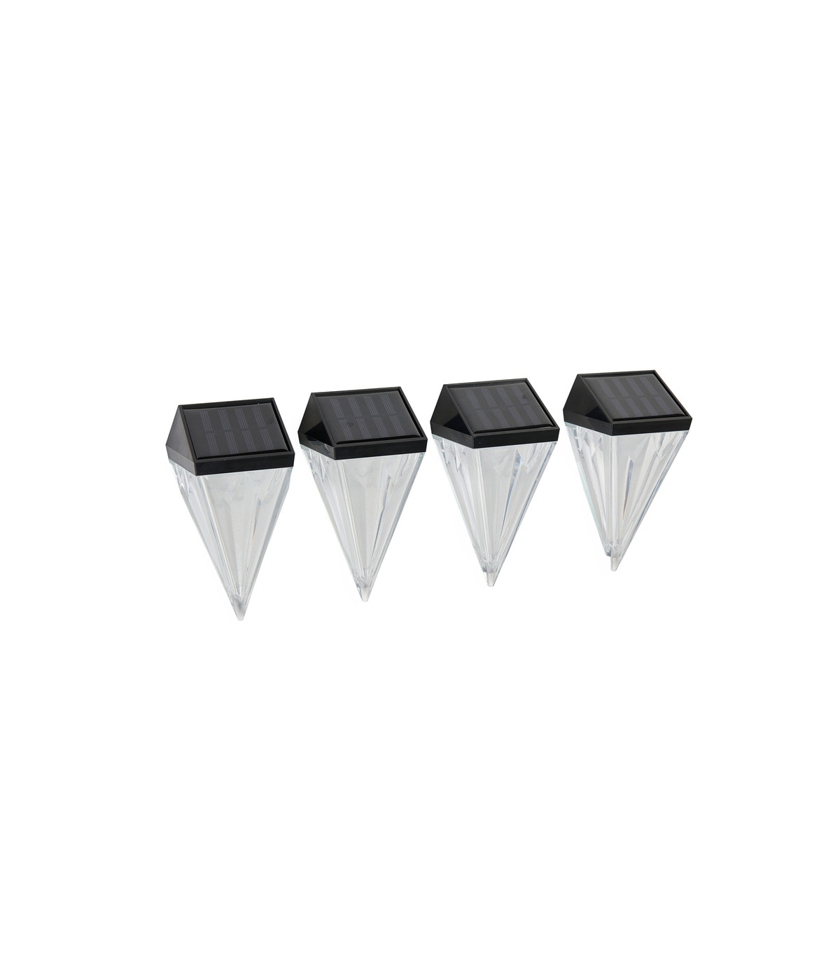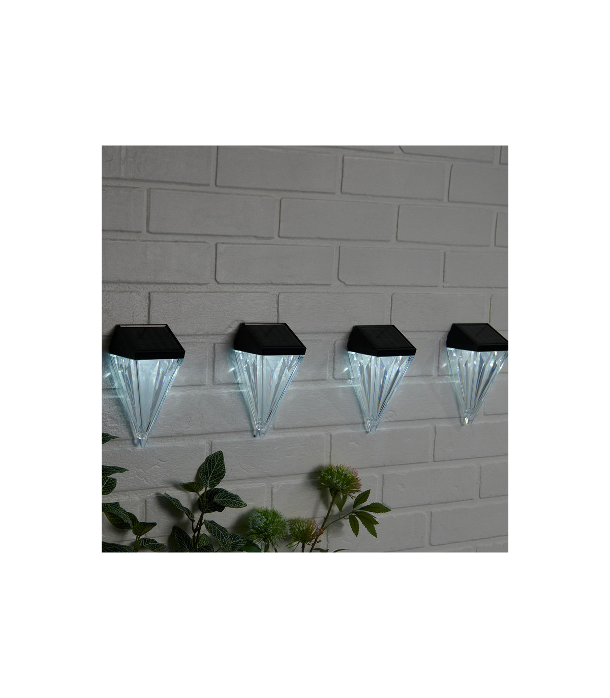 Pack of four solar diamond wall lights give out a delightful warm white light and are ideal mounted onto fencing, walls or near outside steps.