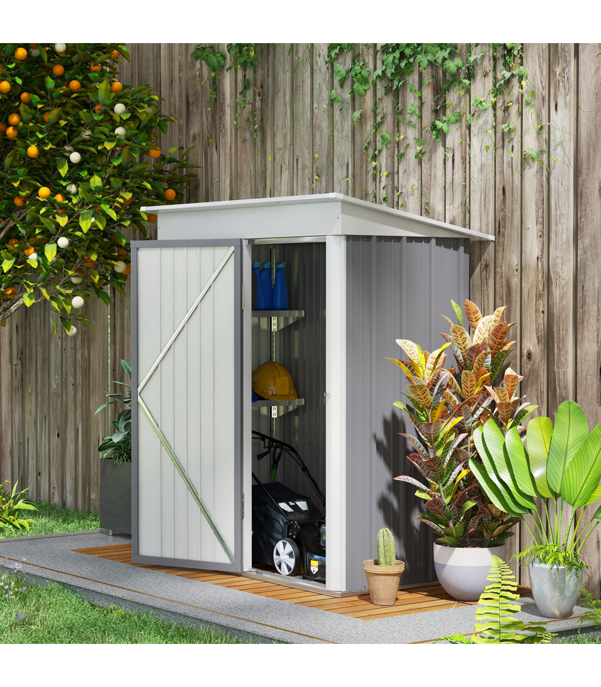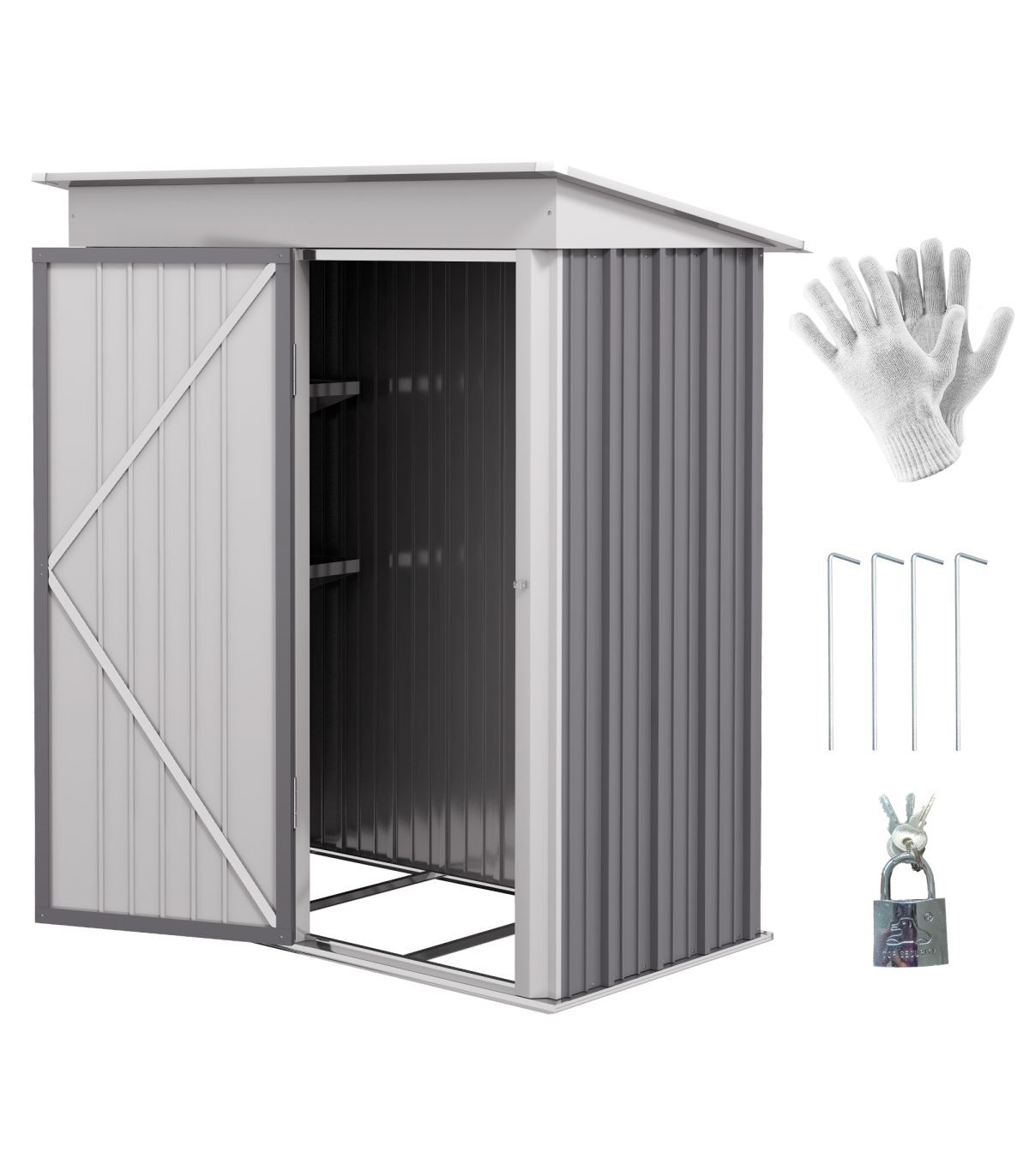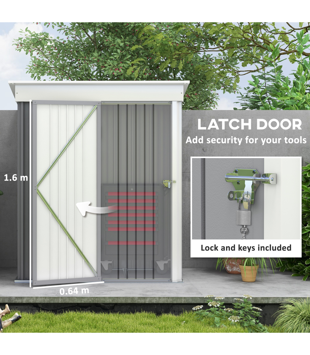 - Small Garden Shed, Steel Lean-to Shed for Bike with Adjustable Shelf, Lock, 5x3 - Description: - Colour: Grey, White - Materials: Galvanised Steel - Overall Dimension: 161W x 95D x 163-181H cm - Door Dimension: 64W x 160H cm - Bottom Dimension: 155W x 87D cm - Floor Area: 1.36 m² - Snow Capacity: 30 kg/? - Inner Dimension: 146W x 75D cm - Item Label: 845-840V01GY