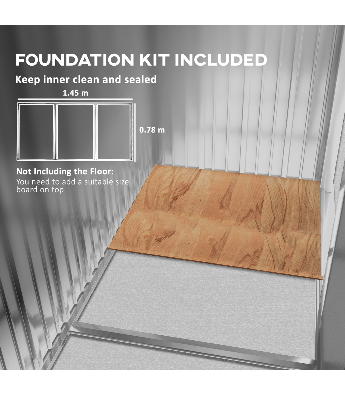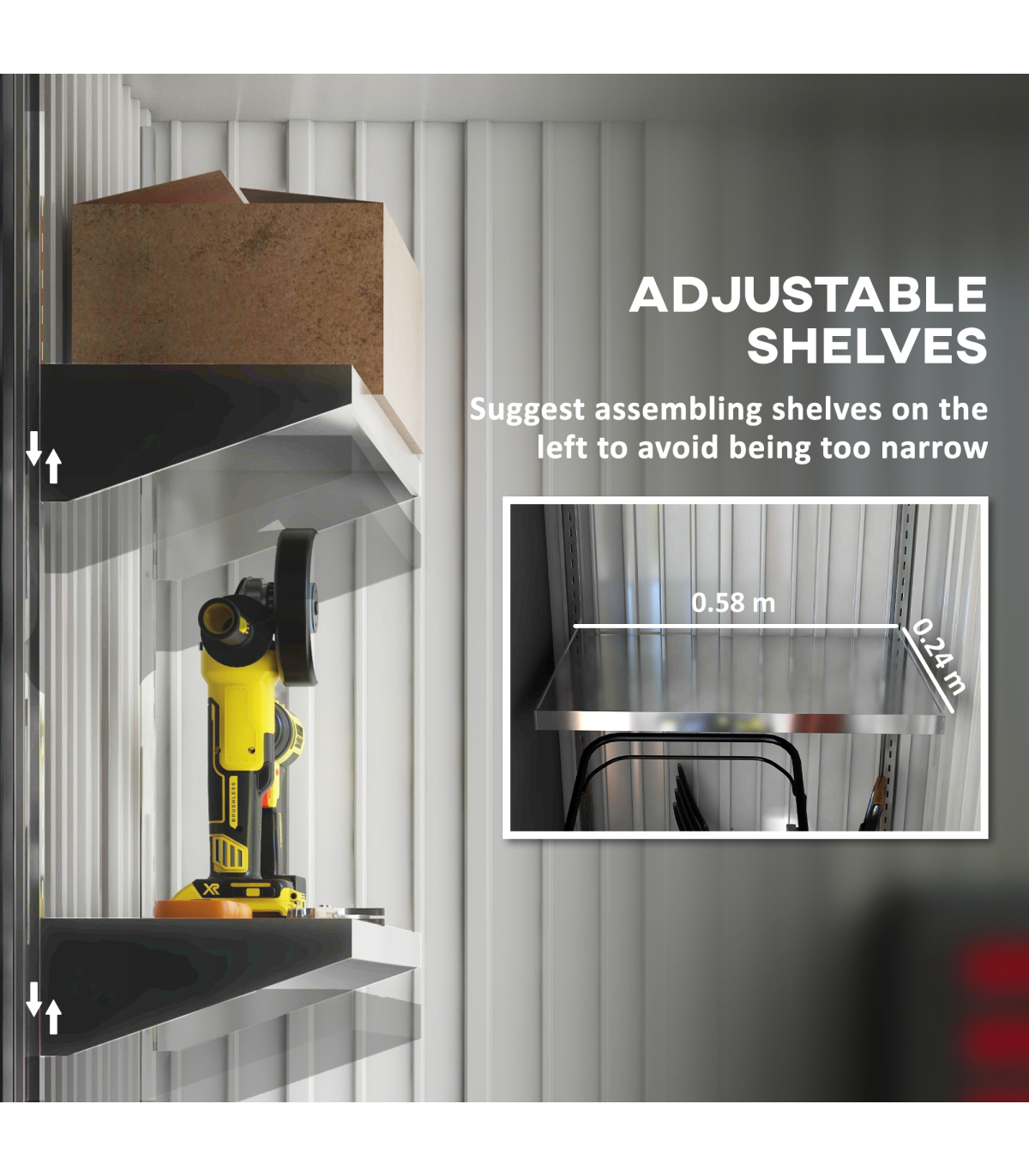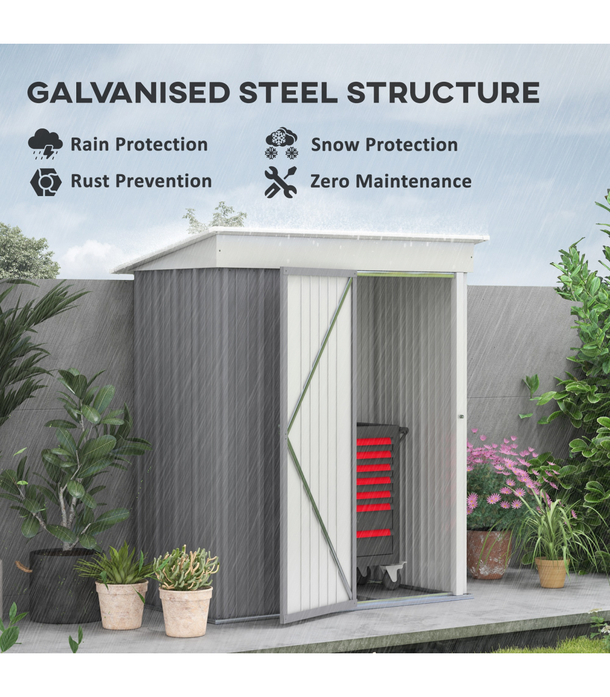 - Small Garden Shed, Steel Lean-to Shed for Bike with Adjustable Shelf, Lock, 5x3 - Description: - Colour: Grey, White - Materials: Galvanised Steel - Overall Dimension: 161W x 95D x 163-181H cm - Door Dimension: 64W x 160H cm - Bottom Dimension: 155W x 87D cm - Floor Area: 1.36 m² - Snow Capacity: 30 kg/? - Inner Dimension: 146W x 75D cm - Item Label: 845-840V01GY