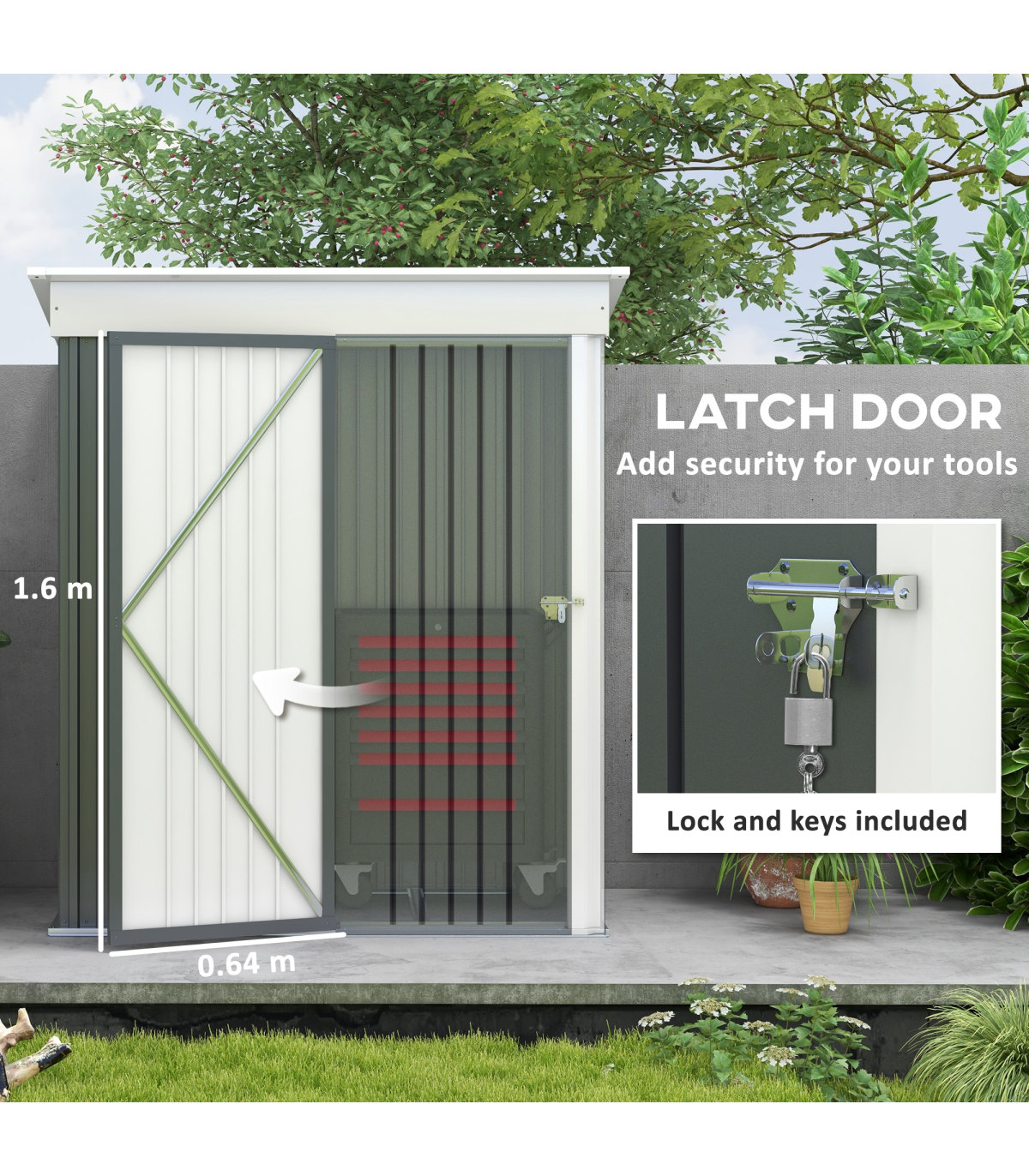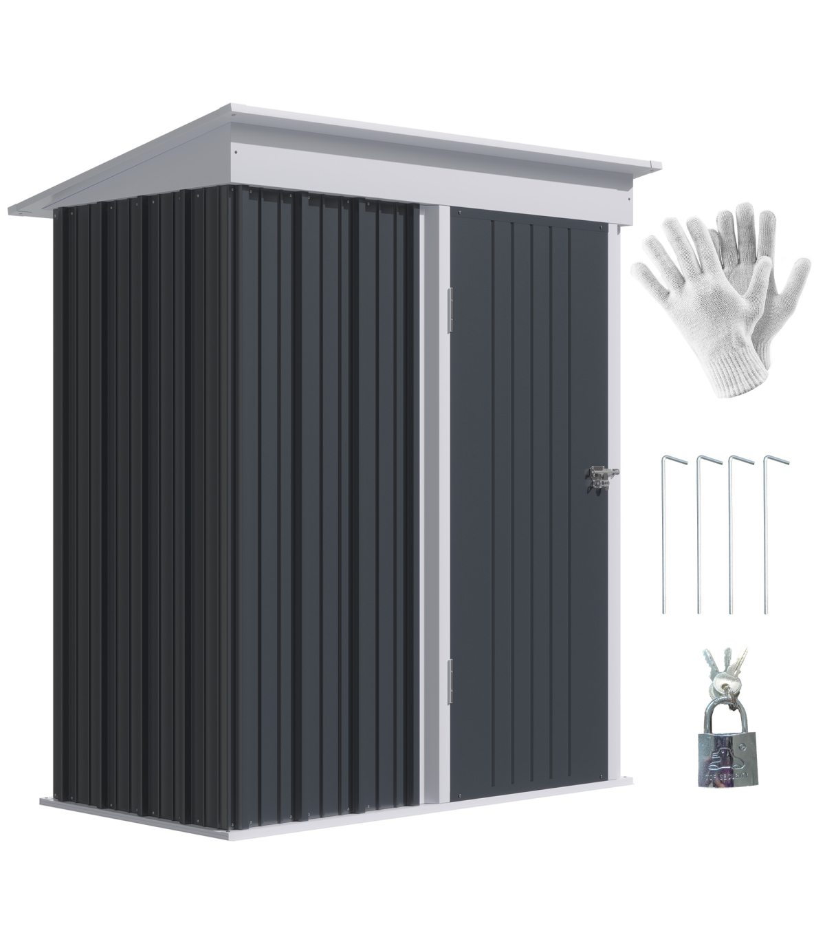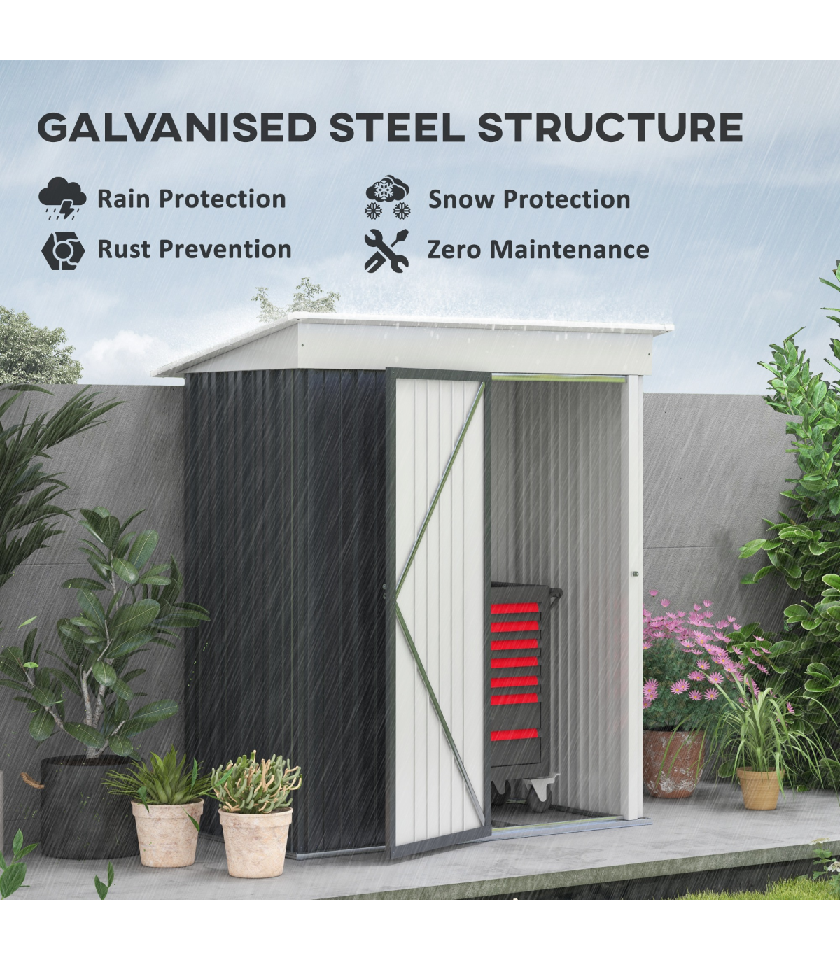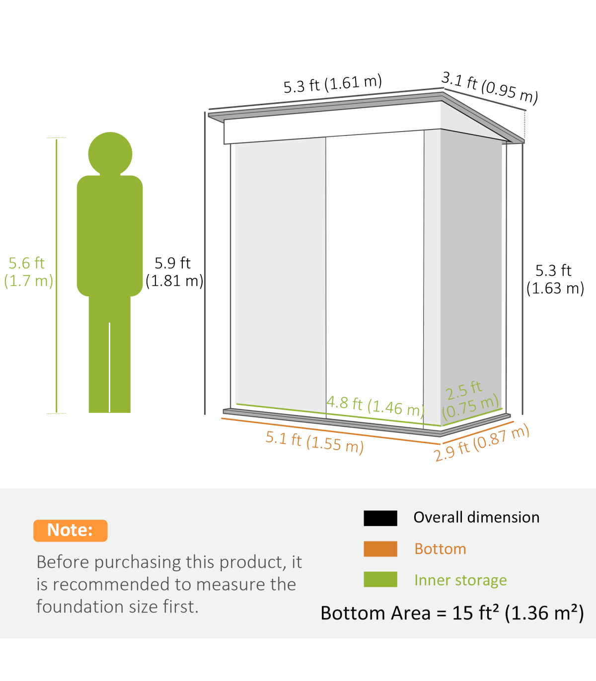 - "Small Garden Shed, Steel Lean-to Shed for Bike with Adjustable Shelf, Lock, 5x3" - Description: - Colour: Dark Grey, White - Materials: Galvanised Steel - Overall Dimension: 161W x 95D x 163-181H cm - Door Dimension: 64W x 160H cm - Bottom Dimension: 155W x 87D cm - Floor Area: 1.36 m² - Snow Capacity: 30 kg/? - Inner Dimension: 146W x 75D cm - Item Label: 845-840V01CG