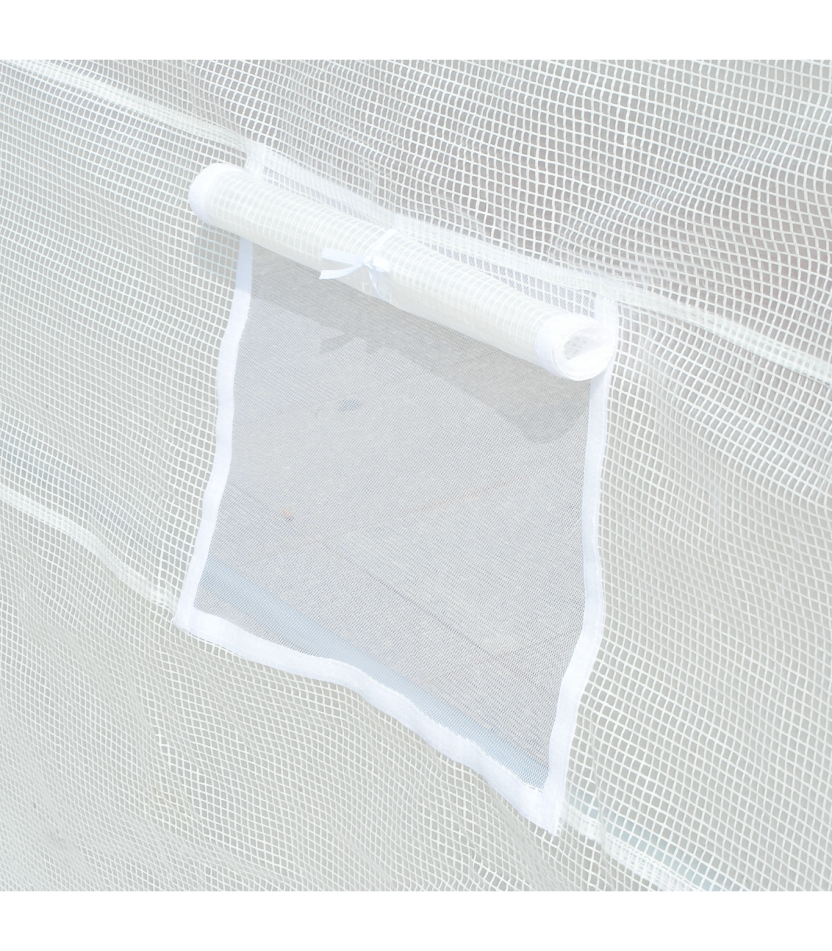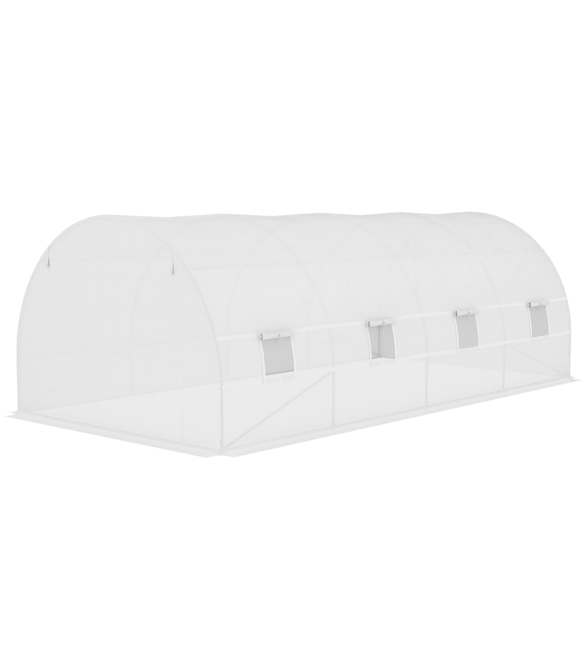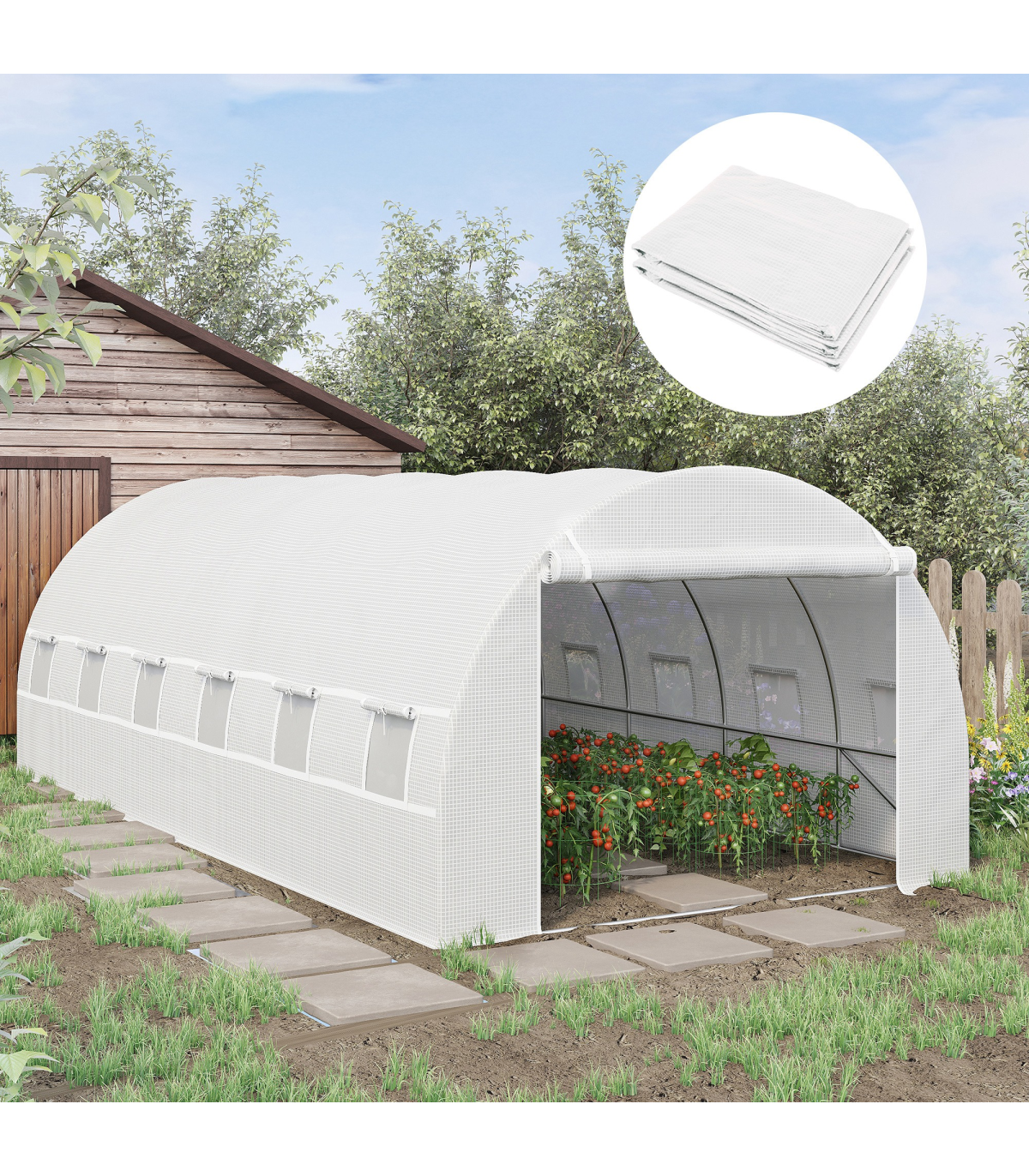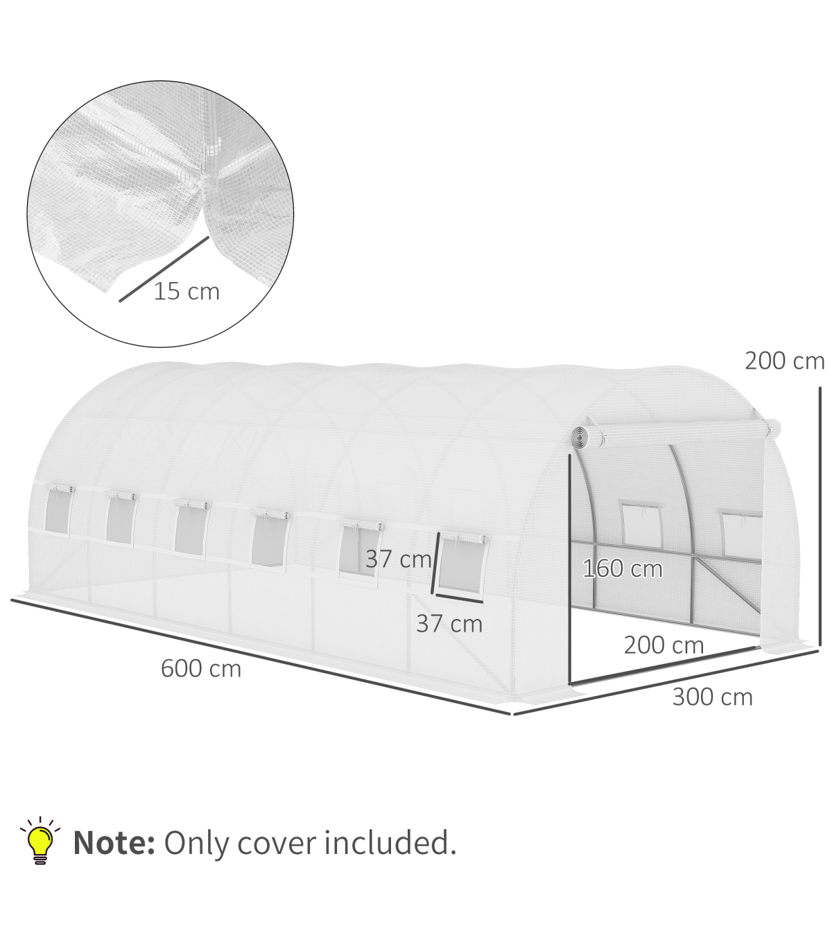 Suitable for tunnel-style greenhouses A durable and tear-resistant replacement for old greenhouse covers - extends the lifespan of your product easily 15cm overlap on all edges to weigh down. Best buried in the soil Protects crops from cold, light rain and light wind Zipped roll-up front door for easy access Features 12 windows to let fresh air inside Assembly required Brand: Outsunny Colour: White Material: PE Dimensions: 200H x 600L x 300Wcm. Door: 200W x 160Hcm. Window: 37L x 37Wcm Custom label: 845-382WT NOTE: Not suitable for bad weather conditions