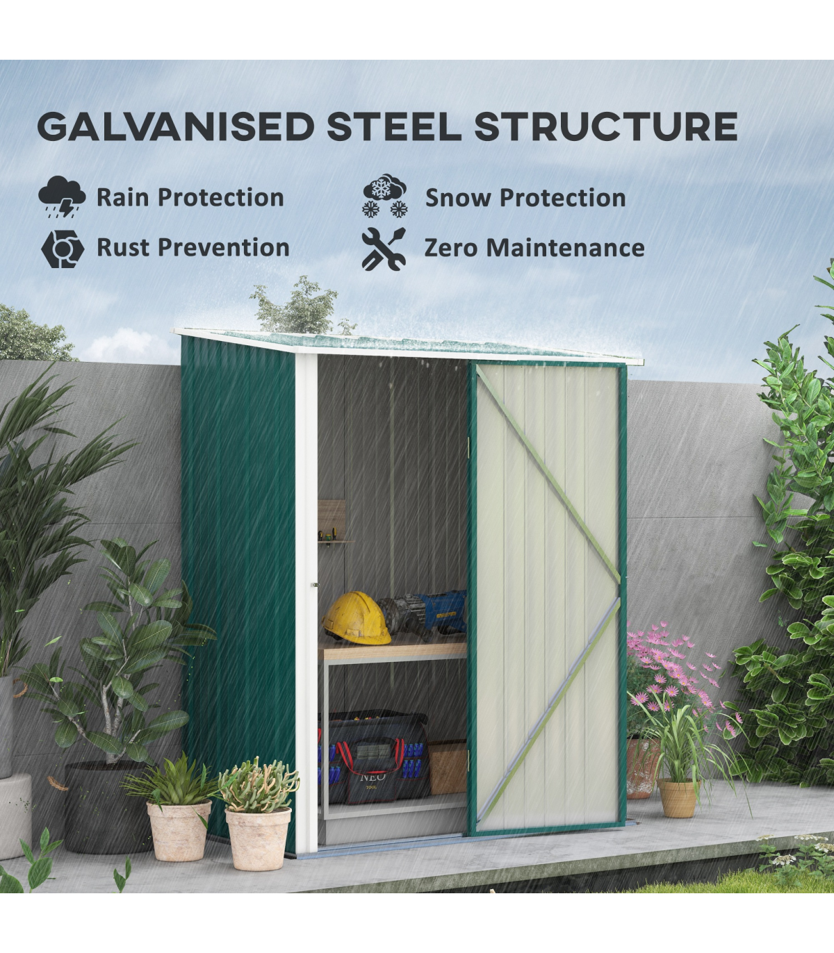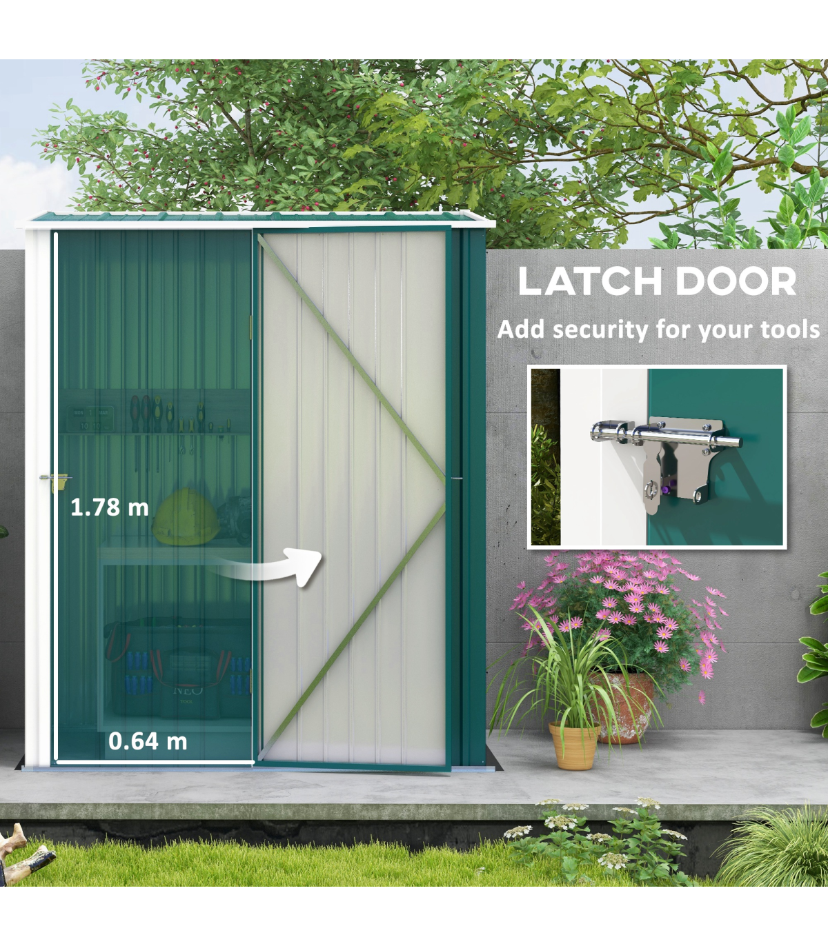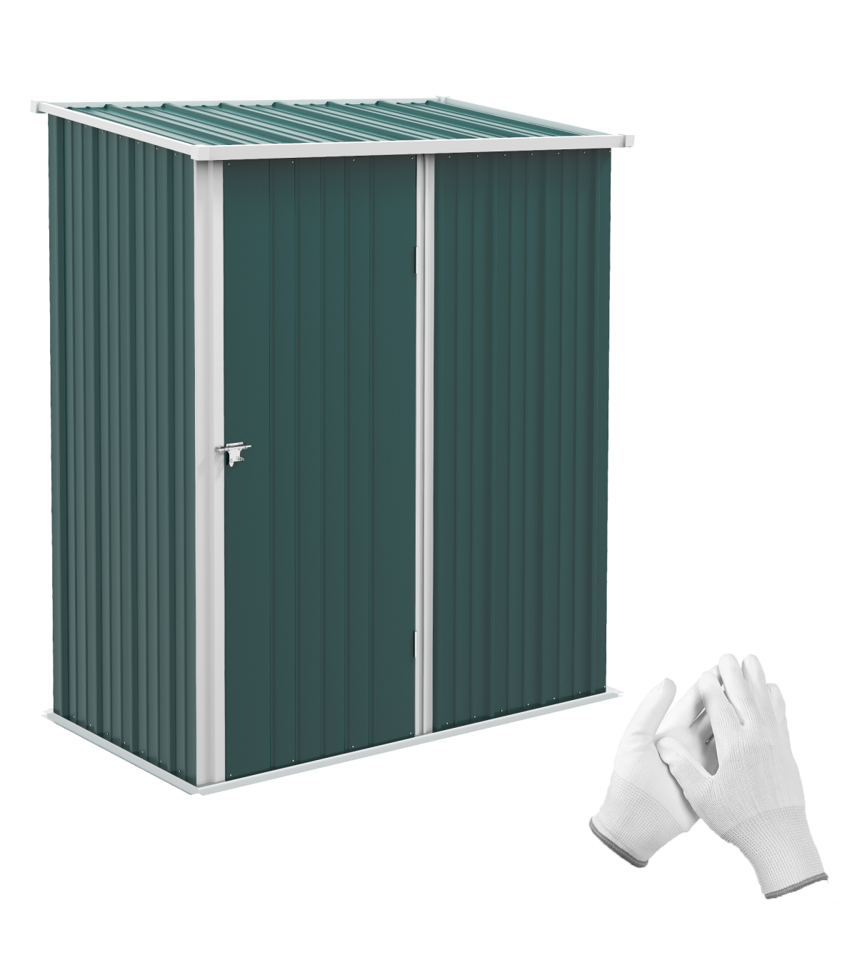 - "Outsunny Outdoor Storage Shed Steel Garden Shed with Lockable Door for Garden" Description: - Note: Floor foundation is not included. - Large inner room for garden/outdoor tools, equipment, and more. - Corrugated steel structure with galvanized finish for a strong shell. - Sloped roof means no rainwater buildup. - Latched door to keep safely shut. - Assembly required. - Colour: Green. Materials: Steel. Overall Dimension: 161.5W x 94.5D x 196Hcm. Inner Dimension: 142.5W x 74.5Dcm. Bottom Size: 155W x 86.5Dcm (1.34m²). Eave Height: 183Hcm. Door Size: 63.5W x 178Hcm. Item Label: 845-532V00GN. NOTE: Recommended to use shed against a wall.