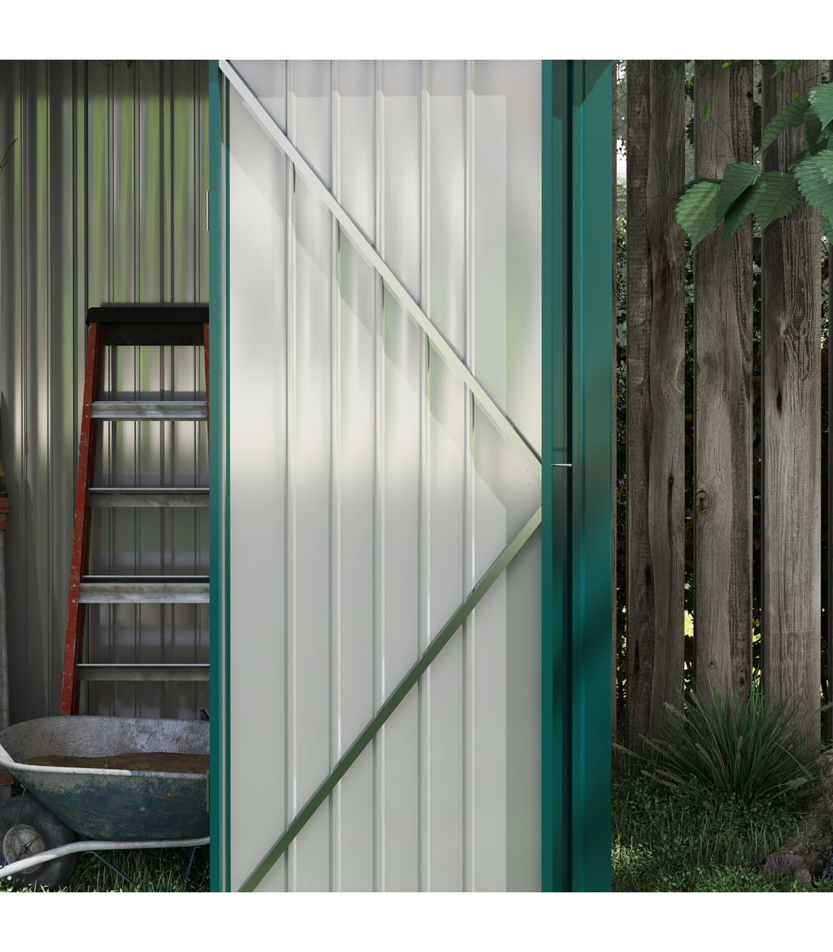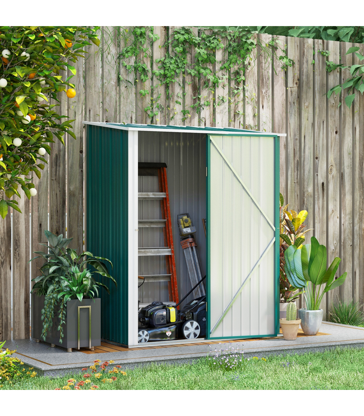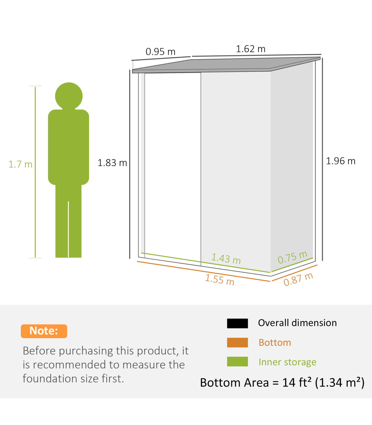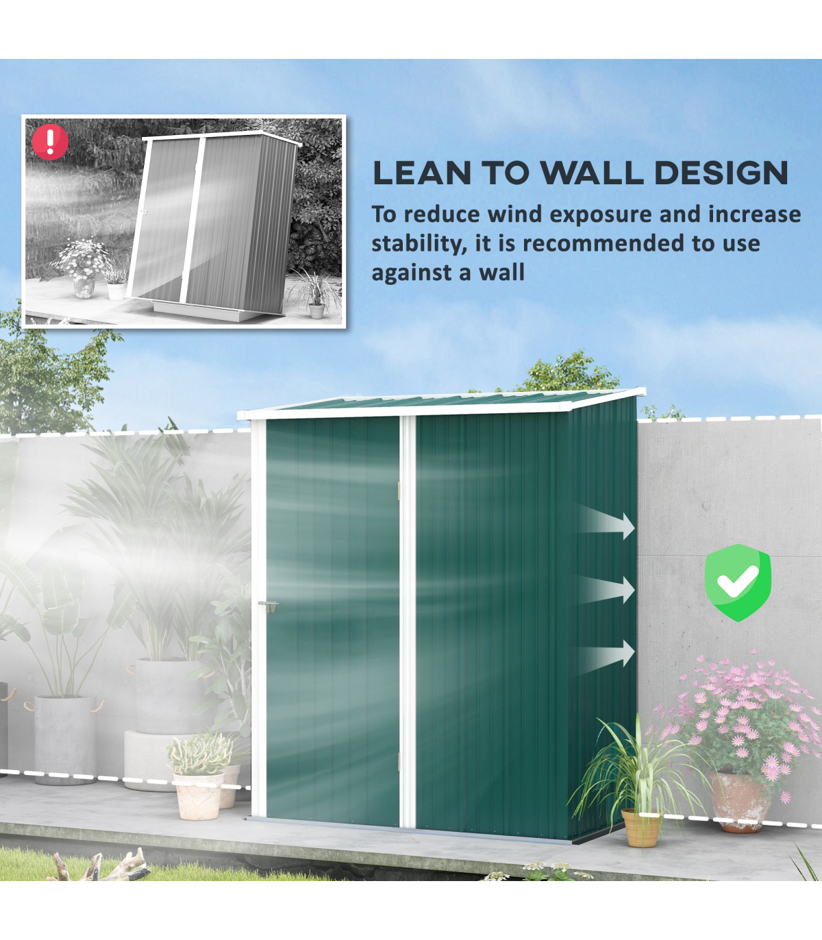 - "Outsunny Outdoor Storage Shed Steel Garden Shed with Lockable Door for Garden" Description: - Note: Floor foundation is not included. - Large inner room for garden/outdoor tools, equipment, and more. - Corrugated steel structure with galvanized finish for a strong shell. - Sloped roof means no rainwater buildup. - Latched door to keep safely shut. - Assembly required. - Colour: Green. Materials: Steel. Overall Dimension: 161.5W x 94.5D x 196Hcm. Inner Dimension: 142.5W x 74.5Dcm. Bottom Size: 155W x 86.5Dcm (1.34m²). Eave Height: 183Hcm. Door Size: 63.5W x 178Hcm. Item Label: 845-532V00GN. NOTE: Recommended to use shed against a wall.