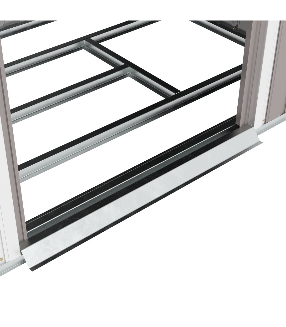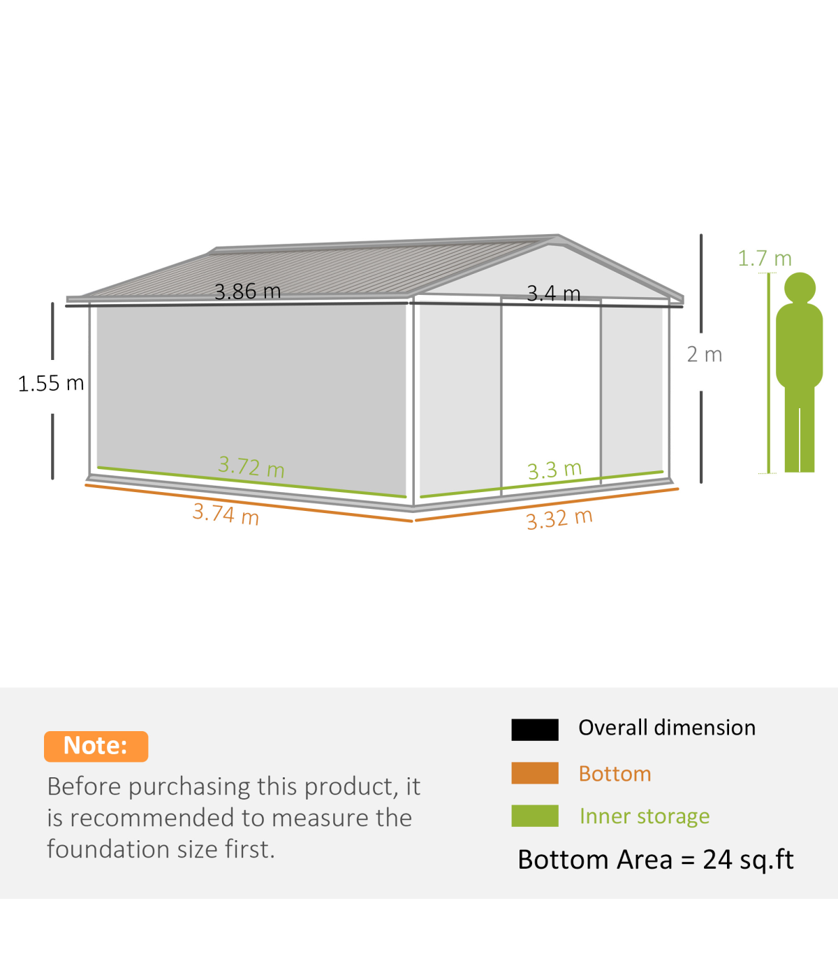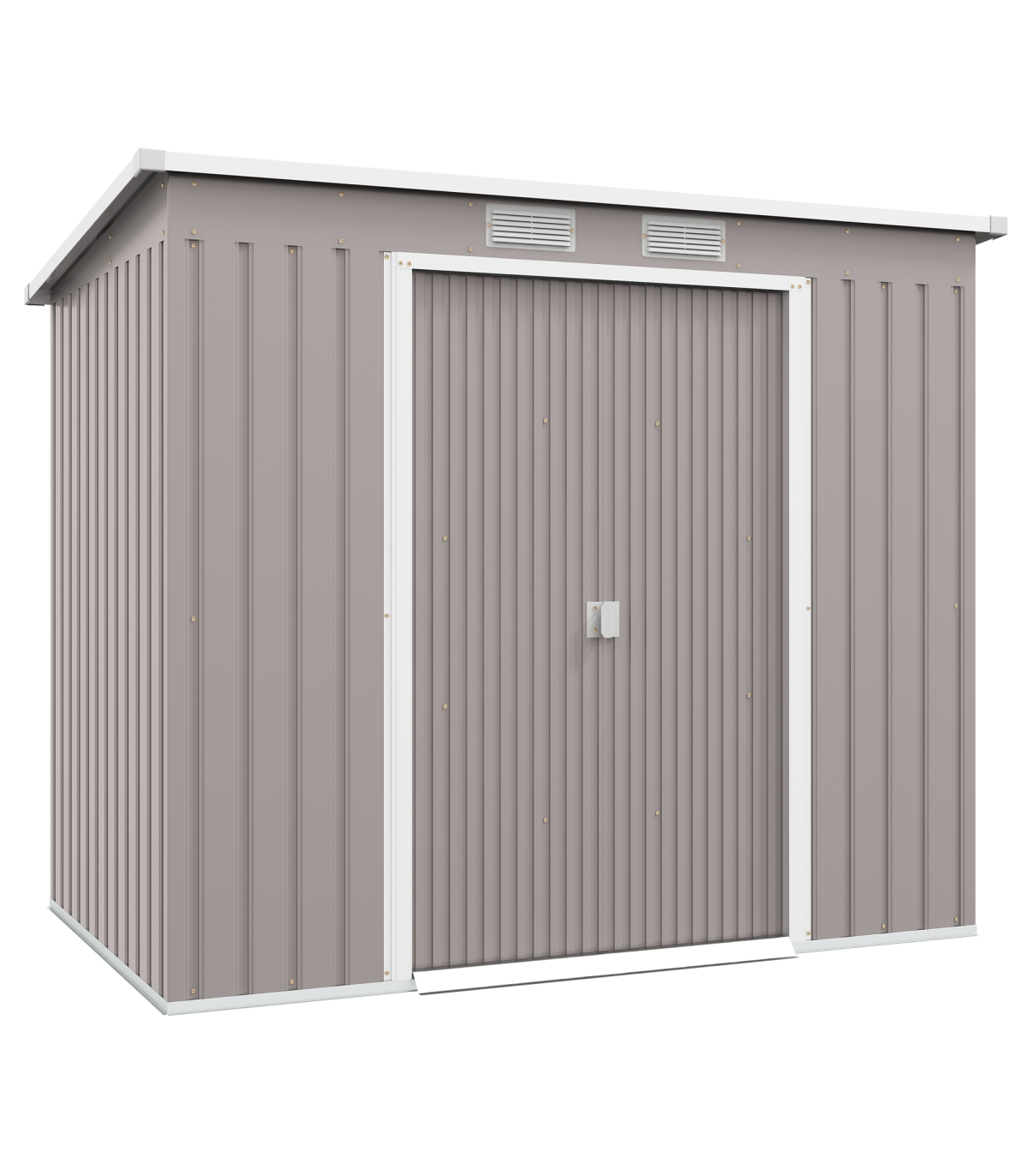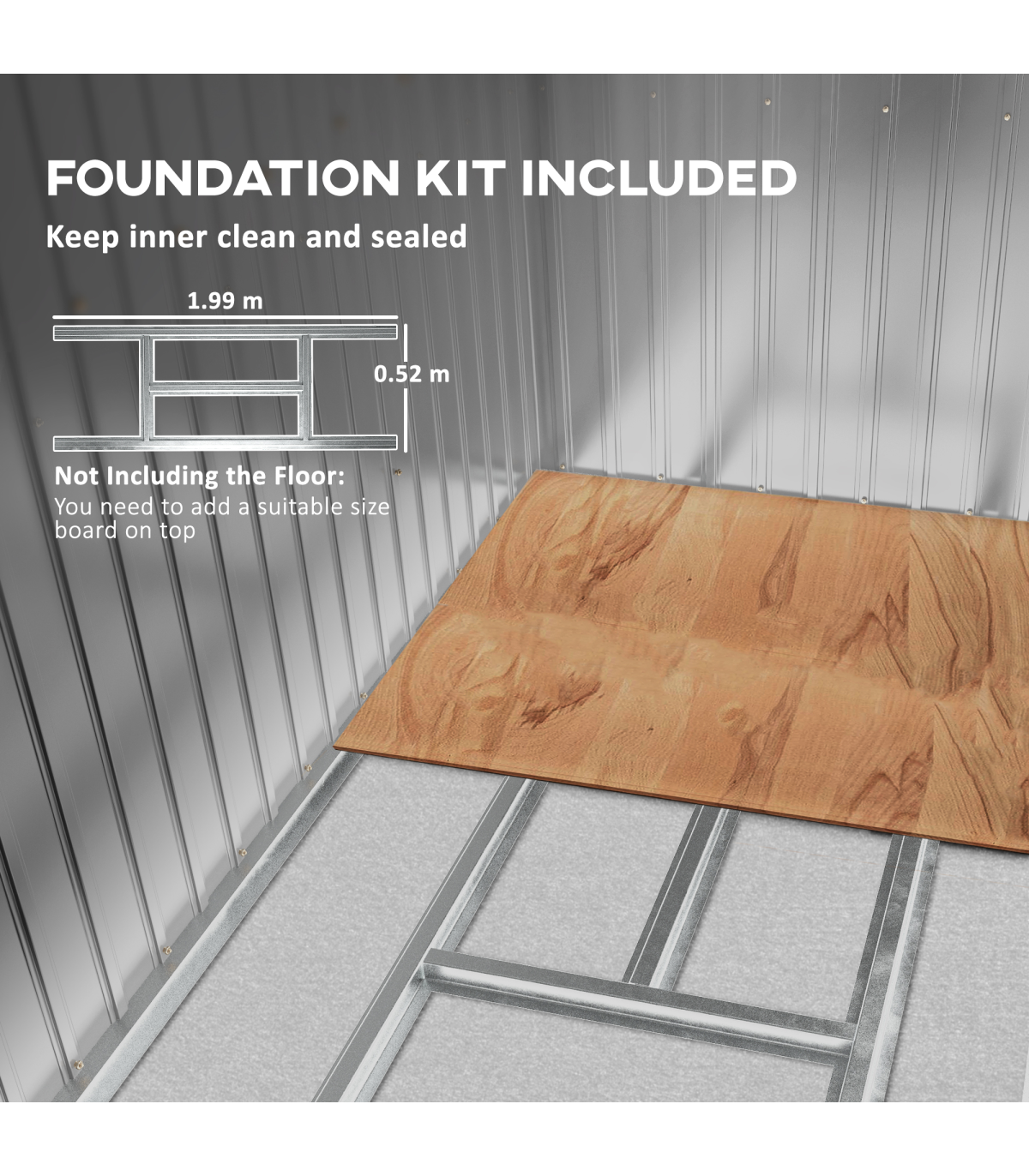 Tool shed with floor foundation Robust construction of the small shed for durability outdoors Sloped roof to prevent water build up Sliding double door for easy access in and out. Can be locked, lock not included Air vents to keep bike storage metal shed inside fresh and aerated Assembly required Colour: Grey Material: Galvanised Steel Overall Dimensions: 213L x 130W x 159/172H cm Inner Size: 200L x 105W x 168/159H cm Door Size: 96L x 152H cm Window Size: 21.5L x 9.5W cm Foundation Size: 200L x 56W cm Item Label: 845-390V00LG