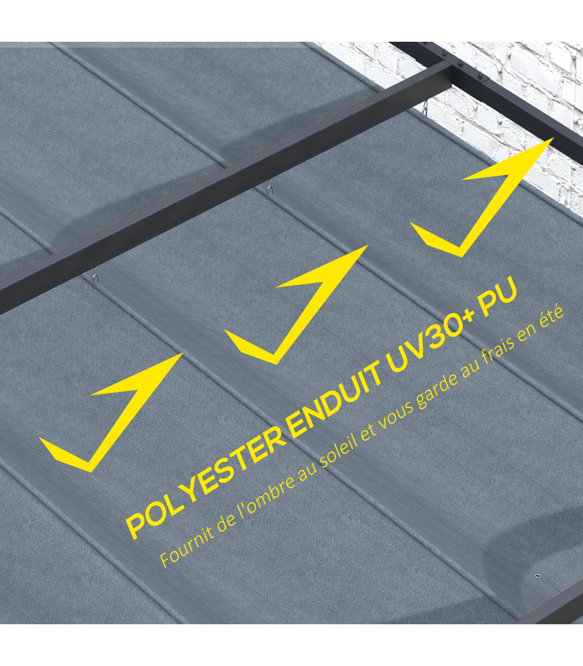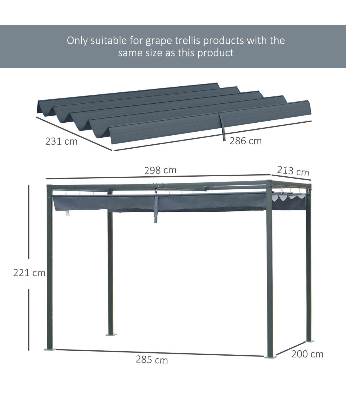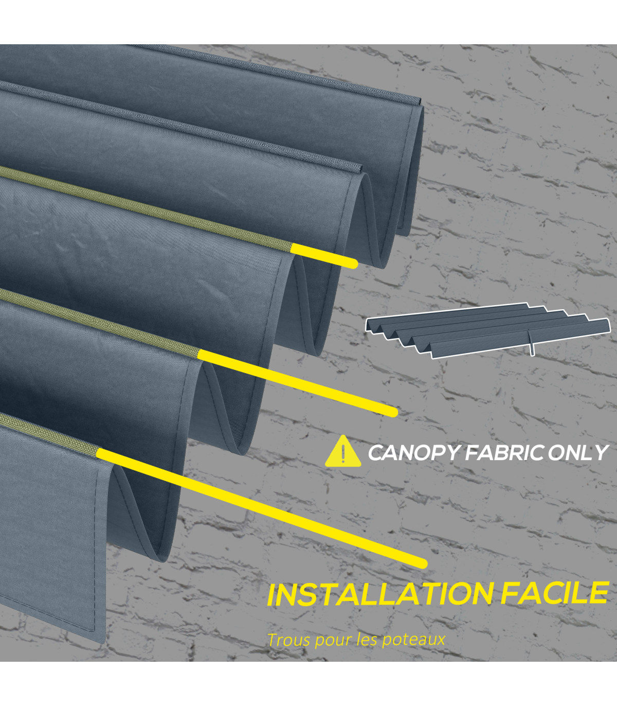 Four Outsunny pergola sku 84C-175 Durable polyester for extended use. PU coating, UV30+ protection Eight holes for easy water drainage Easy to fix: attach end holes to the rods and hook you already have Fabric only included Colour: Dark Grey Material: Polyester Overall Dimensions: 286L x 245Wcm Suitable for Outsunny SKU 84C-175 Item Label: 84C-466V00CG