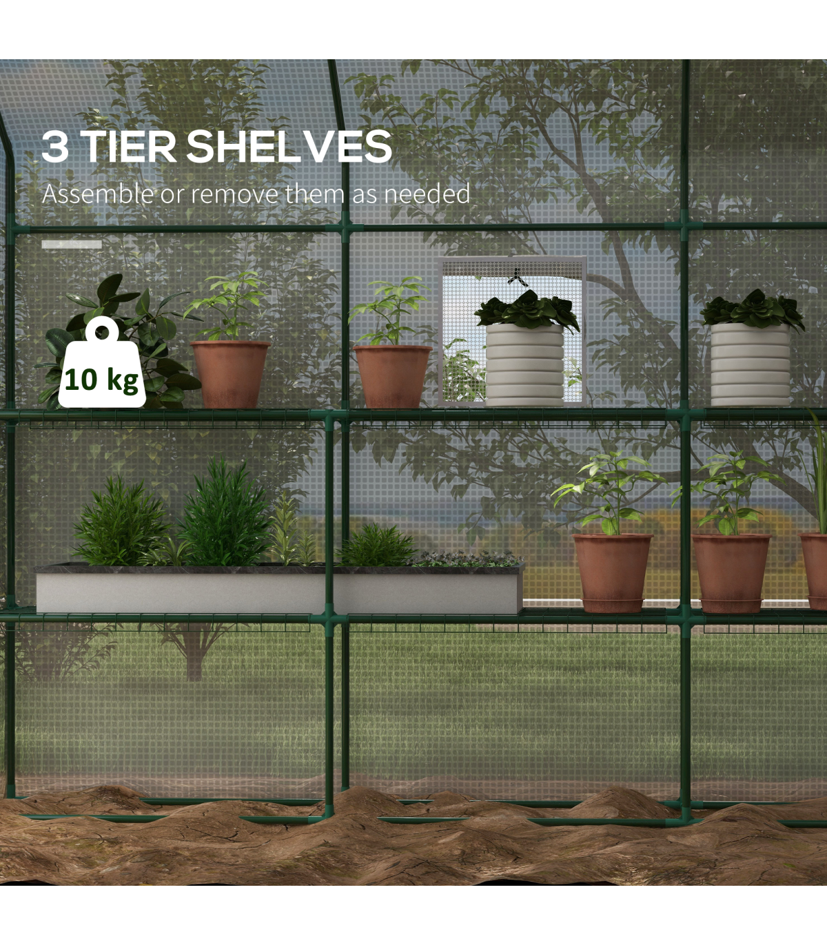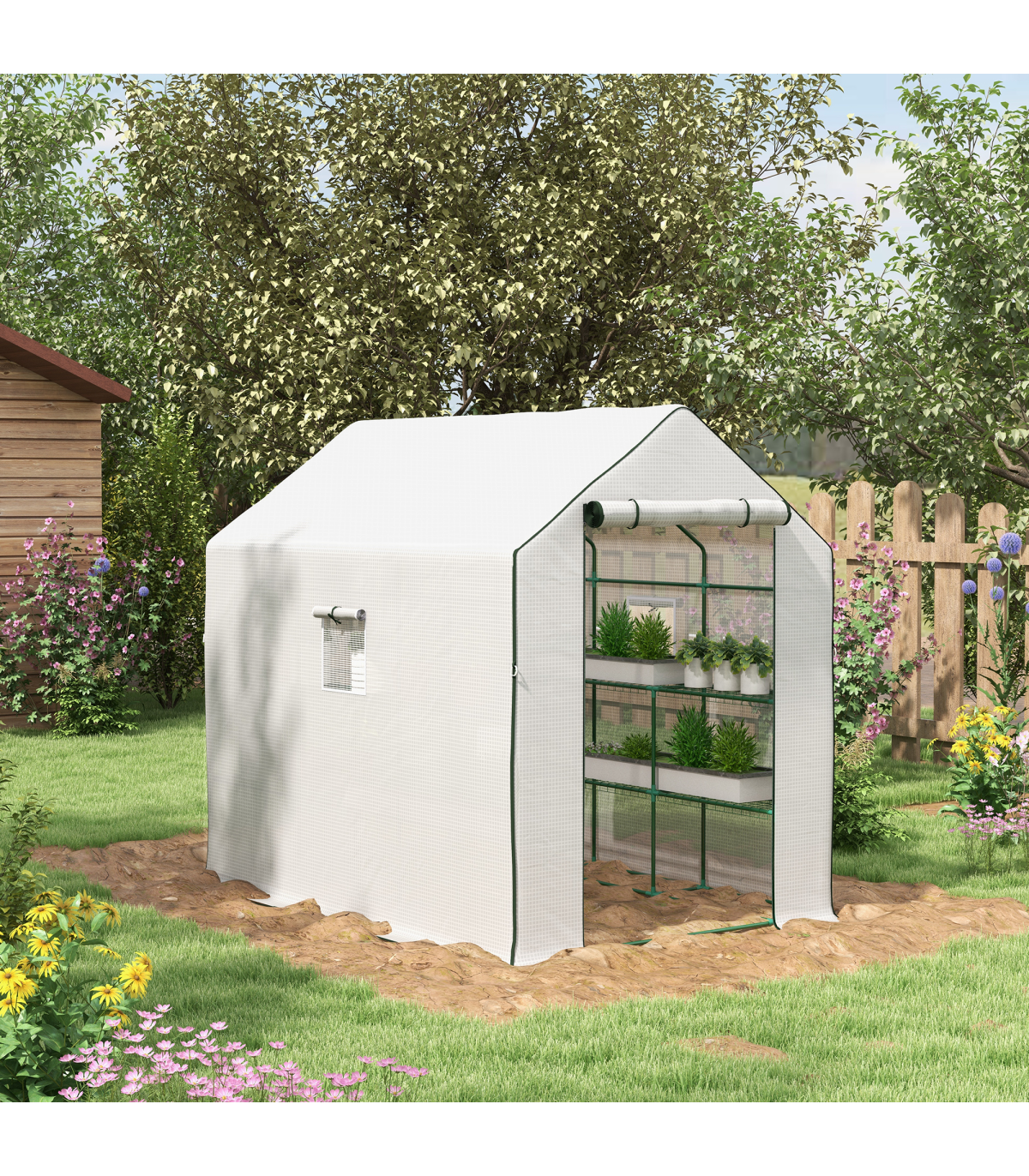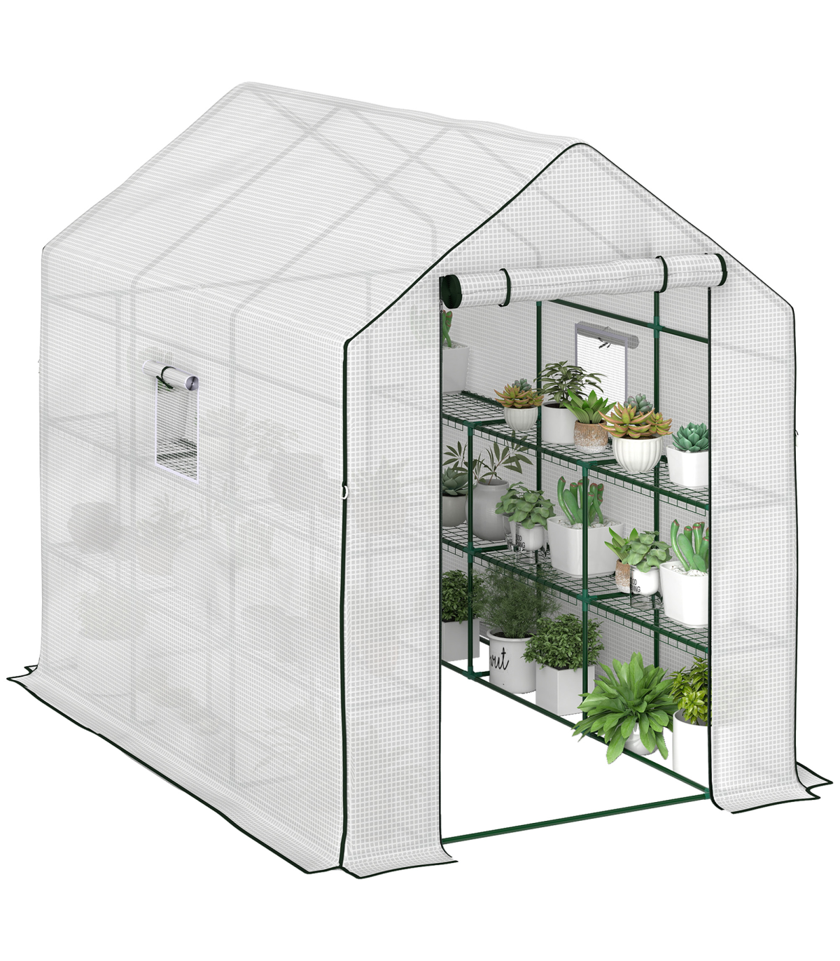 Plant growing, done your way with this Outsunny 140 x 213cm greenhouse. A steel frame for a strong structure, made into an open design inside - set it up how you want. Two shelves on each side offer handy organisation. The three-layer plastic cover creates safe shelter: an inner reinforcement grid for extra durability and resilience. The cover creates a safe and warm environment for an encouraging growing environment. Complete with a roll-up door and windows.