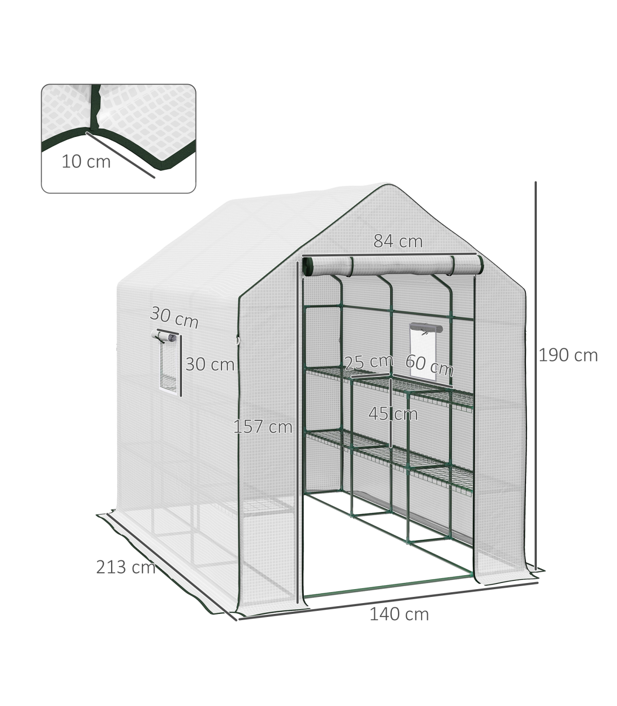 Four ground stakes and four guy ropes included Open, walk-in design, with side shelves for organisation UV-resistant cover to create safe shelter for plants Hemmed edging to reinforce and prevent tearing Roll-up zipped door and mesh windows for easy access and ventilation Easy to assemble - two people recommended Colour: White Material: Steel, Polyethylene Overall Dimensions: 140W x 213D x 190Hcm Door Dimensions: 84W x 157Hcm Window Dimensions: 30W x 30Hcm Wire Shelf Dimensions: 60W x 25Dcm Shelf Spacing: 45cm Edging Width: 10cm Shelf Weight Capacity: 10kg Item Label: 845-931V00WT