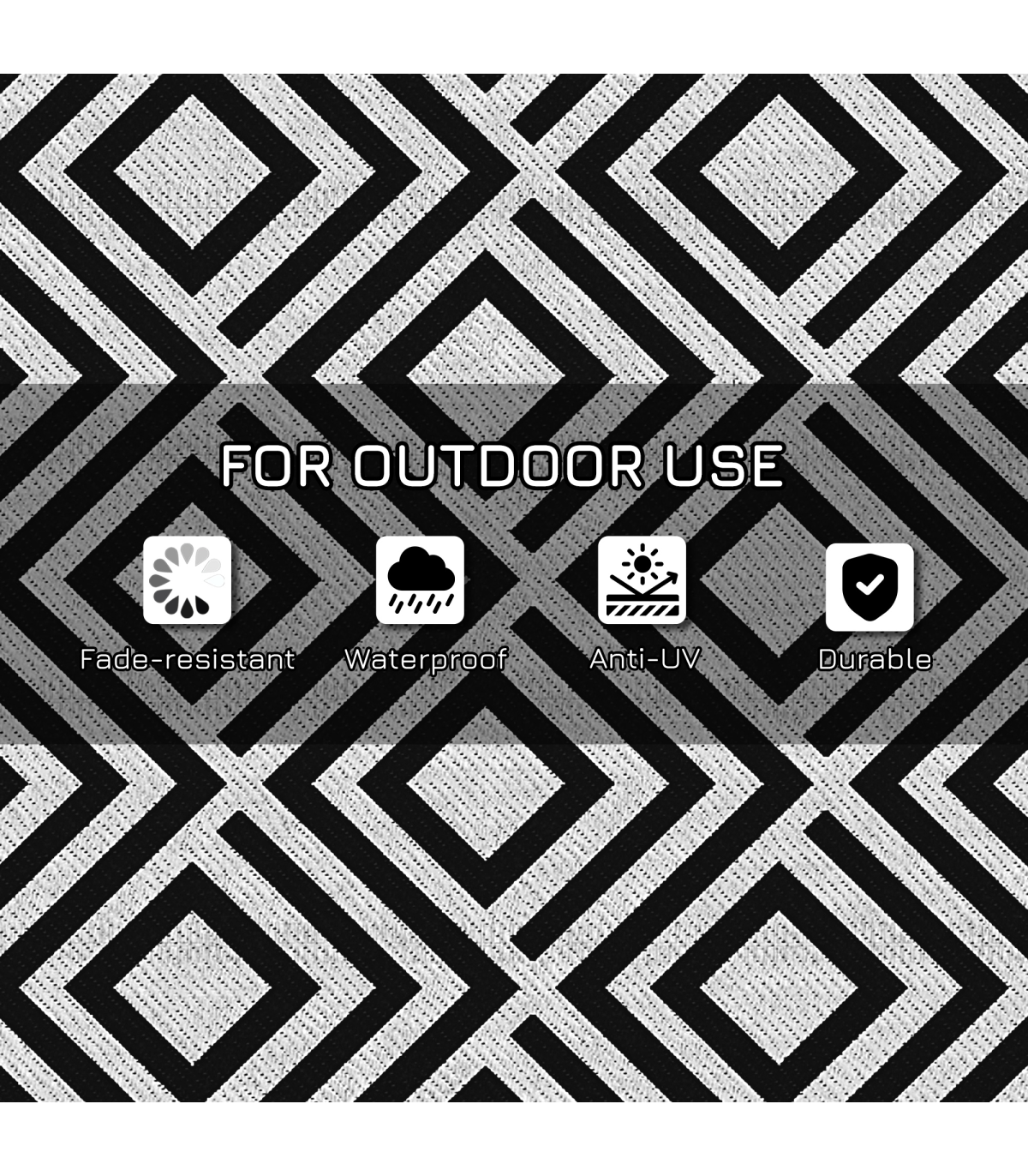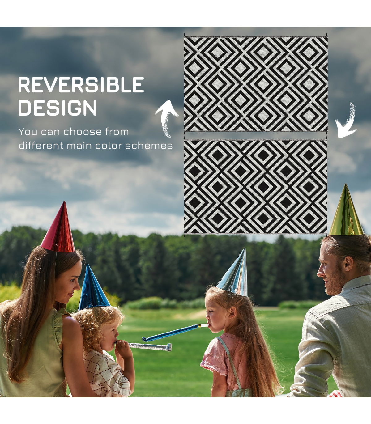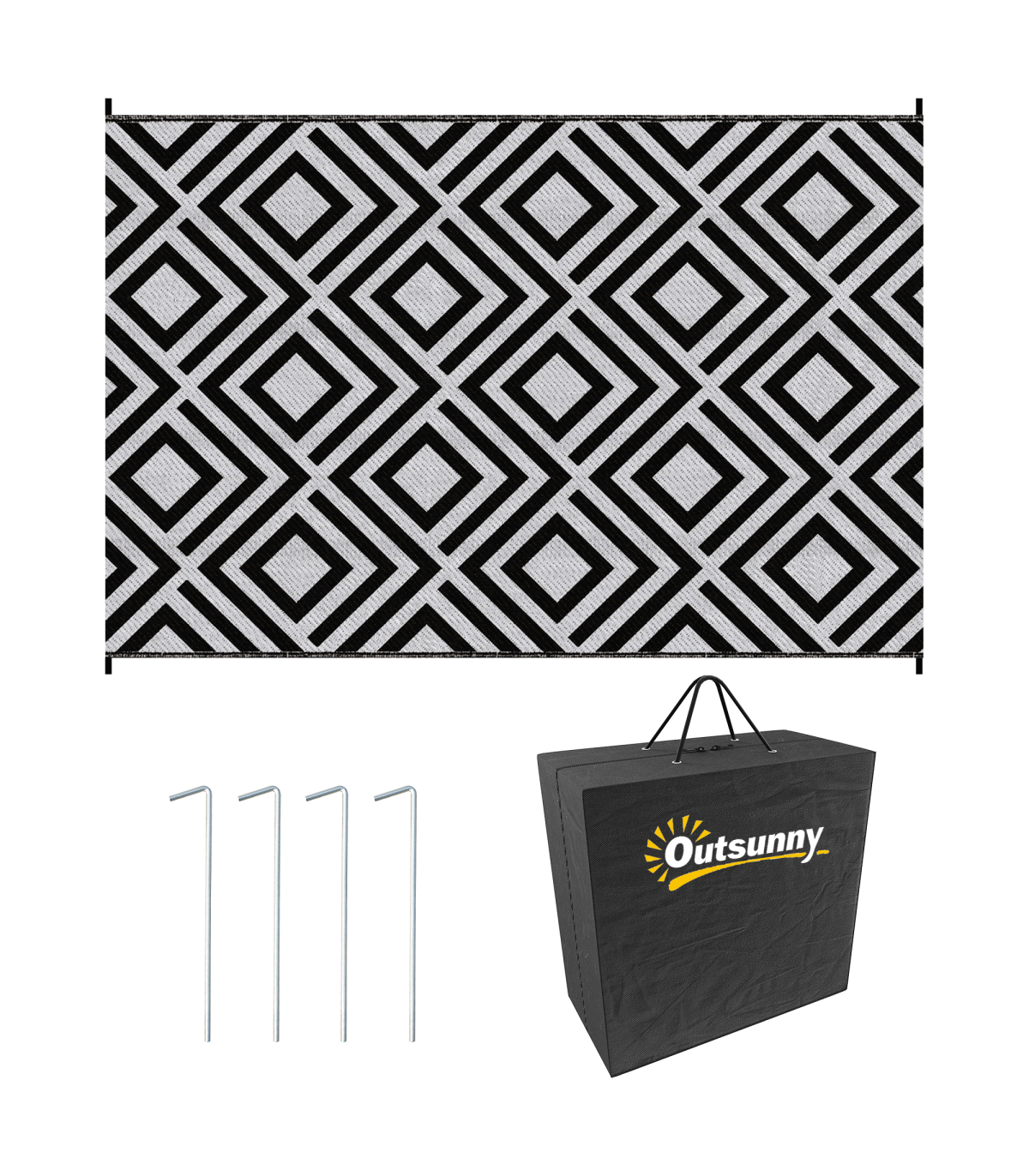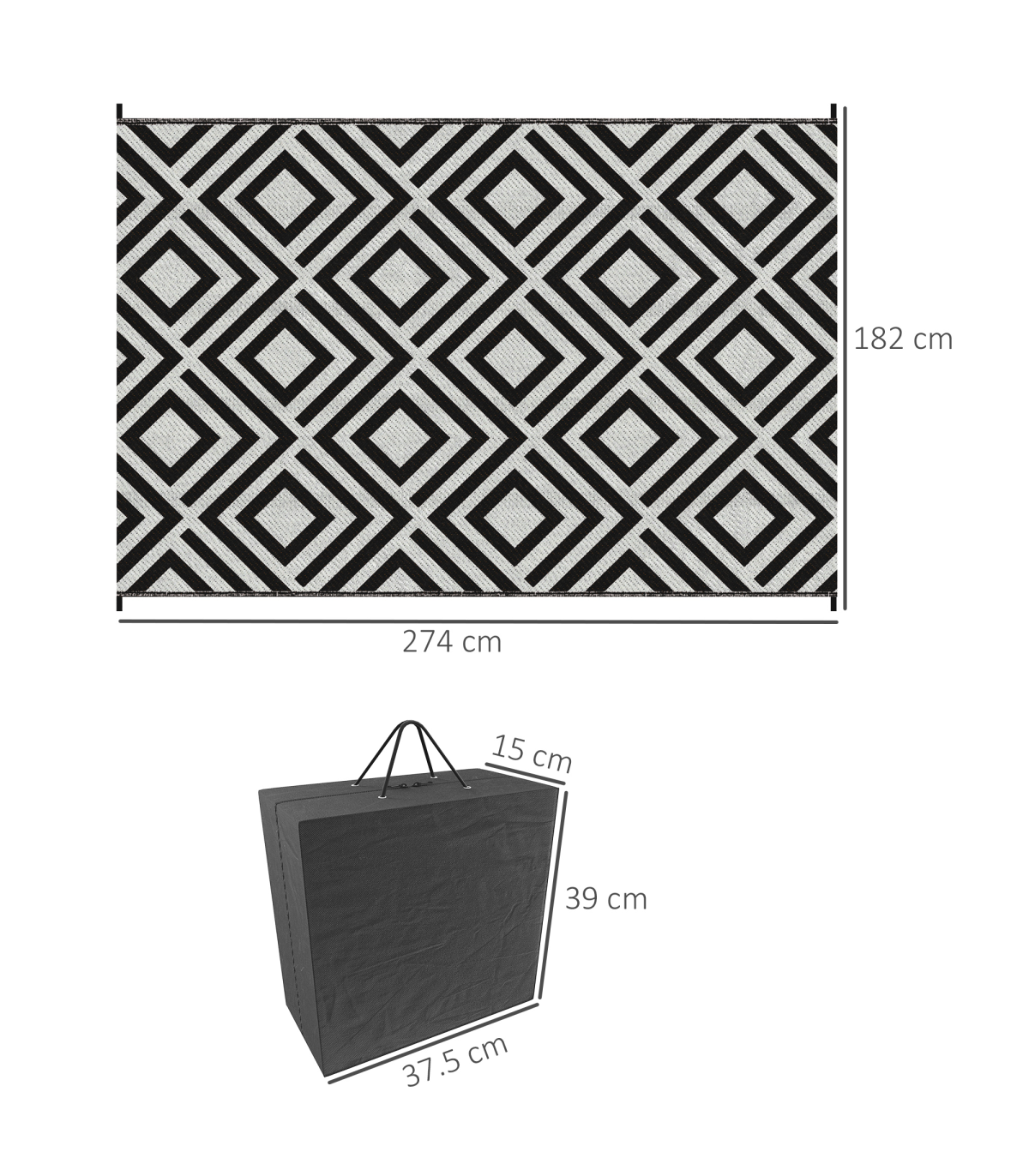 - "Outsunny Reversible Waterproof Outdoor Rug with Carry Bag, 182 x 274 cm, Black" - Description: - Suitable for camping, picnic, RV road tour, etc. - Simply fold and take wherever you want - Reversible design, both sides can be used - Made from polypropylene, with a protective coating to help prevent sun fading and damage - Corner straps and ground nails to pin into place in the ground - Style: Black and White Rhombus - Material: 310g/m² PP, Non-woven Fabric, Plastic - Overall Dimension: 182 x 274 cm - Carry Bag Dimension: 39L x 37.5W x 15H cm - Item Label: 844-637V01BK - NOTE: This garden carpet is not fireproof, please keep it away from fire.