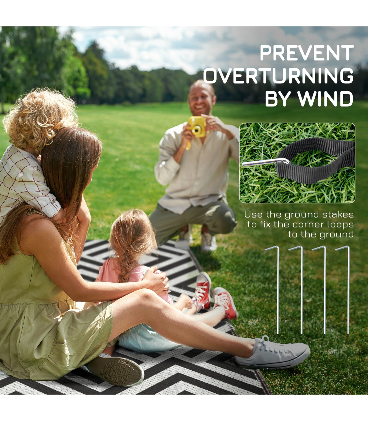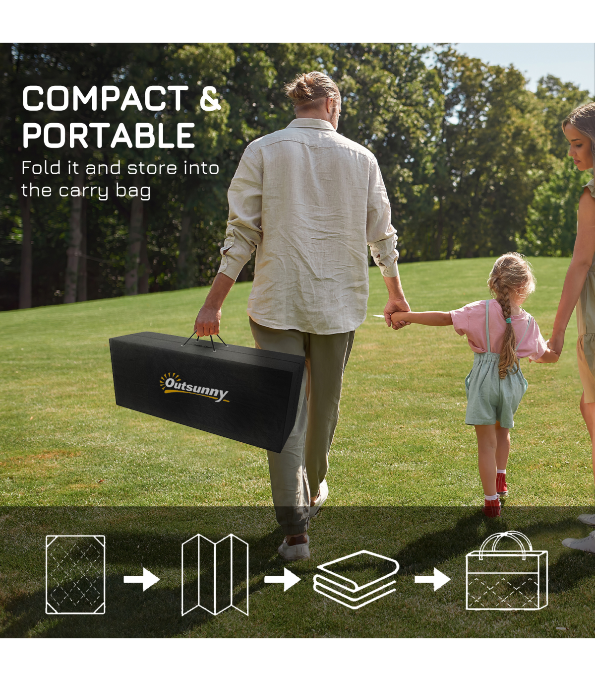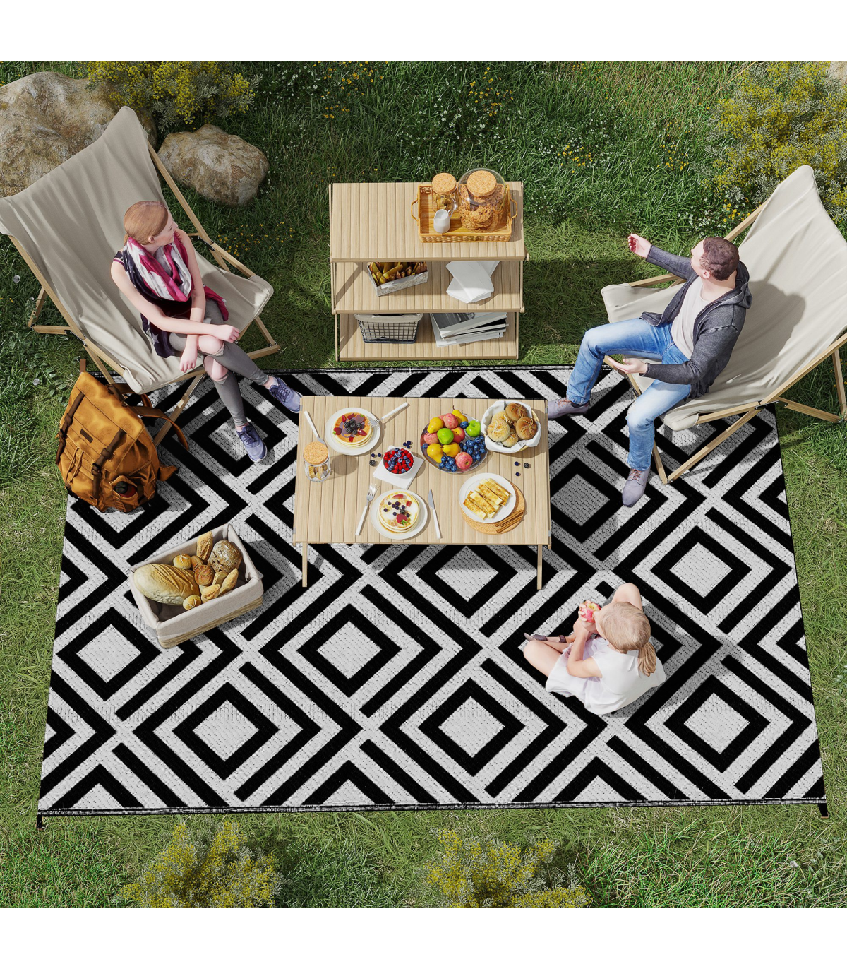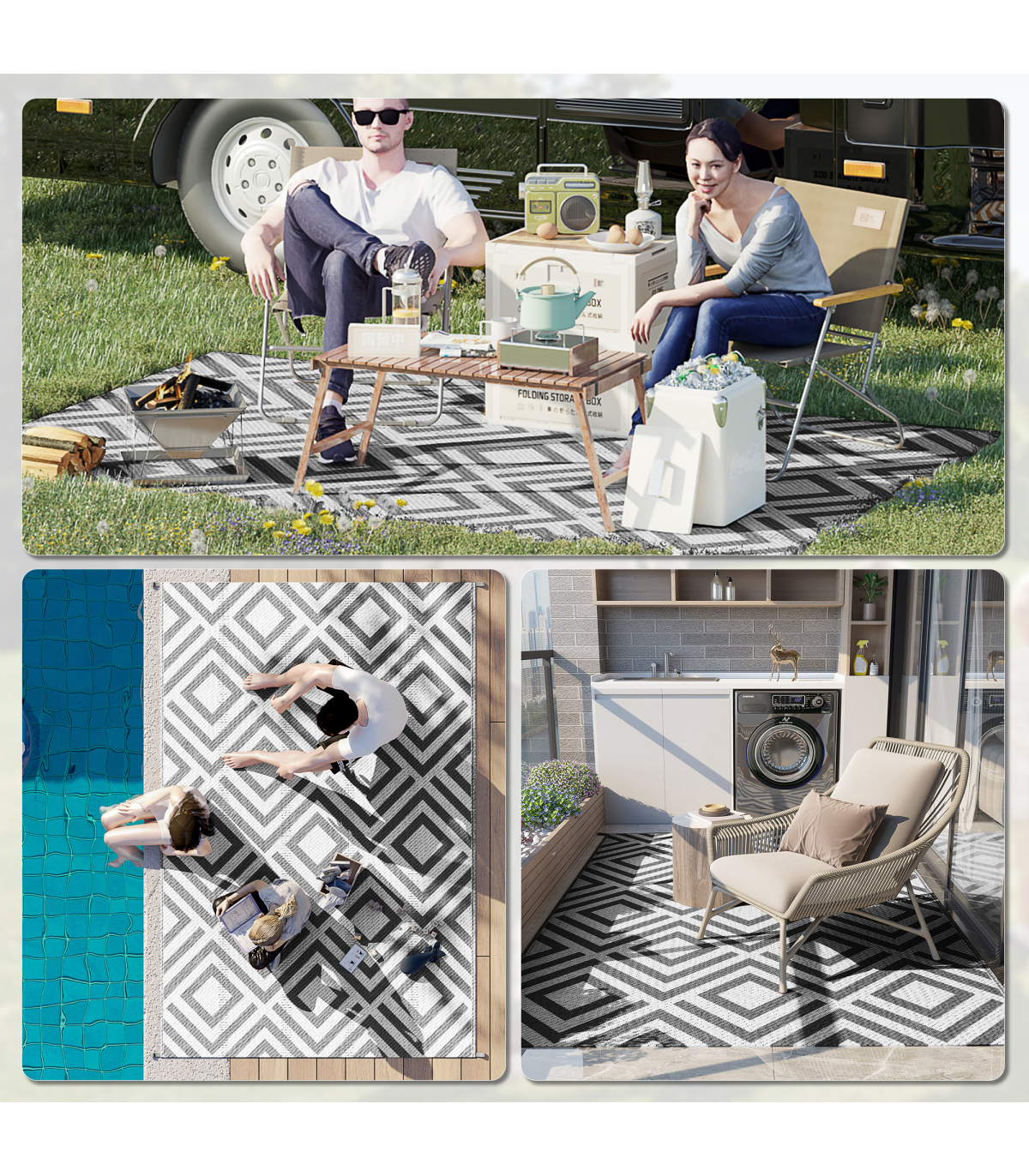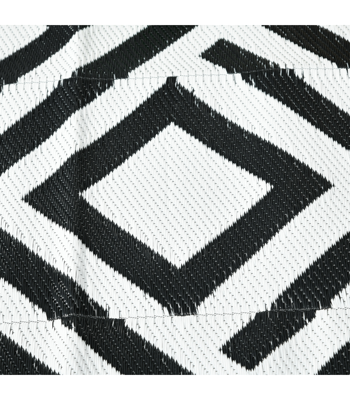 - "Outsunny Reversible Waterproof Outdoor Rug with Carry Bag, 182 x 274 cm, Black" - Description: - Suitable for camping, picnic, RV road tour, etc. - Simply fold and take wherever you want - Reversible design, both sides can be used - Made from polypropylene, with a protective coating to help prevent sun fading and damage - Corner straps and ground nails to pin into place in the ground - Style: Black and White Rhombus - Material: 310g/m² PP, Non-woven Fabric, Plastic - Overall Dimension: 182 x 274 cm - Carry Bag Dimension: 39L x 37.5W x 15H cm - Item Label: 844-637V01BK - NOTE: This garden carpet is not fireproof, please keep it away from fire.