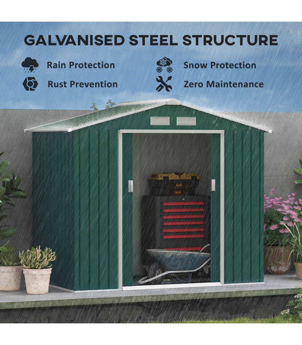 ● Galvanised steel structure is strong, with a protective top coat