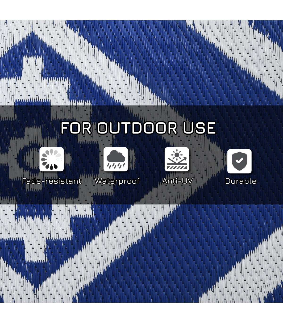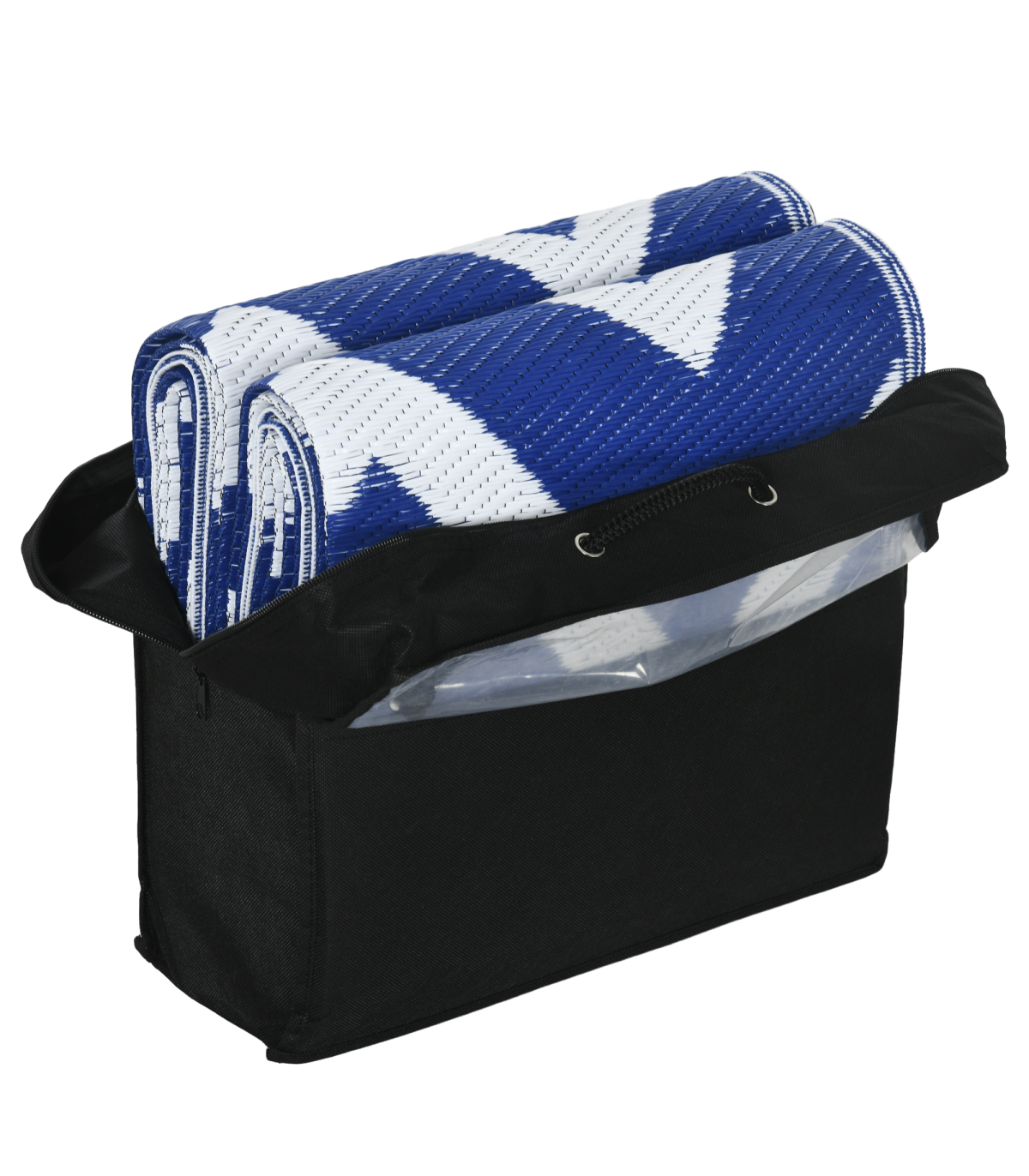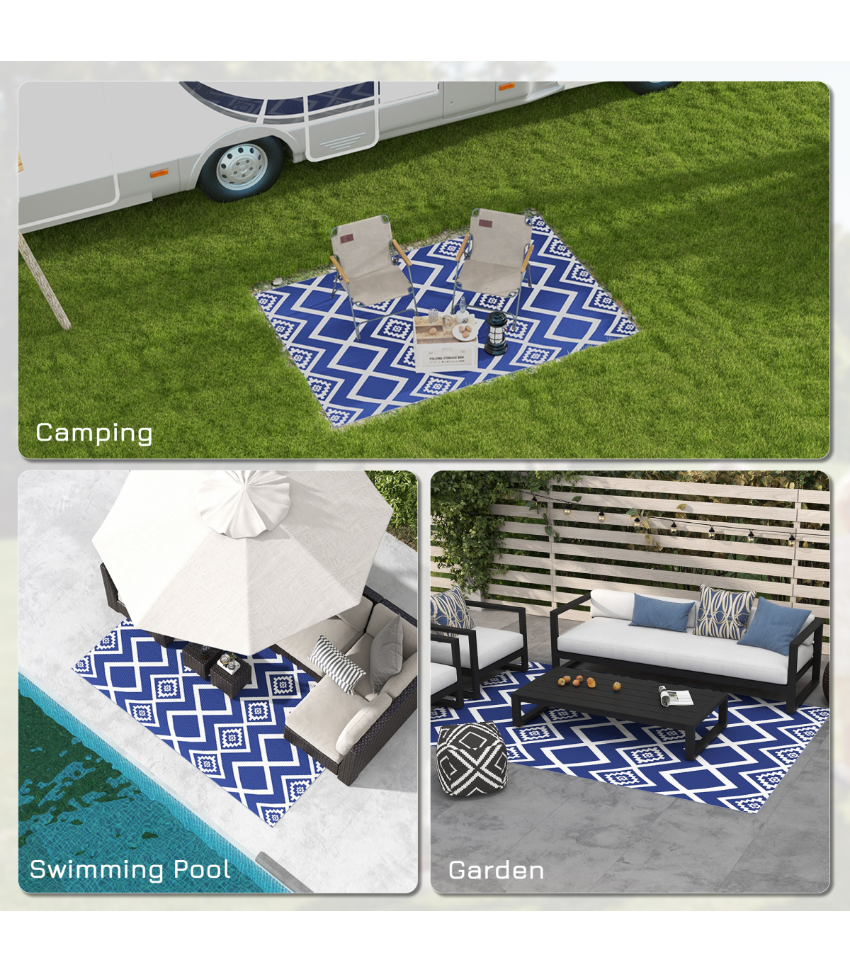 - "Outsunny Reversible Waterproof Outdoor Rug with Carry Bag, 182 x 274cm, Blue" - Description: - Suitable for camping, picnics, days at the park etc. - Simply fold and take wherever you want - Reversible design, both sides can be used - Made from polypropylene, with a protective coating to help prevent sun fading and damage - Carry bag included - Style: Geometric - Colour: Blue and White - Material: 310g/m² PP, Non-woven Fabric - Overall Size: 182 x 274cm - Thickness: 0.3cm - Carry Bag Size: 39L x 37.5W x 15Hcm - Item Label: 844-784V00MX - Note: This garden carpet is not fireproof, please keep it away from fire.