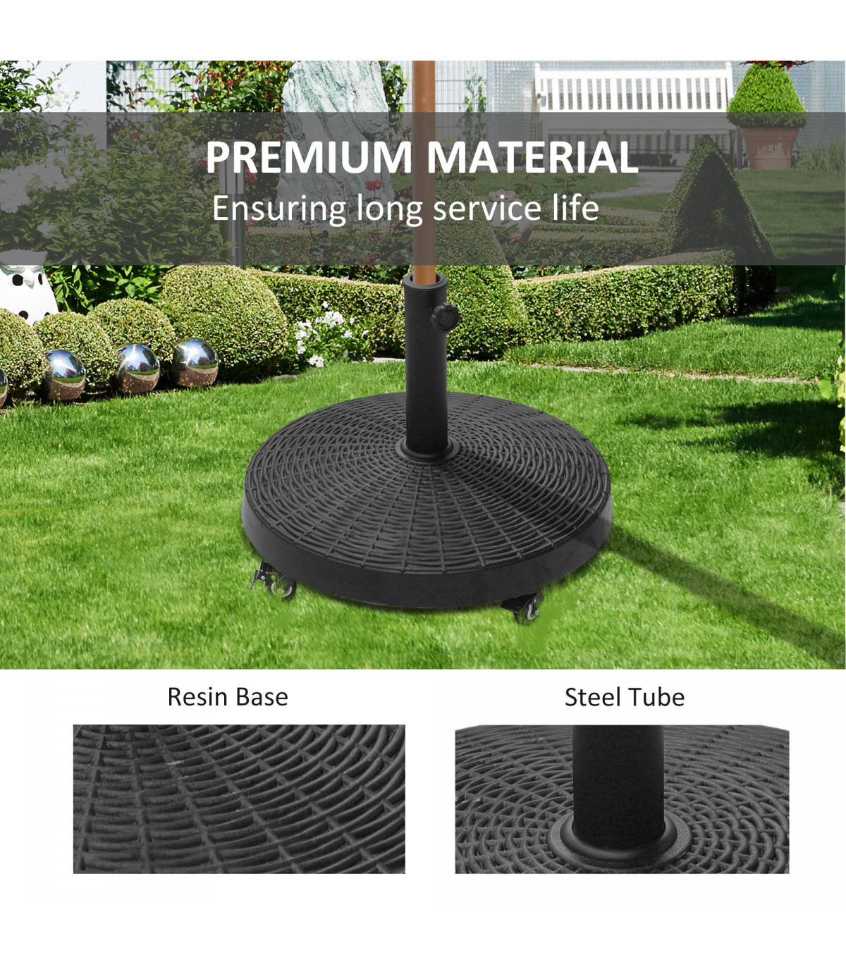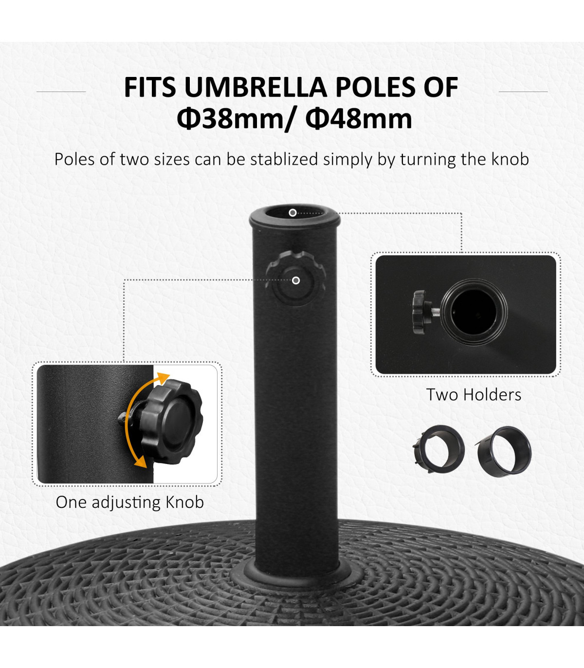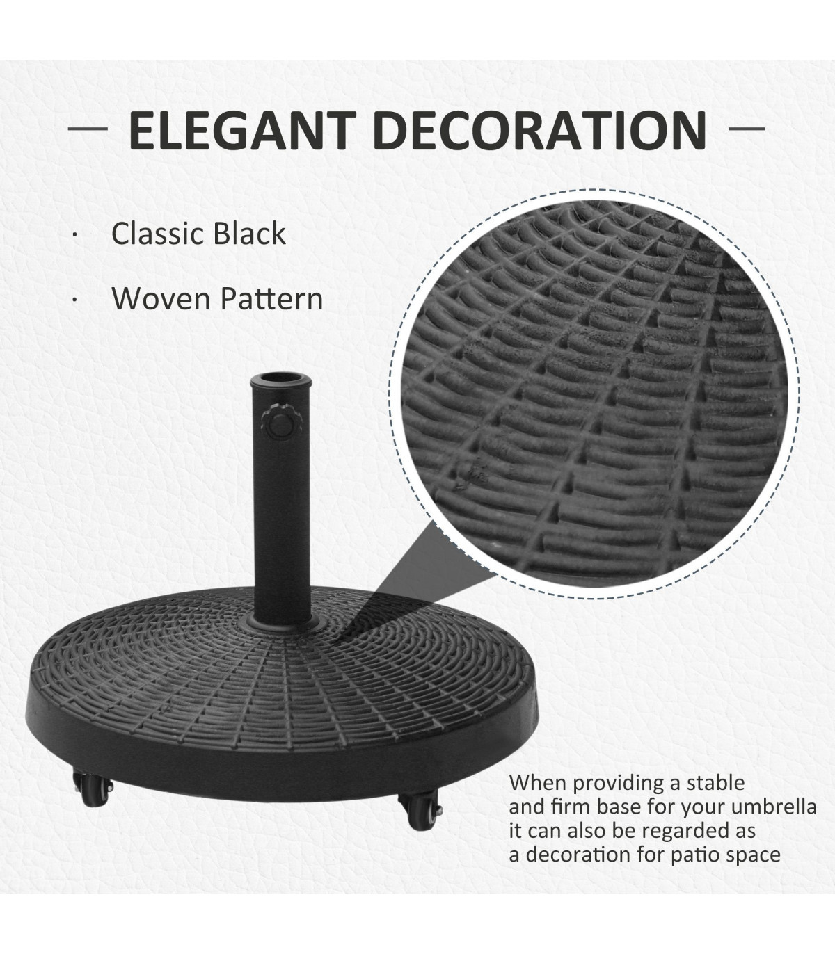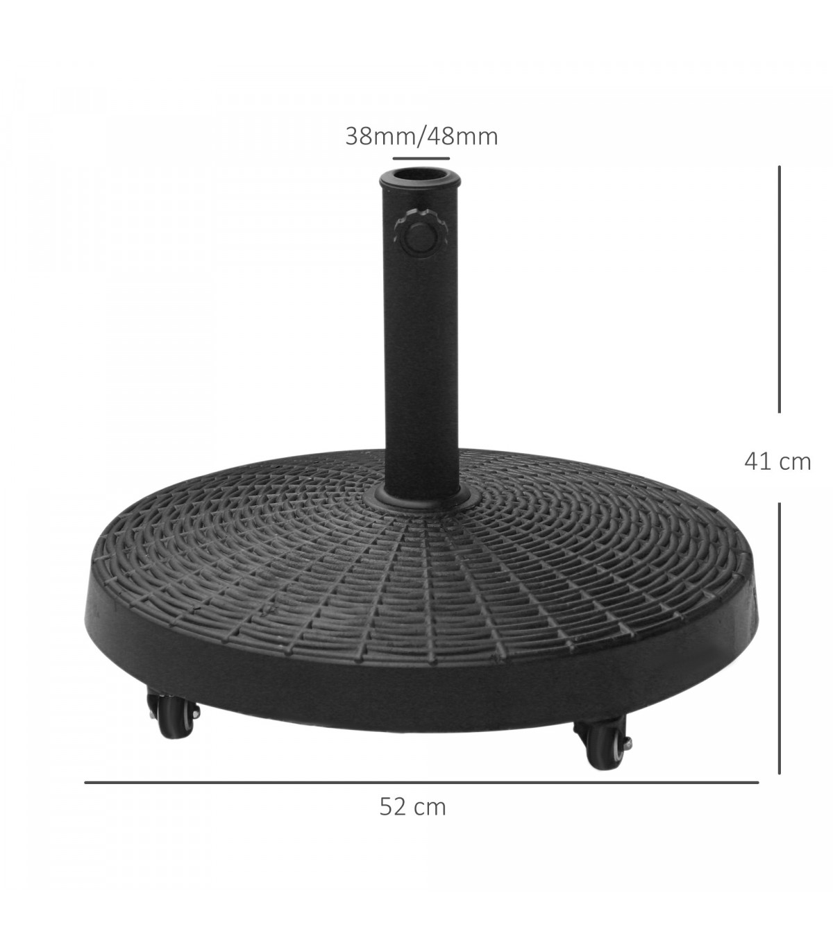 Description: "Keep your parasol umbrella securely in place with this base from Outsunny. Made from polyresin and steel for durability, it is crafted into a stylish rattan style design to seamlessly blend into your garden furniture. Four wheels on the bottom allow for easy movement, with brakes to keep it in place when needed. The base features a tightening screw that accommodates both 38mm and 48mm pole diameters. It's perfect for keeping your sun shade in place all day long.