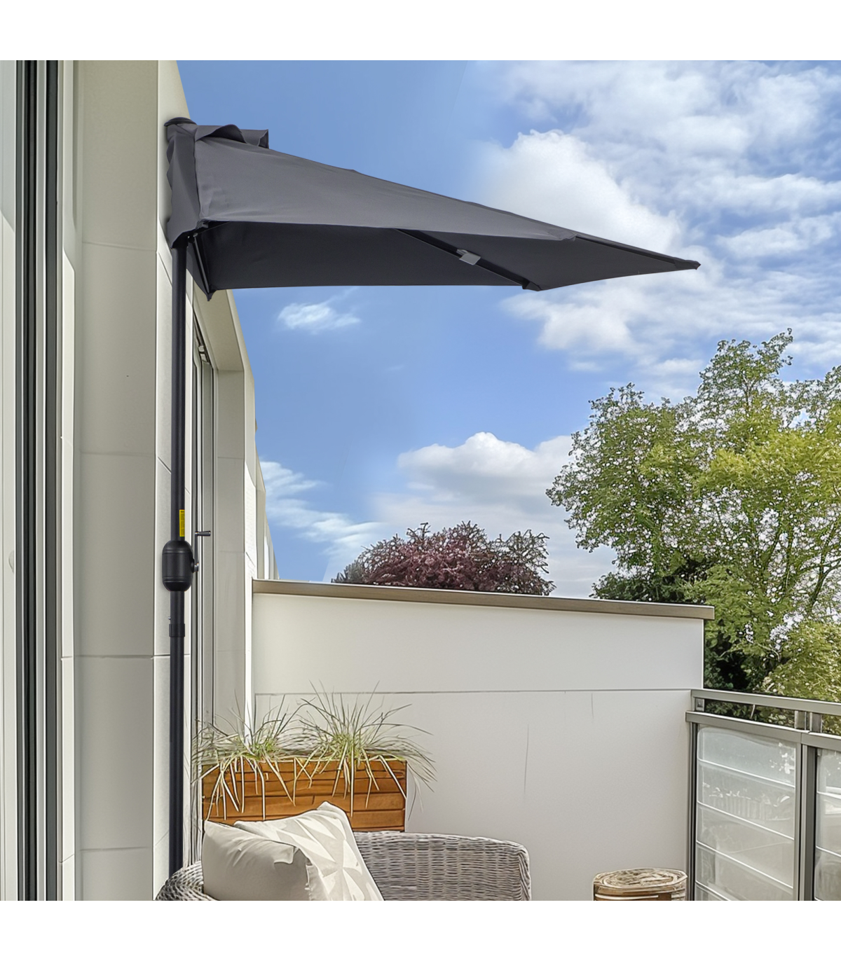 This Outsunny half round parasol is a great addition to anyone who wishes to have a balcony parasol half but has limited space. This parasol half round is ideal for balconies or small gardens and someone who wishes to still have the illusion of a full parasol. The deck parasol is made from an metal frame and the covering is a UV resistant waterproof PE cloth. Wall Half Semi Round Umbrella is a great product and a great solution for any balcony or patio.