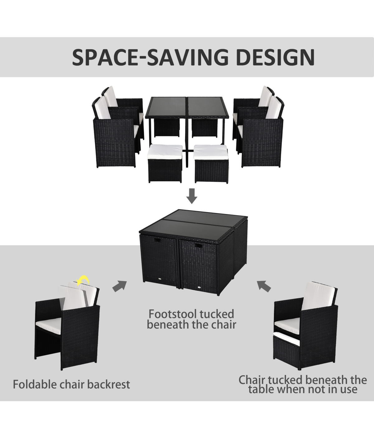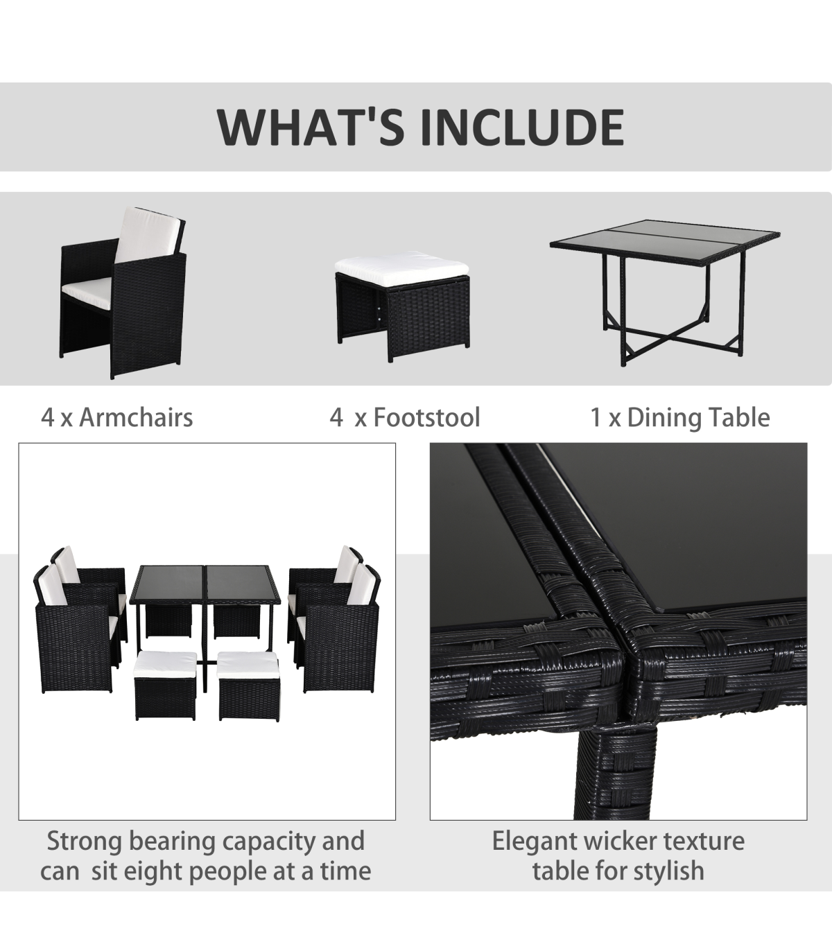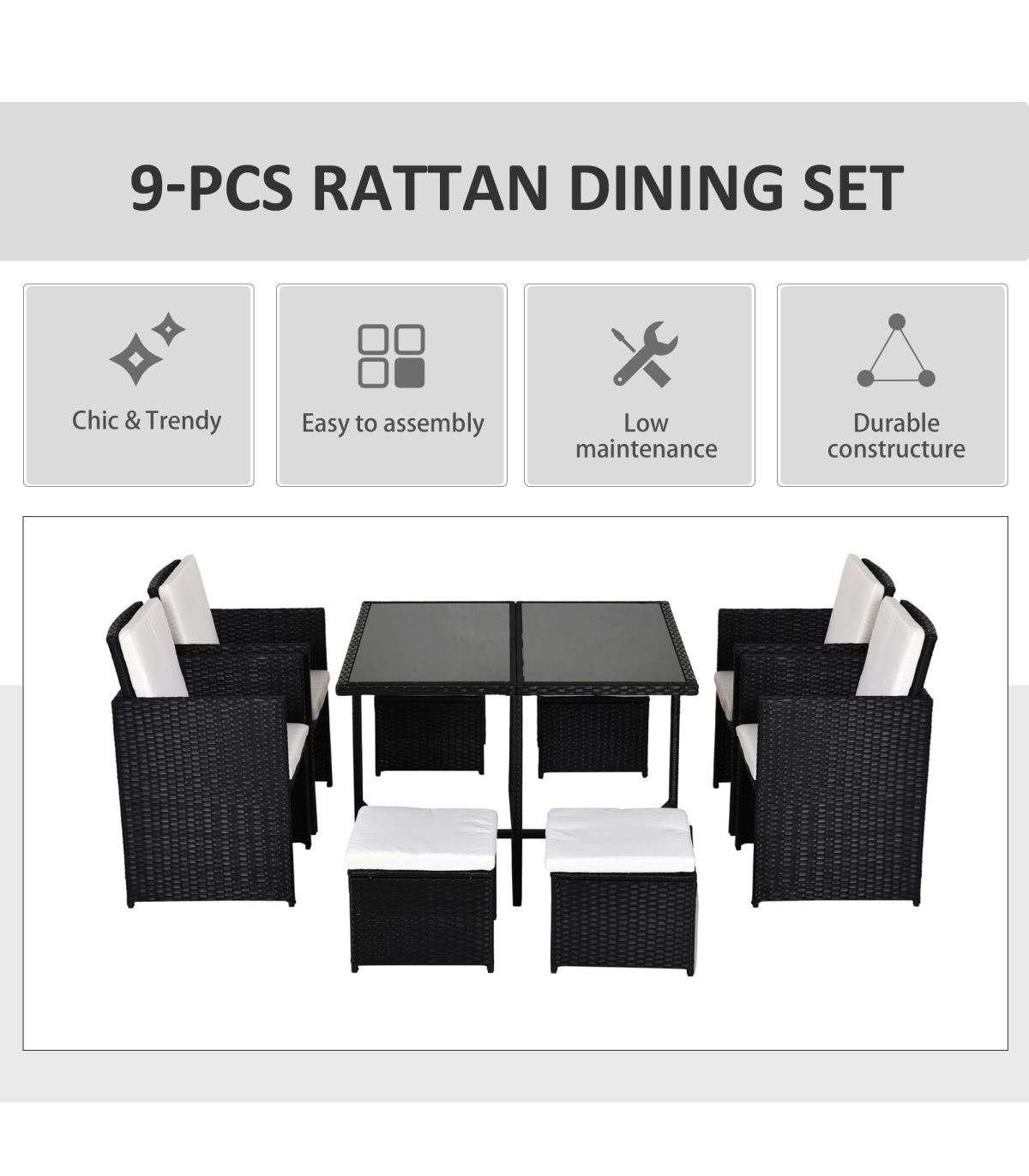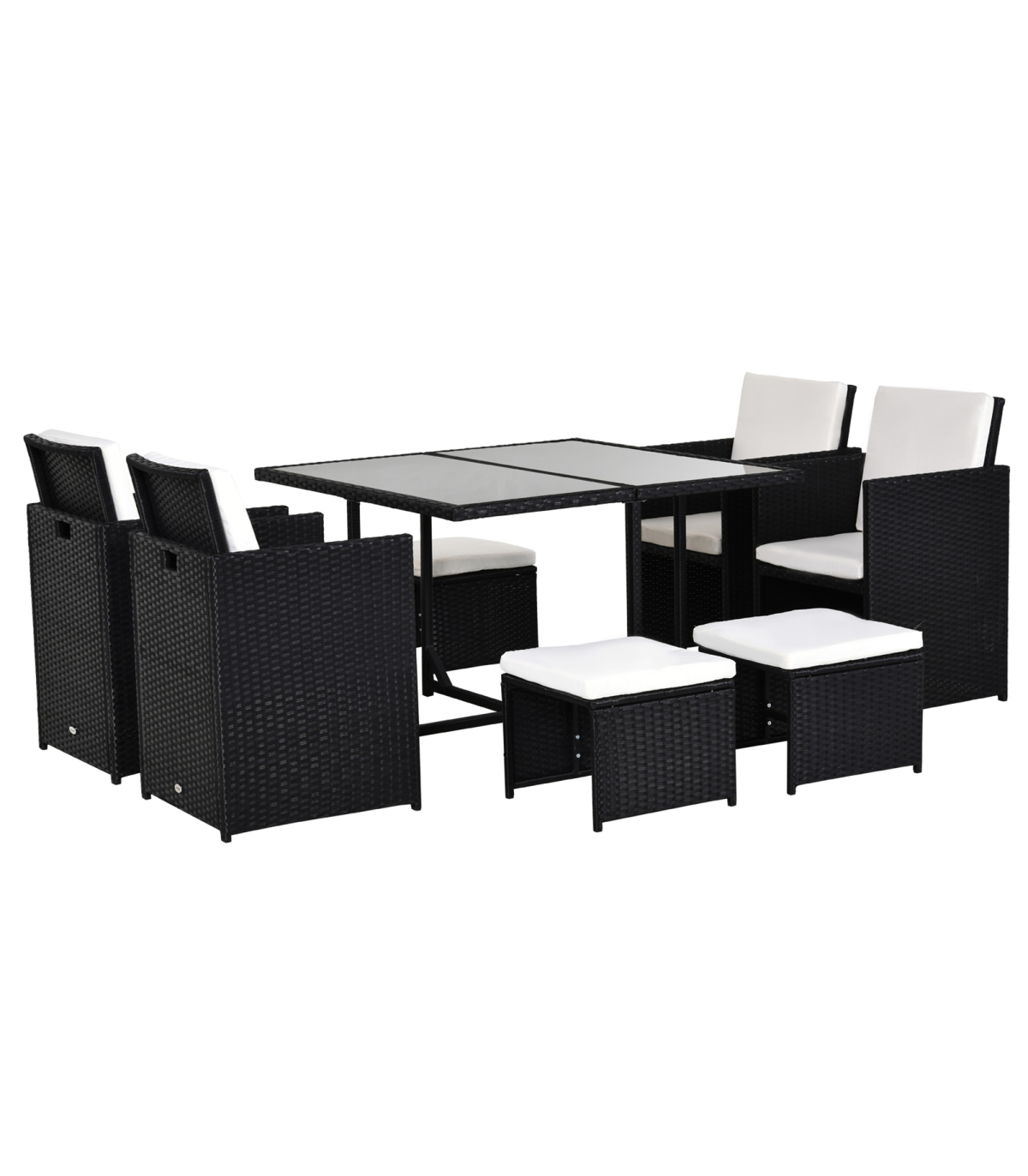 Rattan 9 Pcs Dining Set - Black W/Milk White Cushions