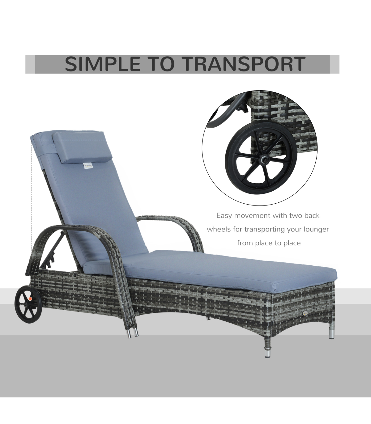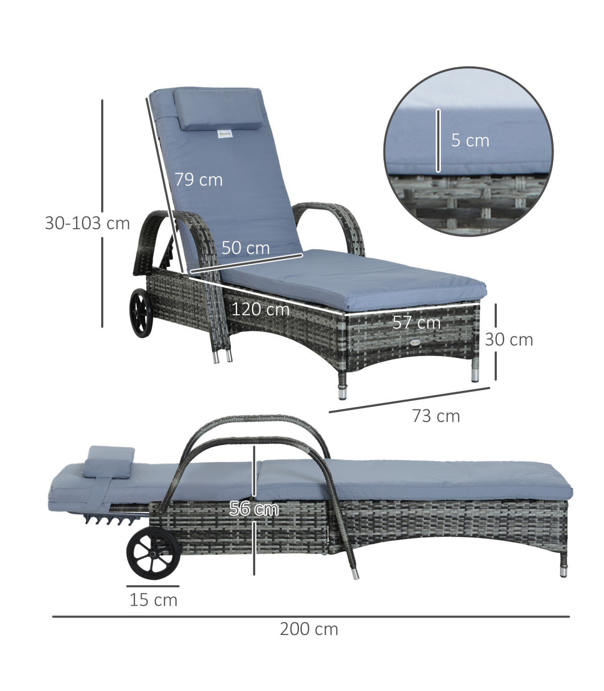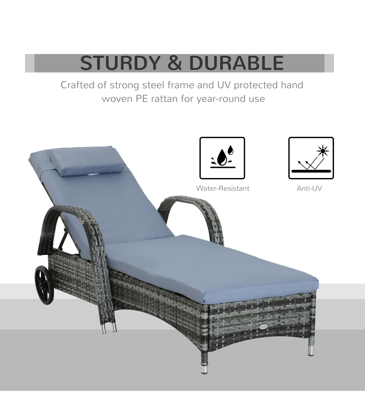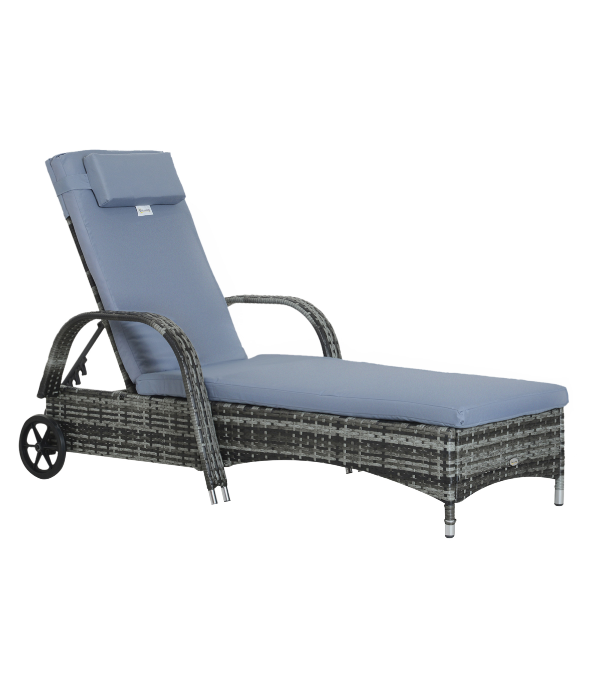 Soak up the sun with this Rattan Lounger from Outsunny. Made from weather-resistant PE wicker with a strong steel frame underneath the base is extremely sturdy and will provide you with many years of relaxation outside. On the top there is a thick foam cushion seat with a removable headrest for comfort and the back can be adjusted five different levels to suit your preferences. It is finished with two wheels to you can move it easily whenever you wish.