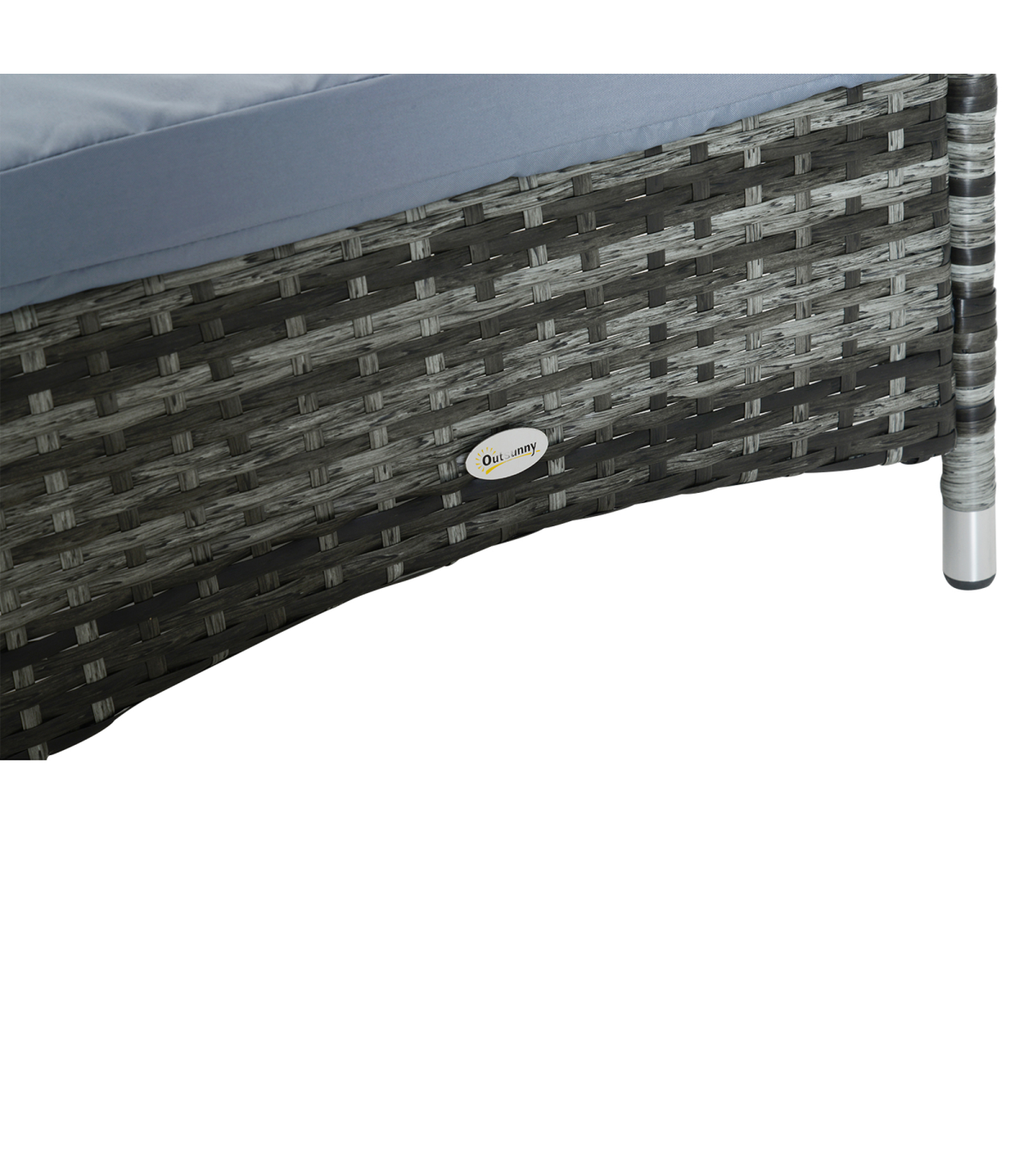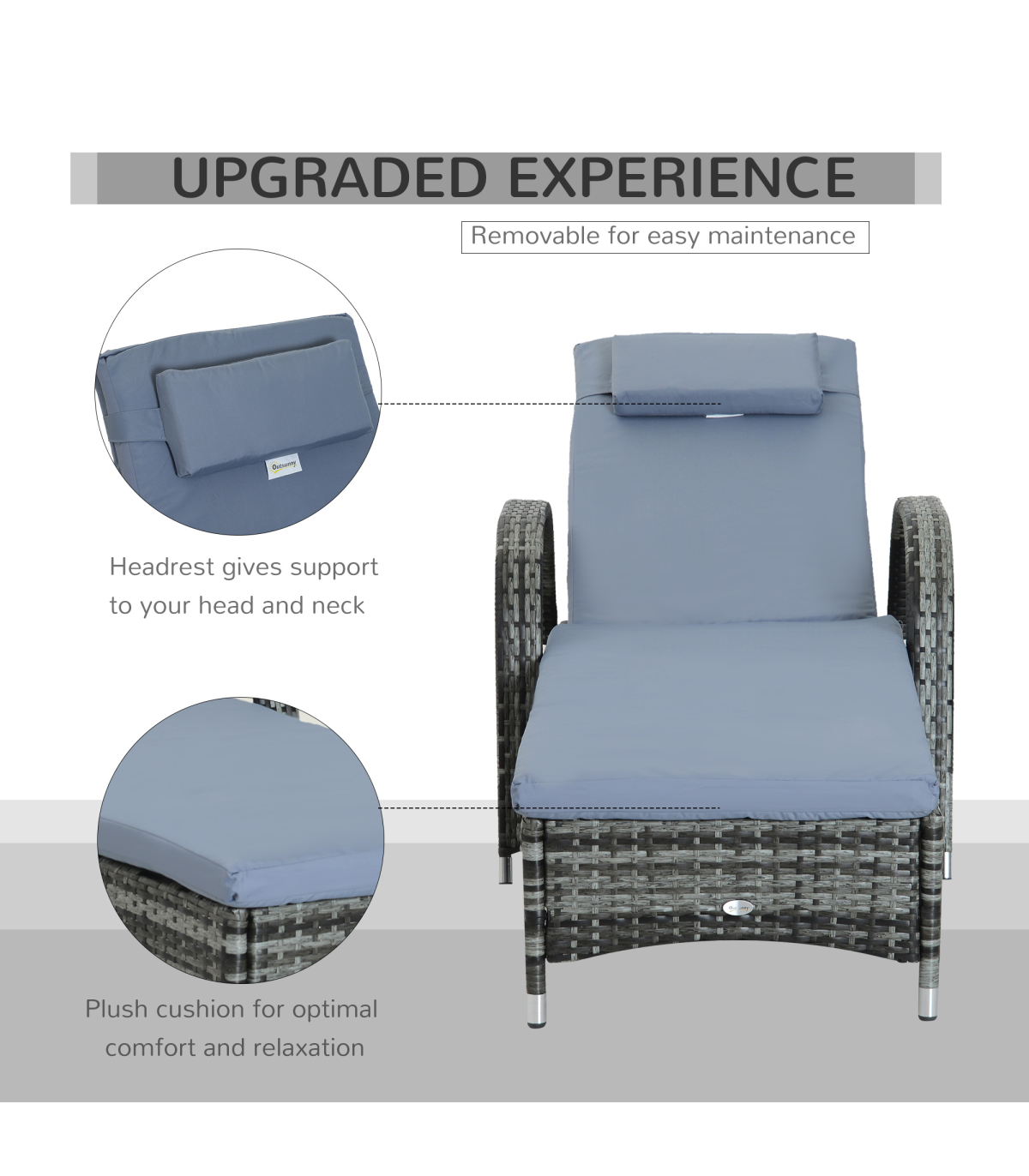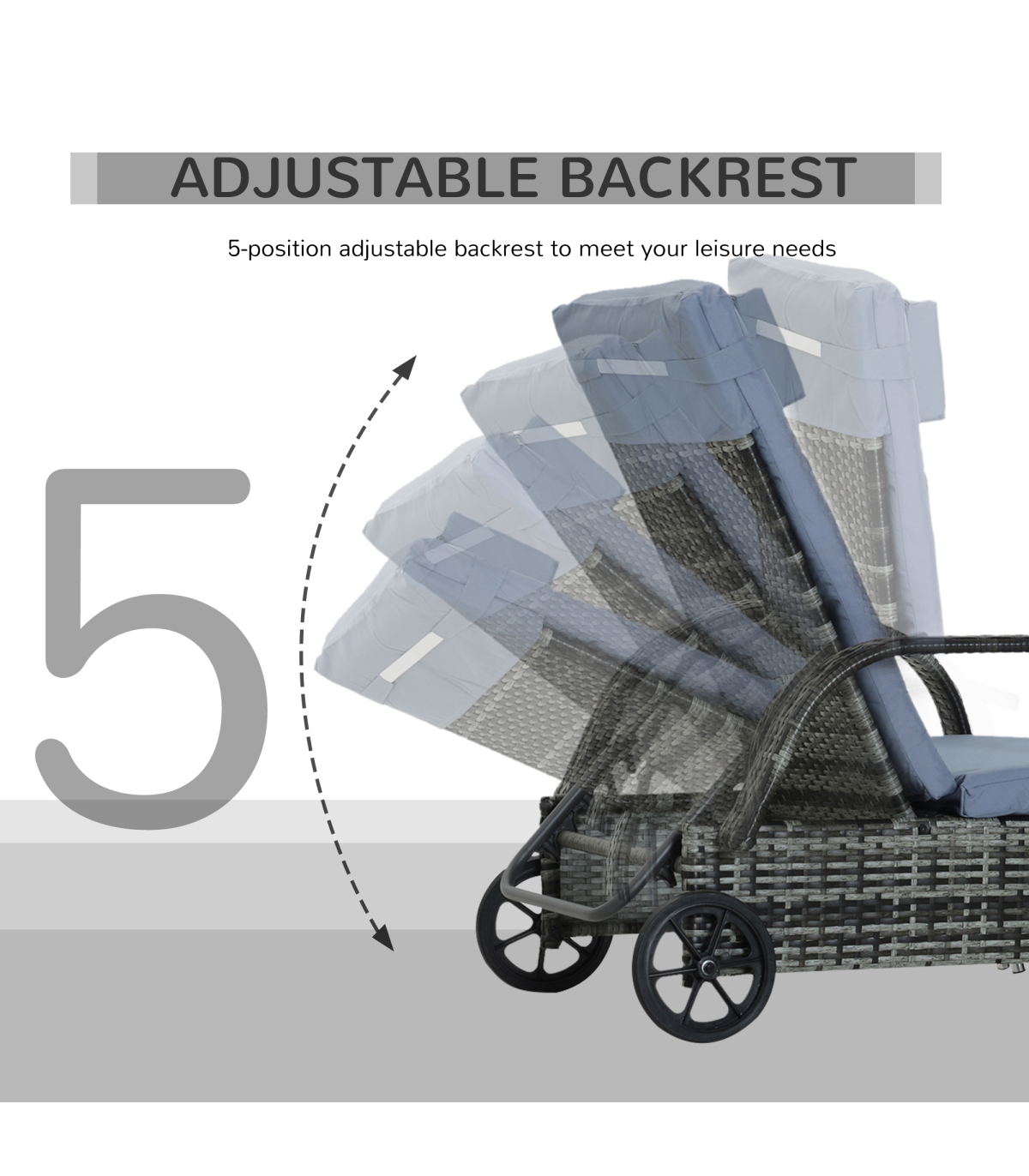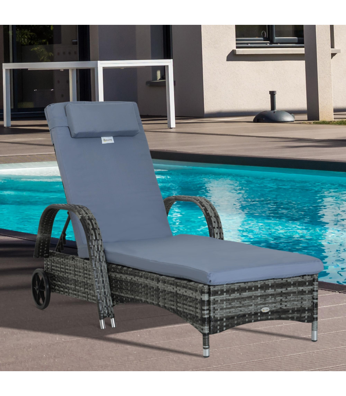 Soak up the sun with this Rattan Lounger from Outsunny. Made from weather-resistant PE wicker with a strong steel frame underneath the base is extremely sturdy and will provide you with many years of relaxation outside. On the top there is a thick foam cushion seat with a removable headrest for comfort and the back can be adjusted five different levels to suit your preferences. It is finished with two wheels to you can move it easily whenever you wish.