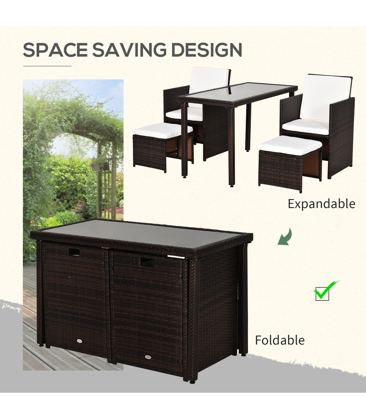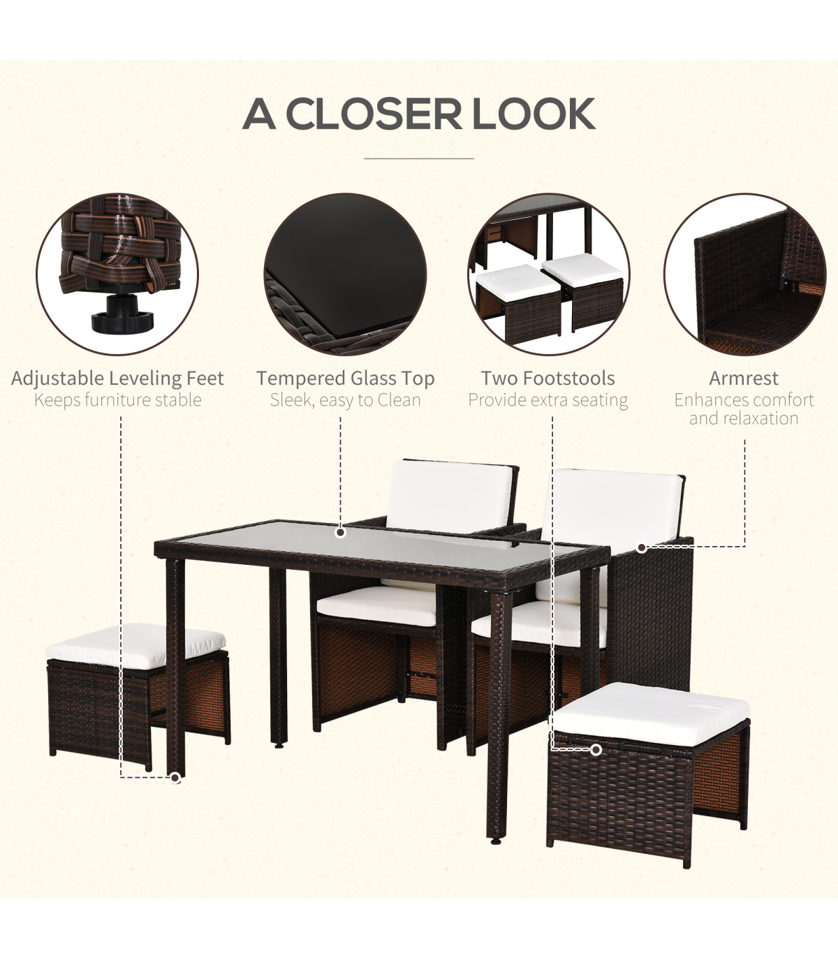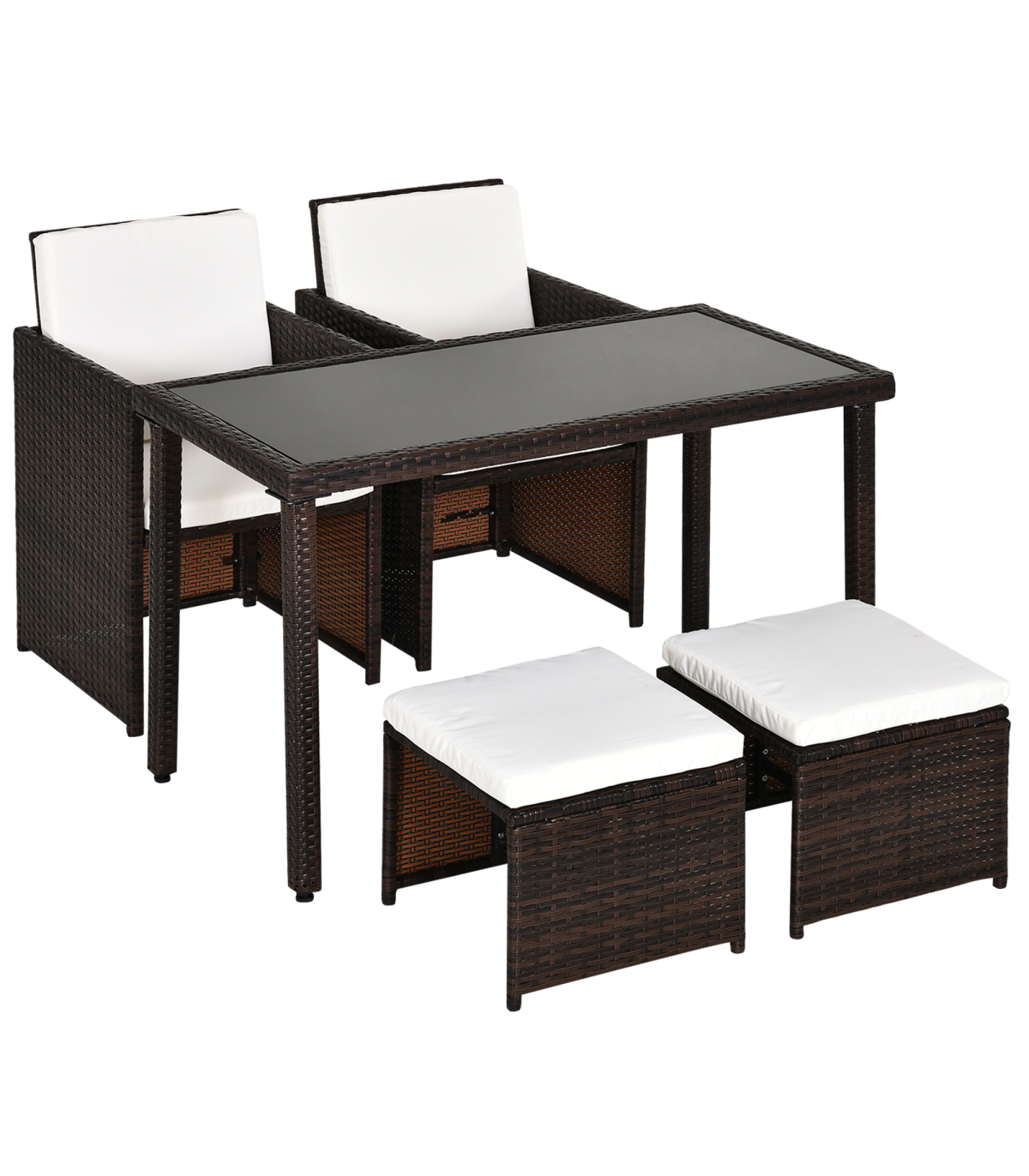 5 PCs Rattan Garden Furniture Wicker Weave Sofa Set Dining Table Chair Footrest" Description: - This Outsunny 5 piece rattan set is an ideal solution for a small garden, patio or conservatory. - Comes complete with 2 chairs, 2 footstools, and a table, ideal for any outdoor setting. - Made from a steel frame construction and covered with PE Rattan weave, this set will look perfect in any décor. - It also has the ability for the chairs and stools to fold under the table making it space friendly when not in use. - A great set to have while enjoying the summer, with the added luxury to dine if required. Features: - Contemporary design to fit any taste - Made from a metal frame construction and covered with PE rattan - Chairs and footrests can be stored under the table to save space when in need - Waterproof Seat and back cushions for comfort which can be removed for washing - Polyester fabric cushions with thick foam padding leave you resting comfortably for hours - Lightweight design making it easy to move if required.