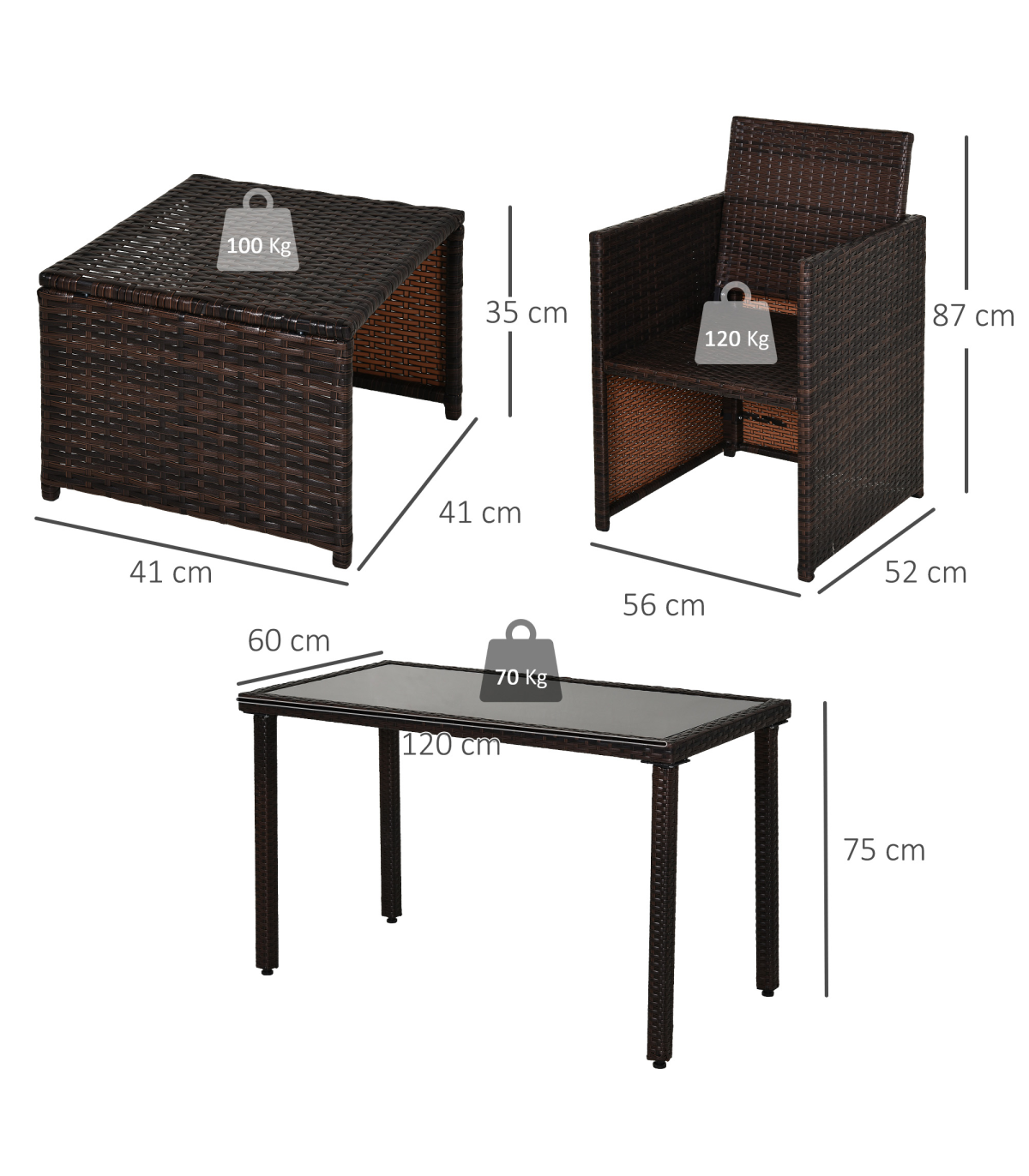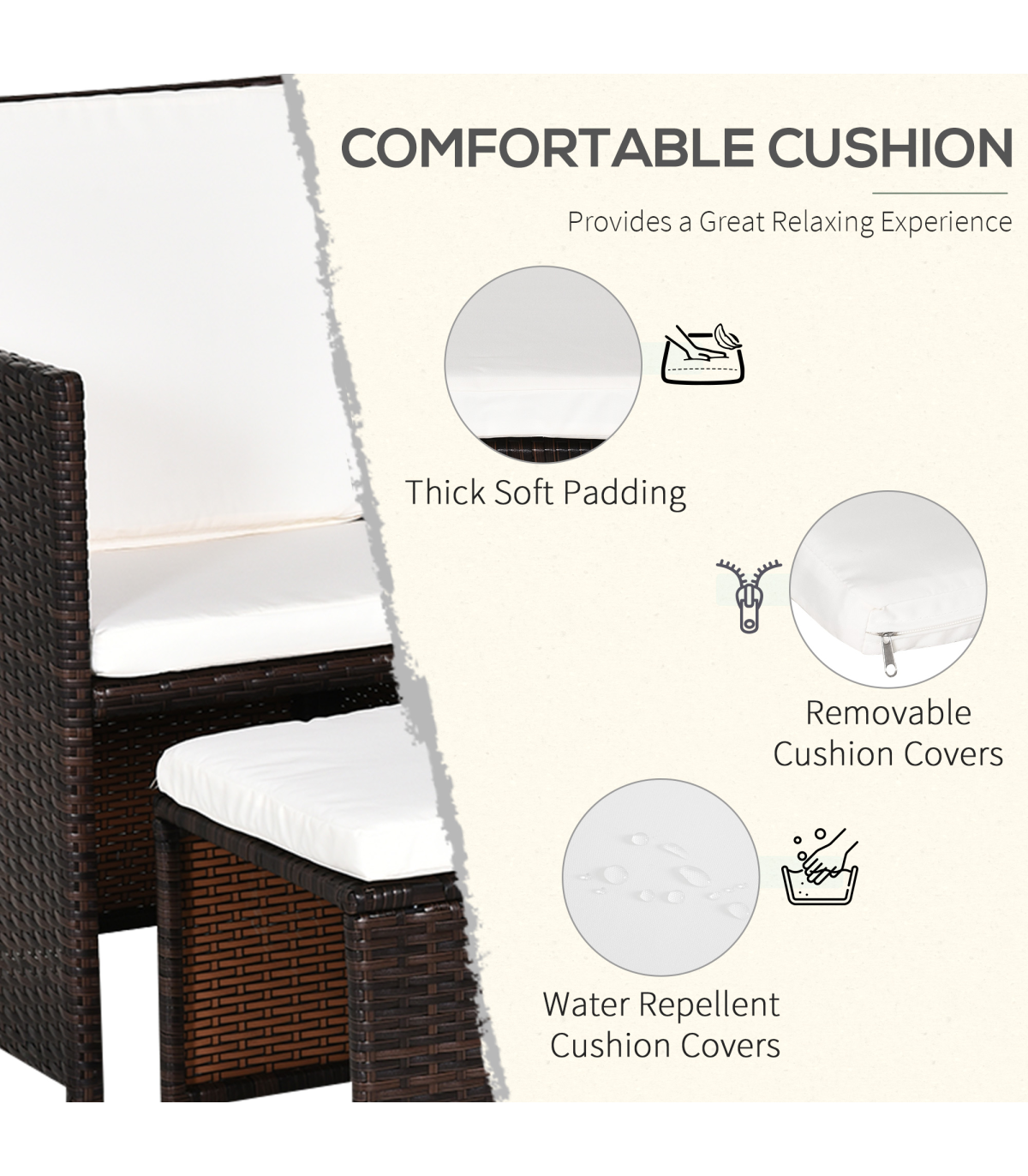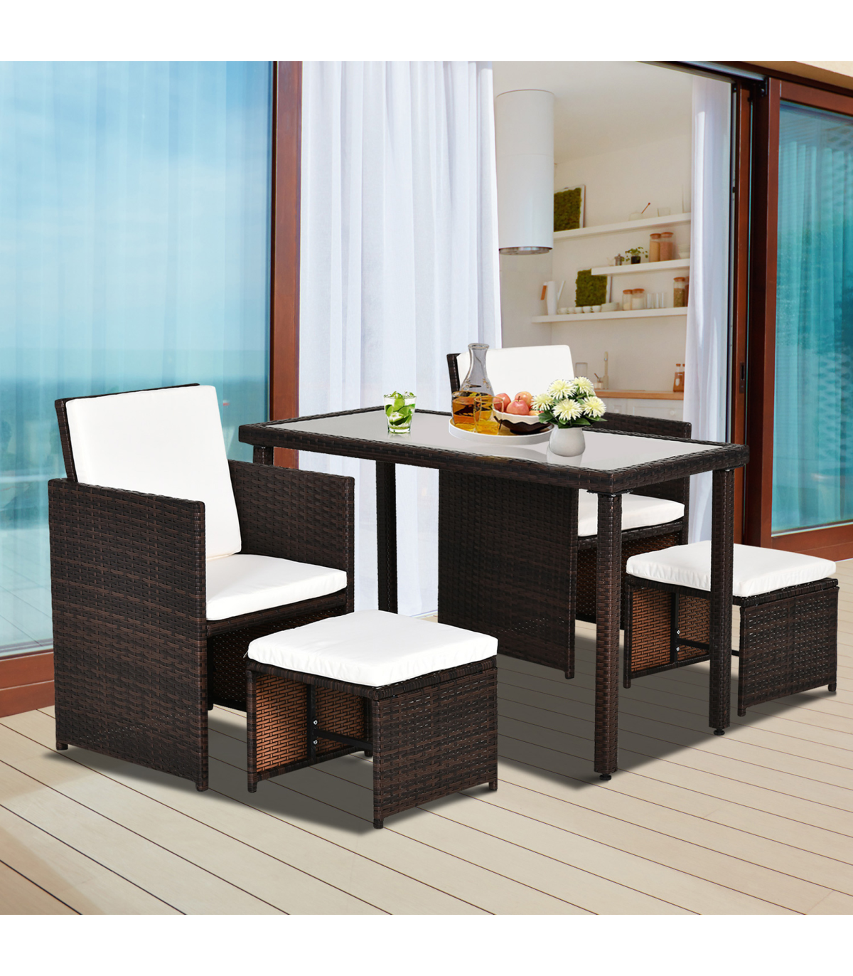 5 PCs Rattan Garden Furniture Wicker Weave Sofa Set Dining Table Chair Footrest" Description: - This Outsunny 5 piece rattan set is an ideal solution for a small garden, patio or conservatory. - Comes complete with 2 chairs, 2 footstools, and a table, ideal for any outdoor setting. - Made from a steel frame construction and covered with PE Rattan weave, this set will look perfect in any décor. - It also has the ability for the chairs and stools to fold under the table making it space friendly when not in use. - A great set to have while enjoying the summer, with the added luxury to dine if required. Features: - Contemporary design to fit any taste - Made from a metal frame construction and covered with PE rattan - Chairs and footrests can be stored under the table to save space when in need - Waterproof Seat and back cushions for comfort which can be removed for washing - Polyester fabric cushions with thick foam padding leave you resting comfortably for hours - Lightweight design making it easy to move if required.