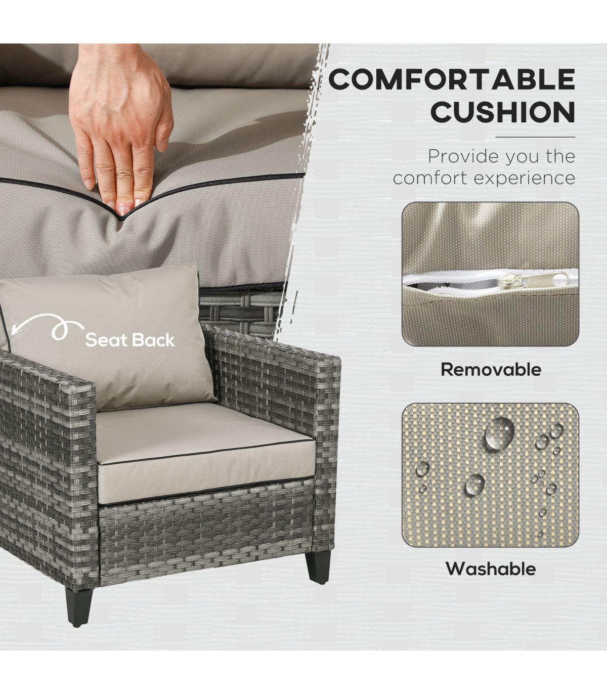 ● Cushions for comfort, with removable and washable covers