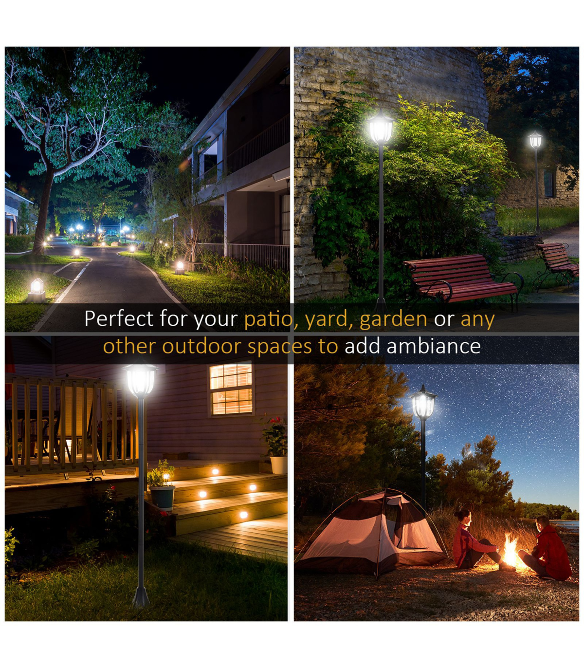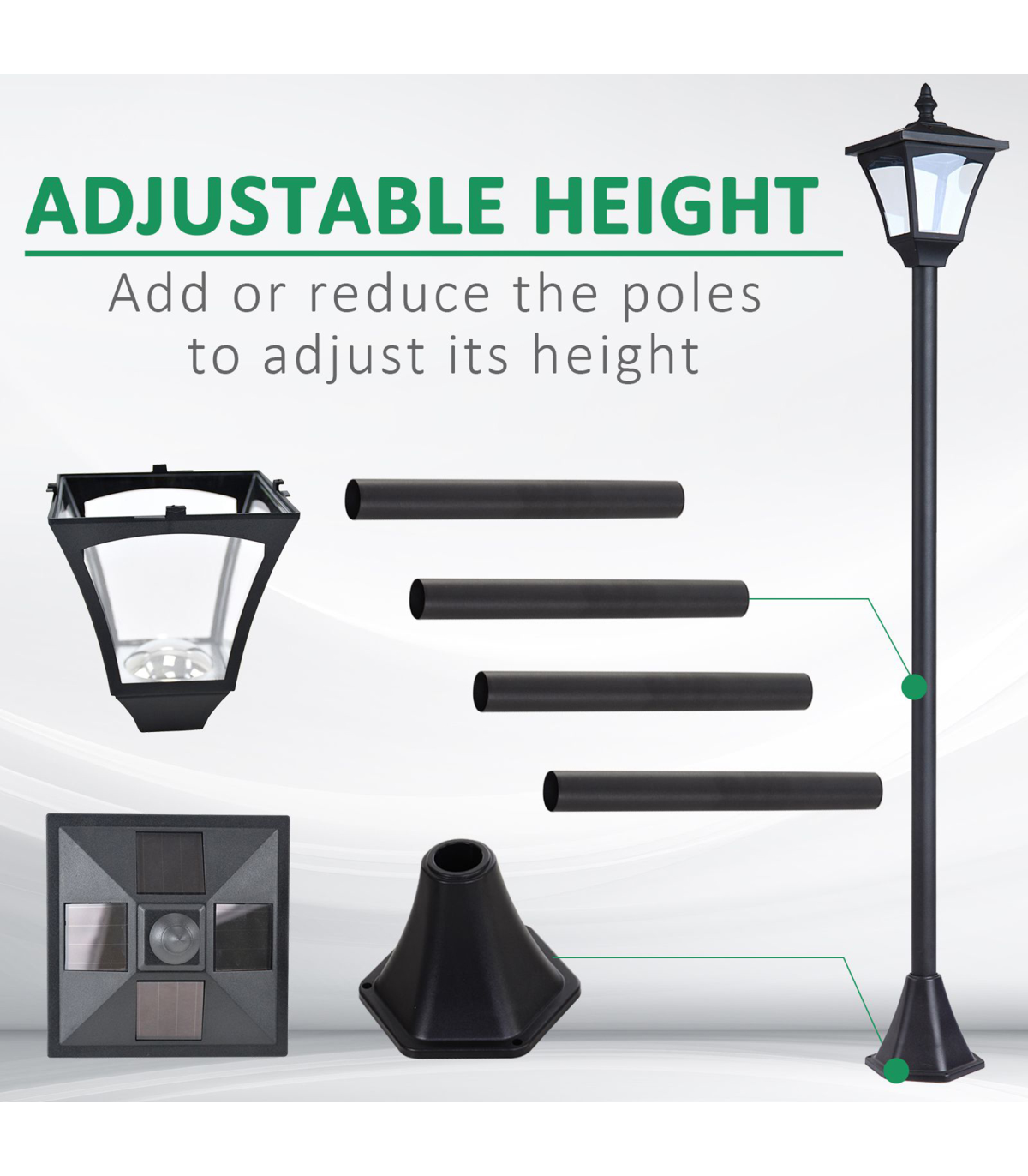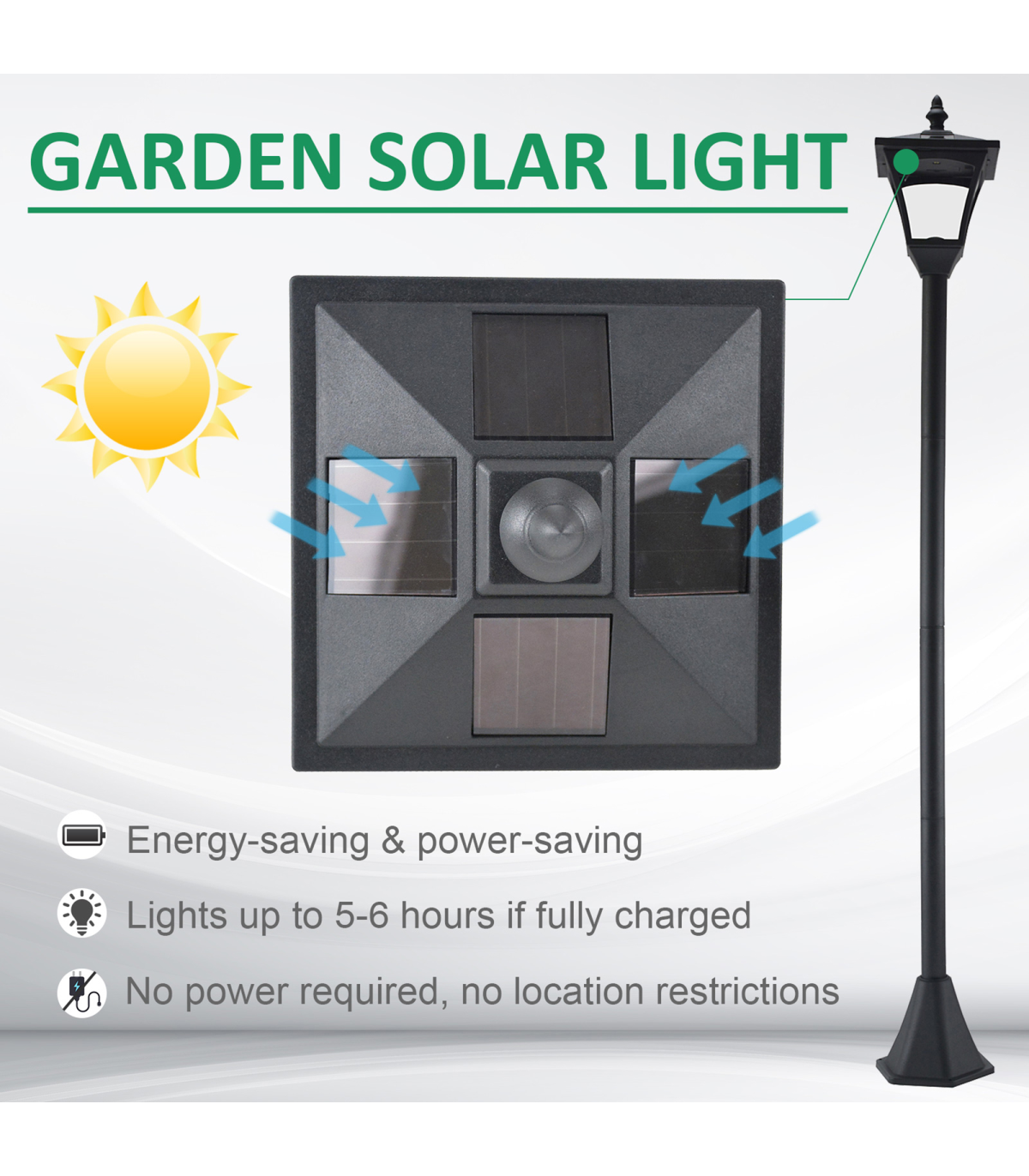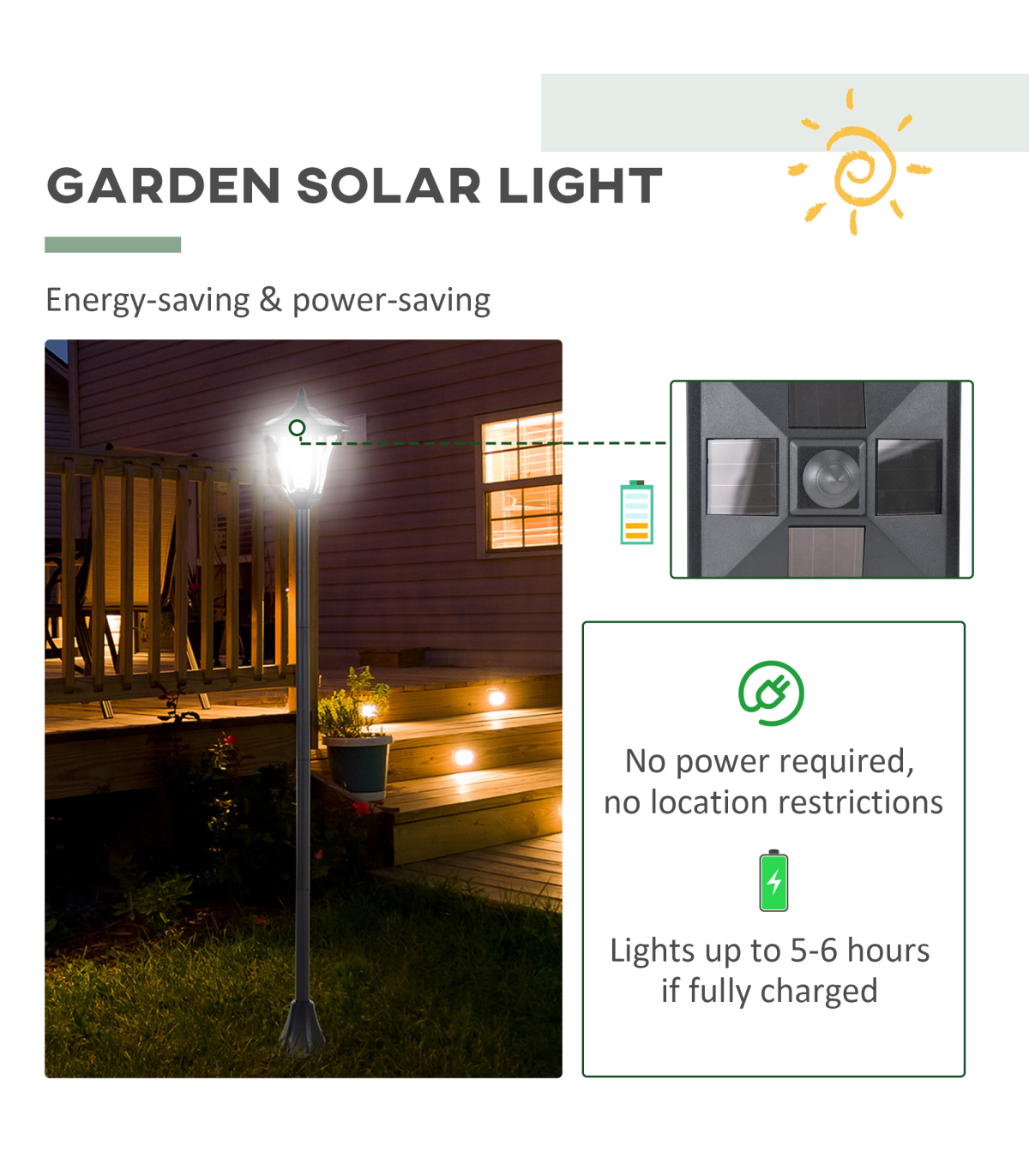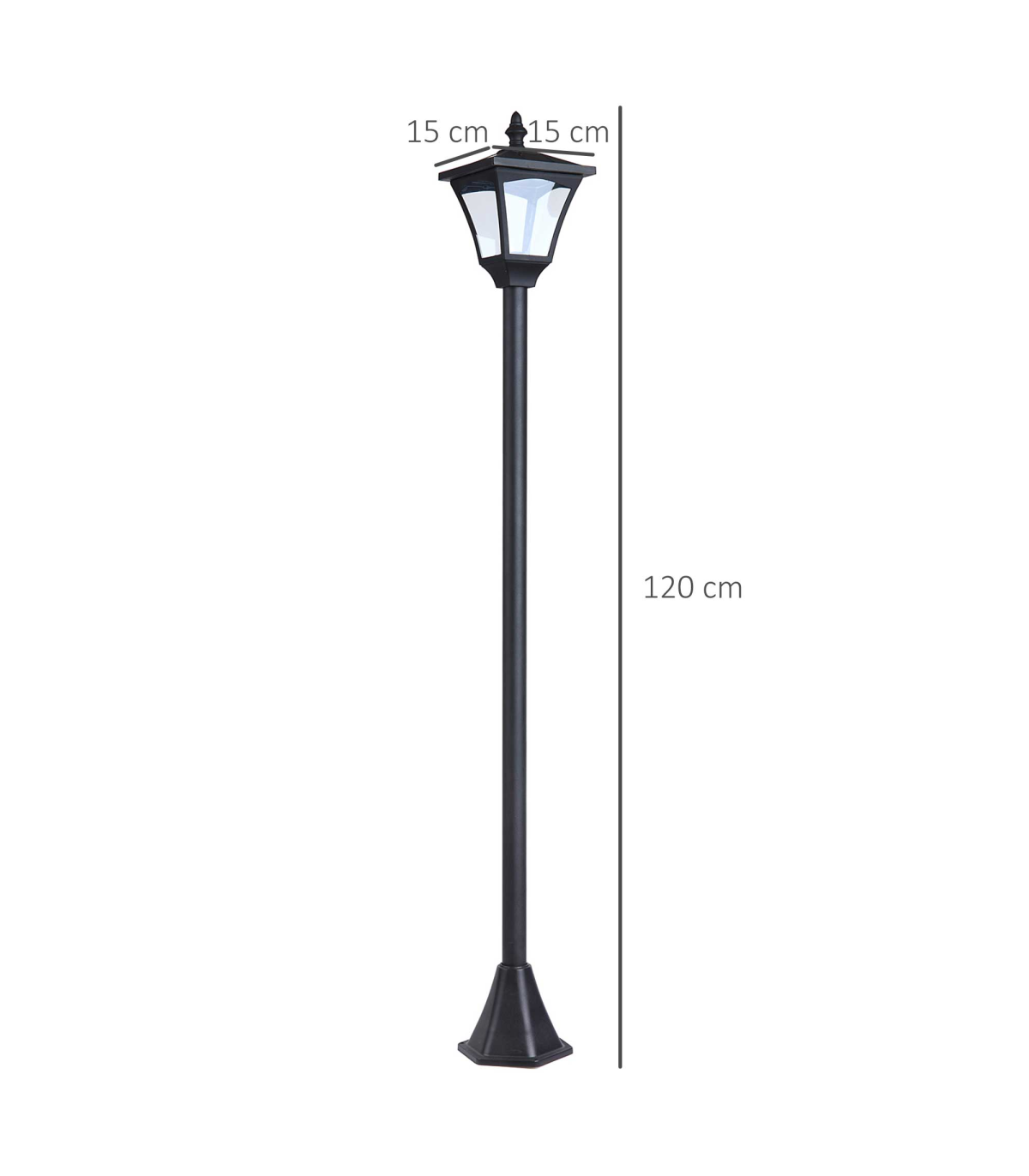 The stylish outdoor solar light post lamp from Outsunny features removable LED light and automatic light sensor for convenient lighting in dark. 4 pieces of a-Si solar panels on the top, the energy-saving garden lamp can light up to 5-6 hours when fully charged. The water-resistant materials and the chic style make the solar light an ideal addition to your gardens, pathways,patios, decks, poolside and more.