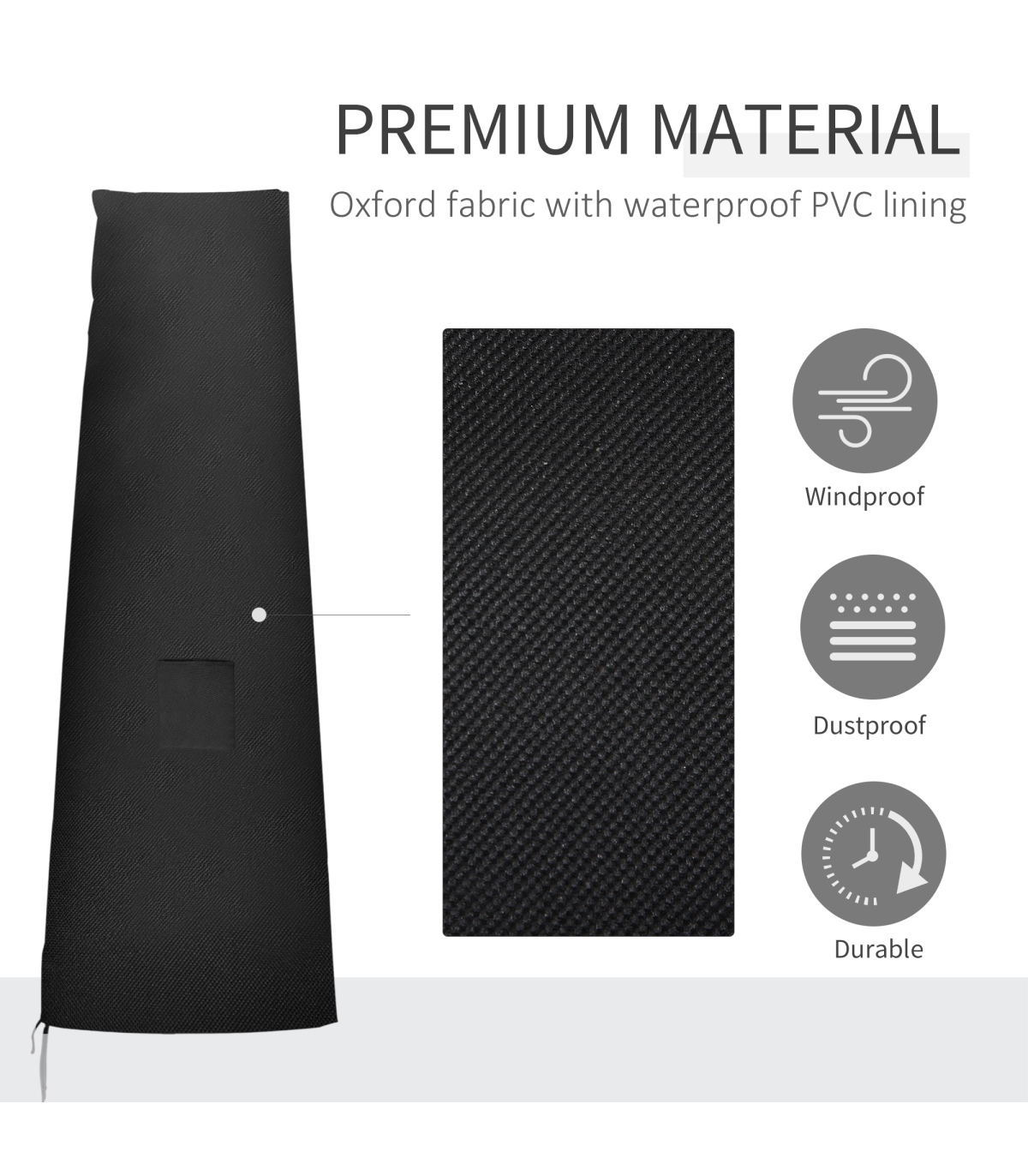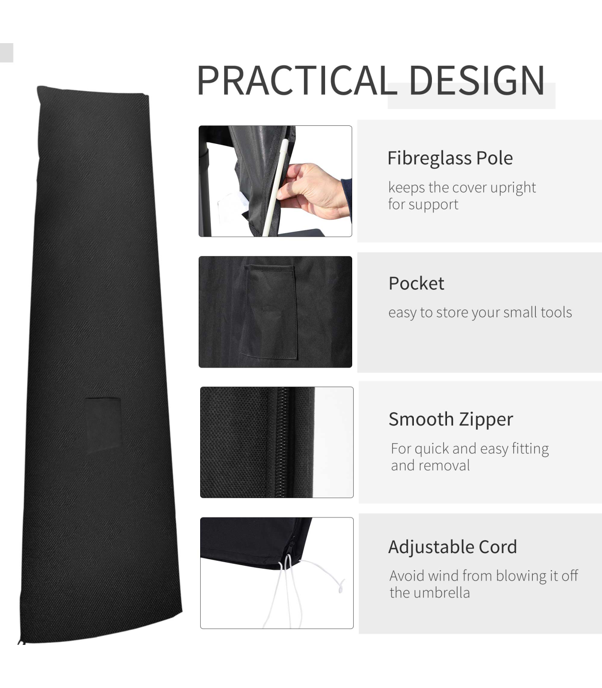 it's also resistant to mould and mildew build-up. Double stitched edges for extra protection and support, with cord locks on the bottom to keep it secure in strong winds. The fibreglass structure makes it keep in shape. An all-round winner.