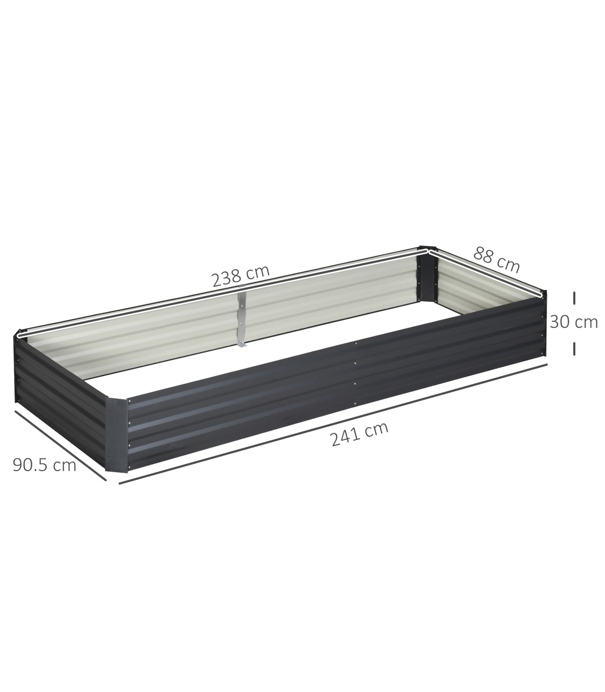 Raised garden bed made from galvanised steel: strong and rust-resistant 120 x 80cm/241L x 90.5cm size: choose what's best for you Open bottom for direct contact with soil. No water build-up For outdoor use: metal raised bed allows you to grow plants with a protective outer barrier Easy to assemble Colour: Grey Material: Galvanised Steel Overall Dimensions: (bigger) 30H x 241L x 90.5W cm, (smaller) 30H x 120L x 80W cm Interior Dimensions: (bigger) 30H x 238L x 88W cm, (smaller) 30H x 117L x 78.5W cm Item Label: 845-518GY