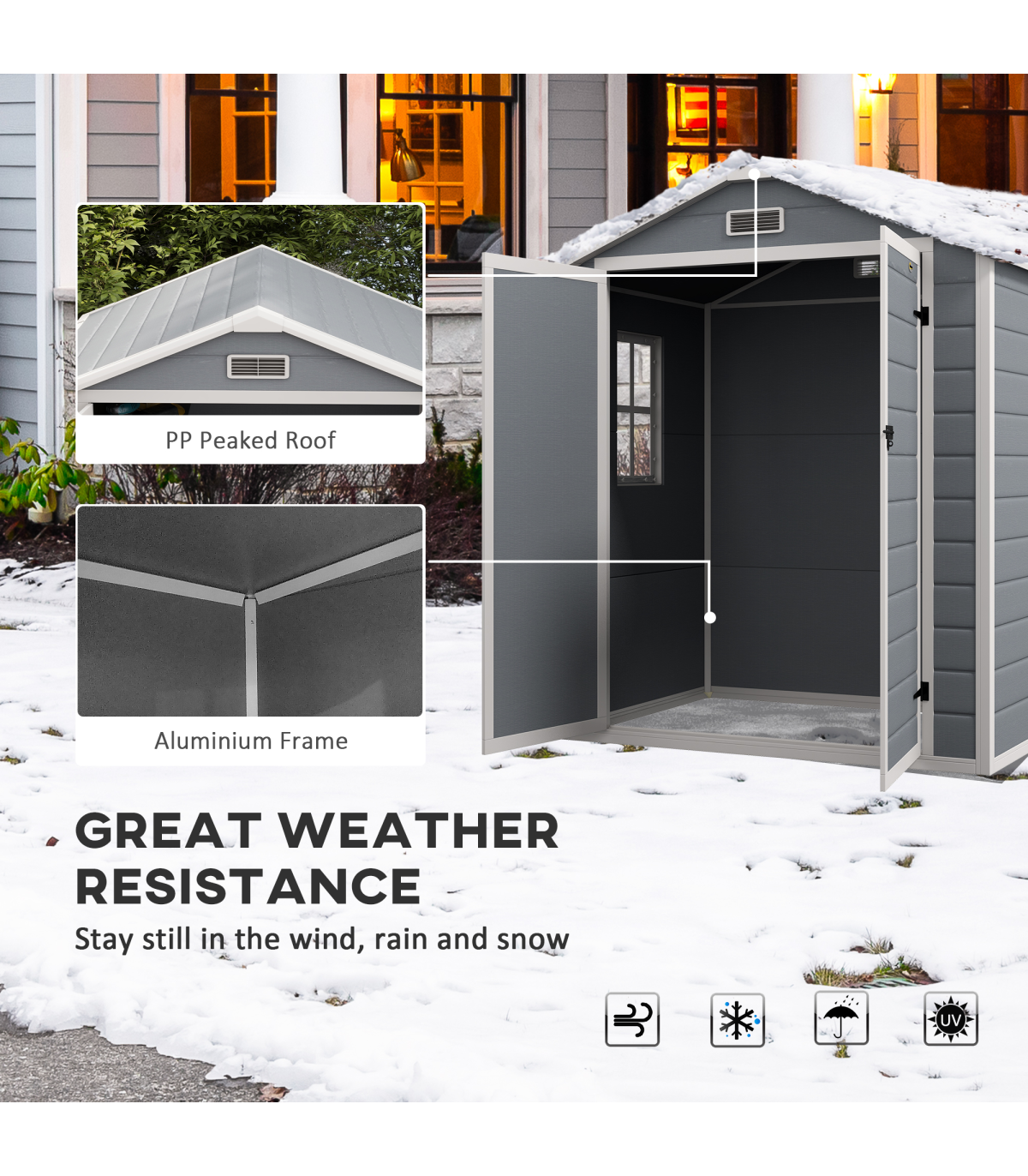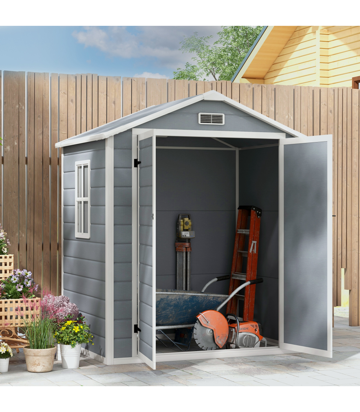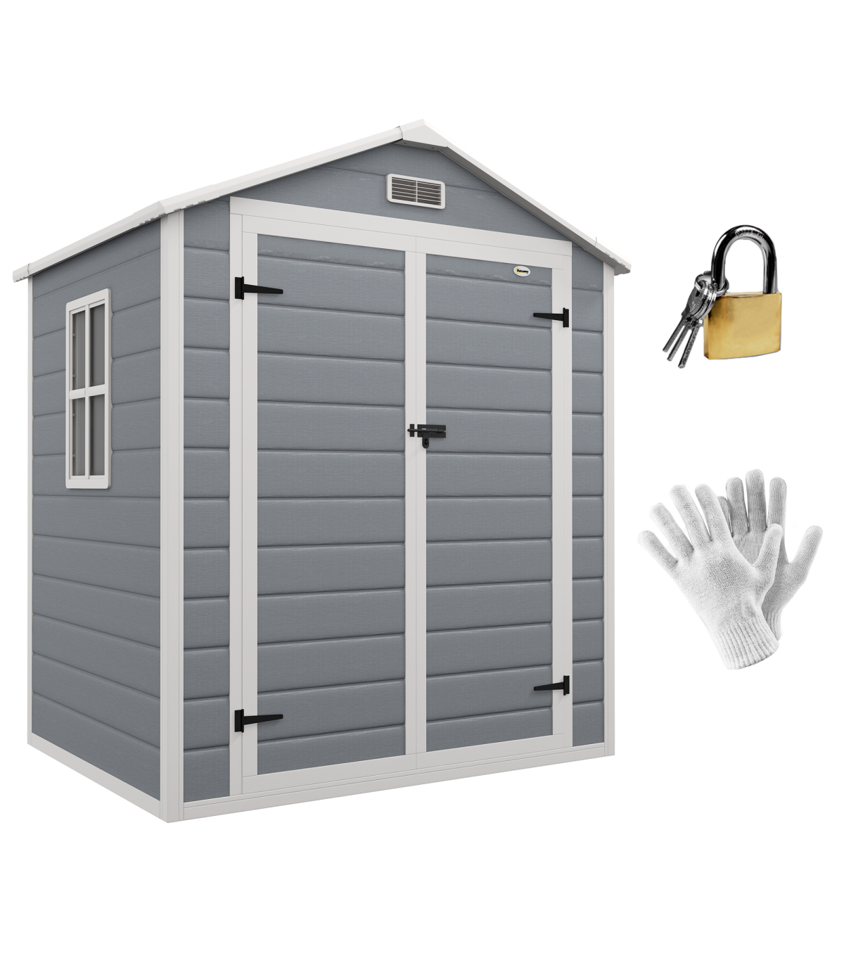 - "Outsunny Garden Shed 6'x4.5' Plastic Tool Storage House w/ Lockable Double Doors" - Description: - Works as a tool shed, a bike shed, a generator shed, or a lawn mower storage - Lock-on door for security, keys included - A ventilation window to keep inside dry and fresh, a clear window for good light transmission - Features double door to provide convenient access for entering and exiting. - Quality aluminium frame with PP roof can well resist UV and water - The peaked roof avoids water accumulation - Embossing treated surface brings extra beauty - Installation gloves included, 2-3 people are recommended - Colour: Grey - Material: Aluminium Alloy, PP - Overall Dimensions: 183W x 134D x 210Hcm - Eave Height: 173cm - Internal Size: 163W x 114Dcm - Floor Area: 171W x 124D cm, 2.12m² - Door Dimensions: 62W x 172Hcm - Vent Dimensions: 22.5W x 9Hcm - Clear Window Dimension: 38.5W x 62.5Hcm - Snow Rating: 40kg/m² - Item Label: 845-953V00GY
