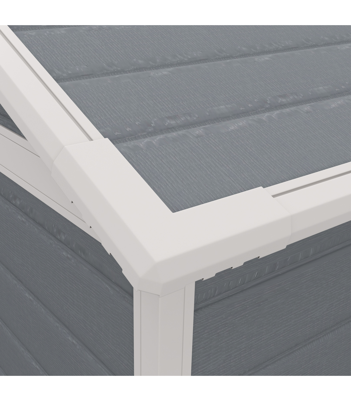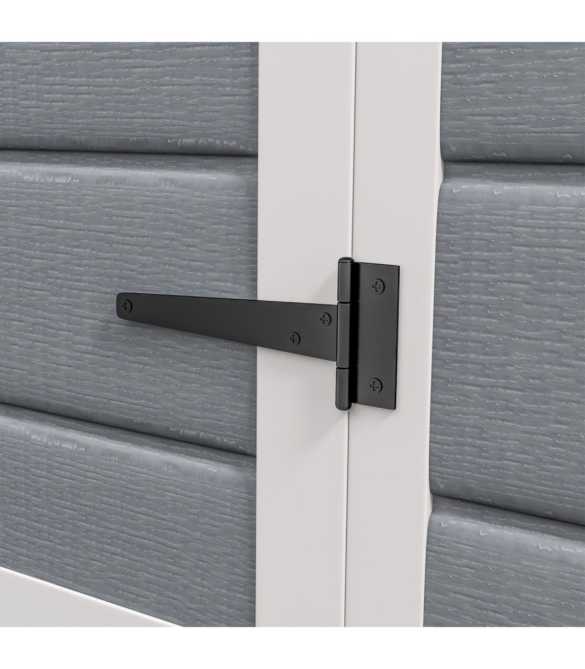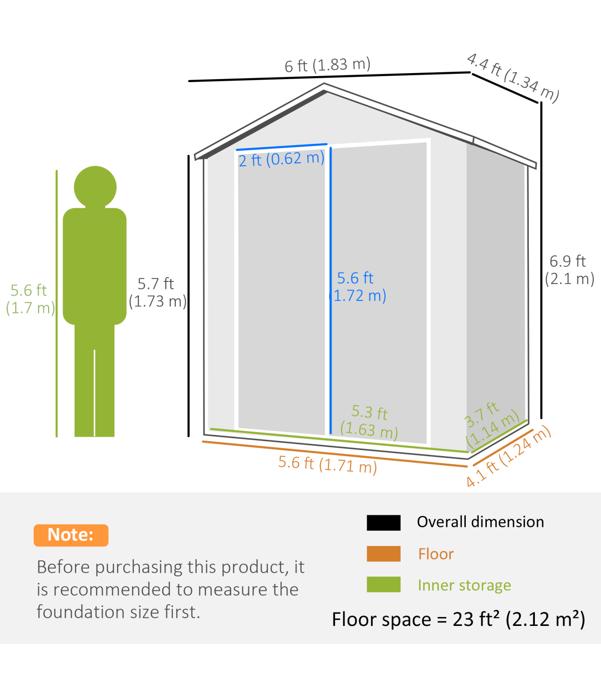 - "Outsunny Garden Shed 6'x4.5' Plastic Tool Storage House w/ Lockable Double Doors" - Description: - Works as a tool shed, a bike shed, a generator shed, or a lawn mower storage - Lock-on door for security, keys included - A ventilation window to keep inside dry and fresh, a clear window for good light transmission - Features double door to provide convenient access for entering and exiting. - Quality aluminium frame with PP roof can well resist UV and water - The peaked roof avoids water accumulation - Embossing treated surface brings extra beauty - Installation gloves included, 2-3 people are recommended - Colour: Grey - Material: Aluminium Alloy, PP - Overall Dimensions: 183W x 134D x 210Hcm - Eave Height: 173cm - Internal Size: 163W x 114Dcm - Floor Area: 171W x 124D cm, 2.12m² - Door Dimensions: 62W x 172Hcm - Vent Dimensions: 22.5W x 9Hcm - Clear Window Dimension: 38.5W x 62.5Hcm - Snow Rating: 40kg/m² - Item Label: 845-953V00GY